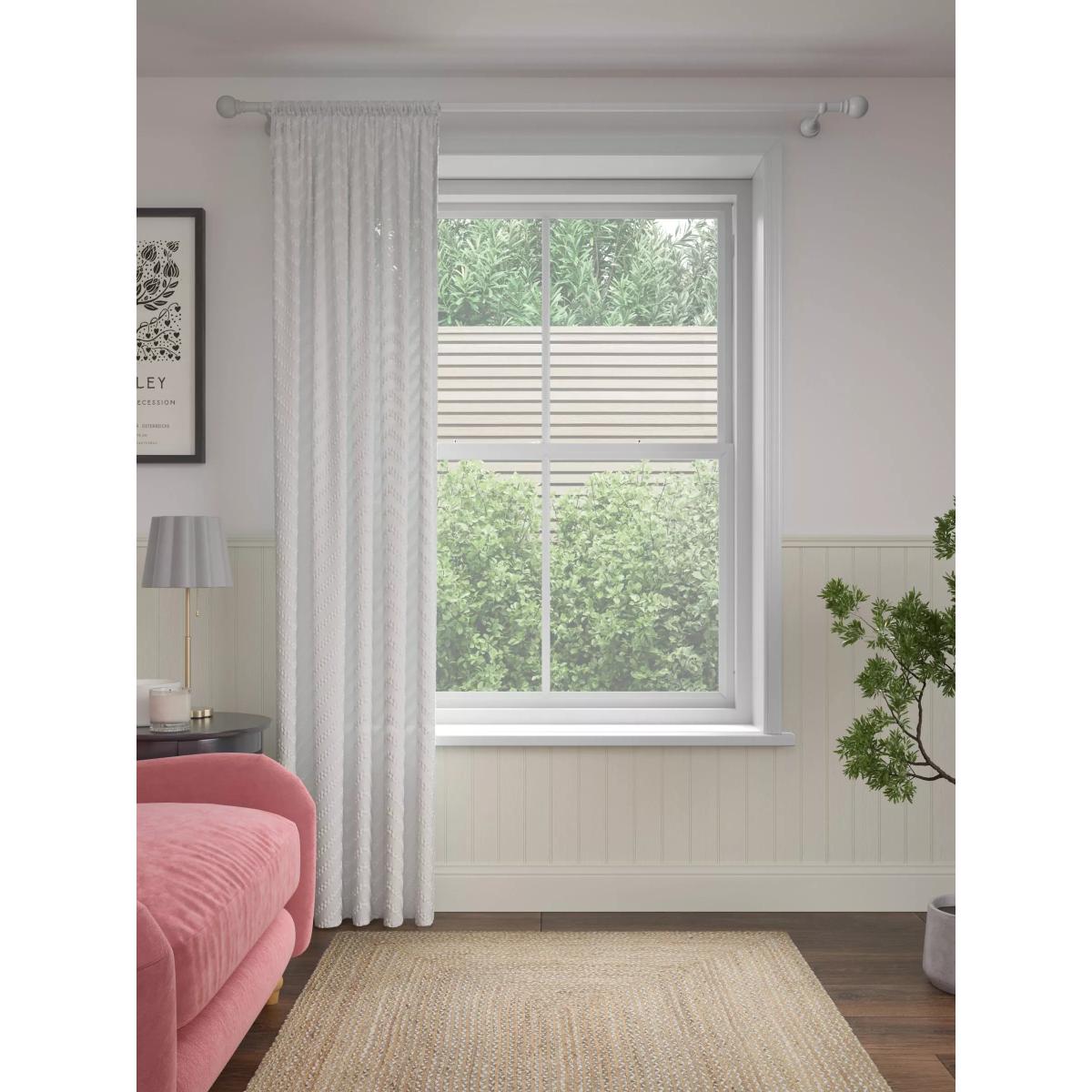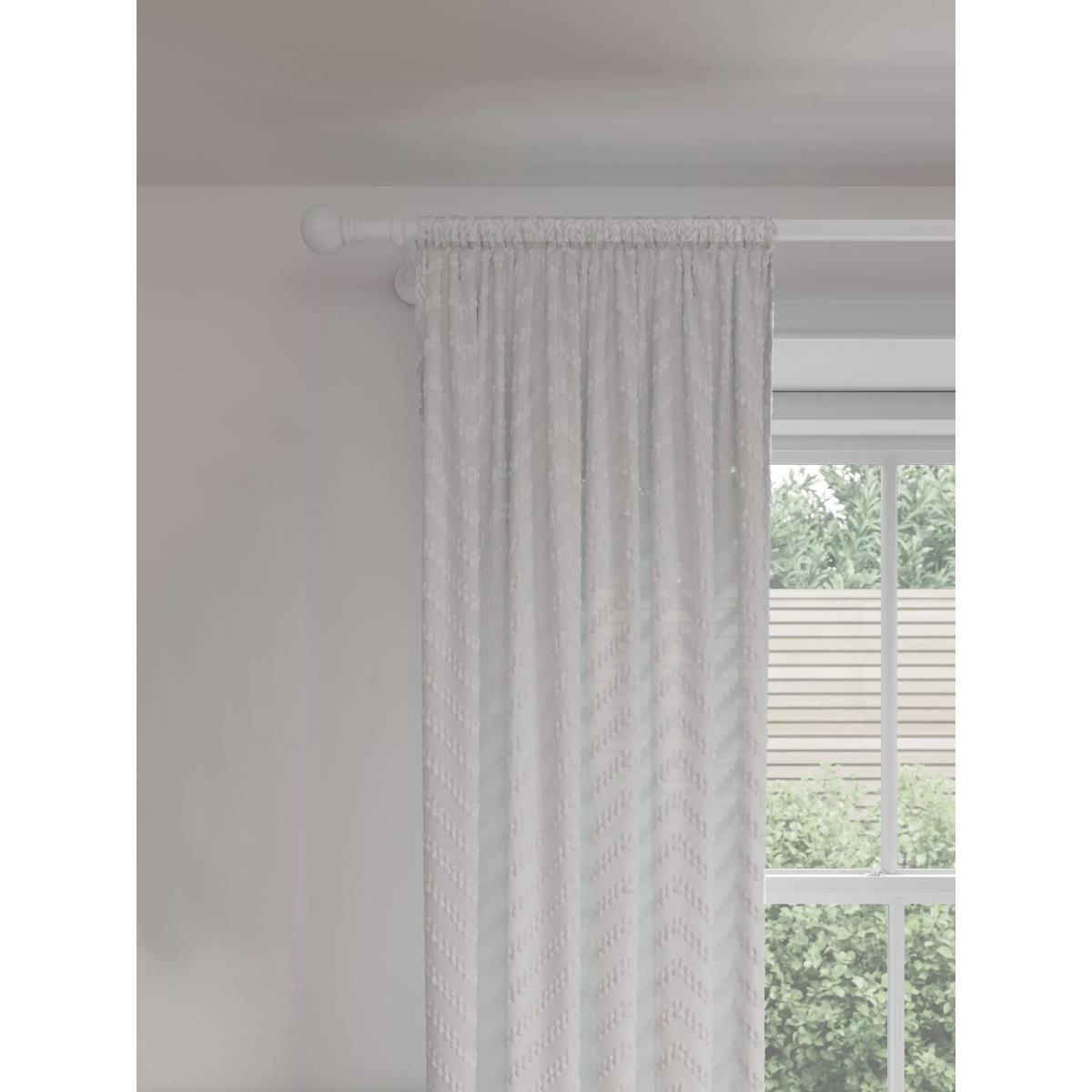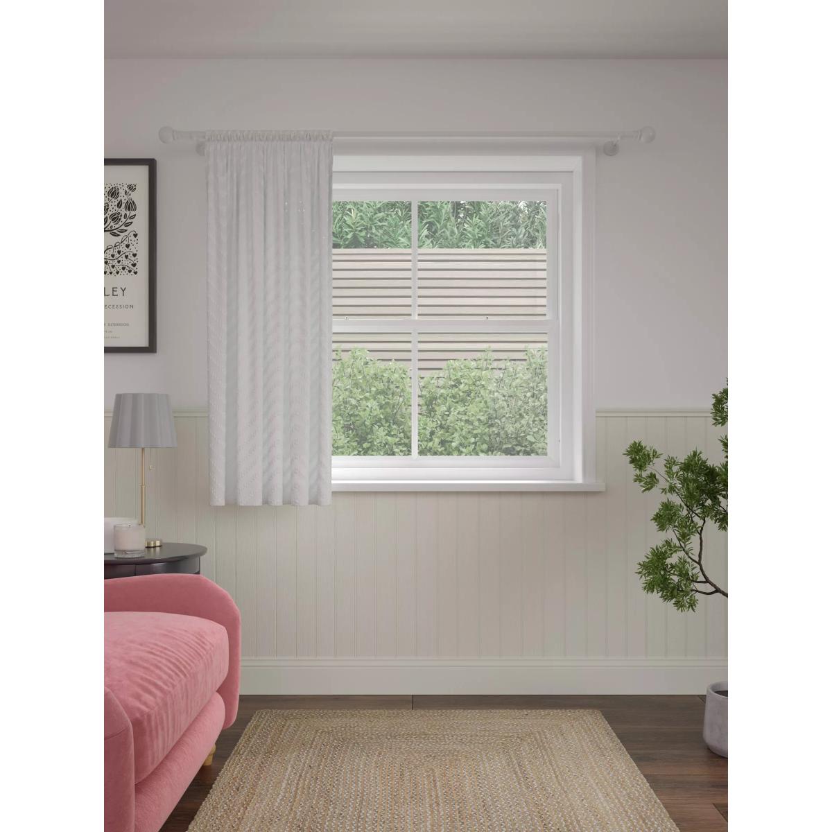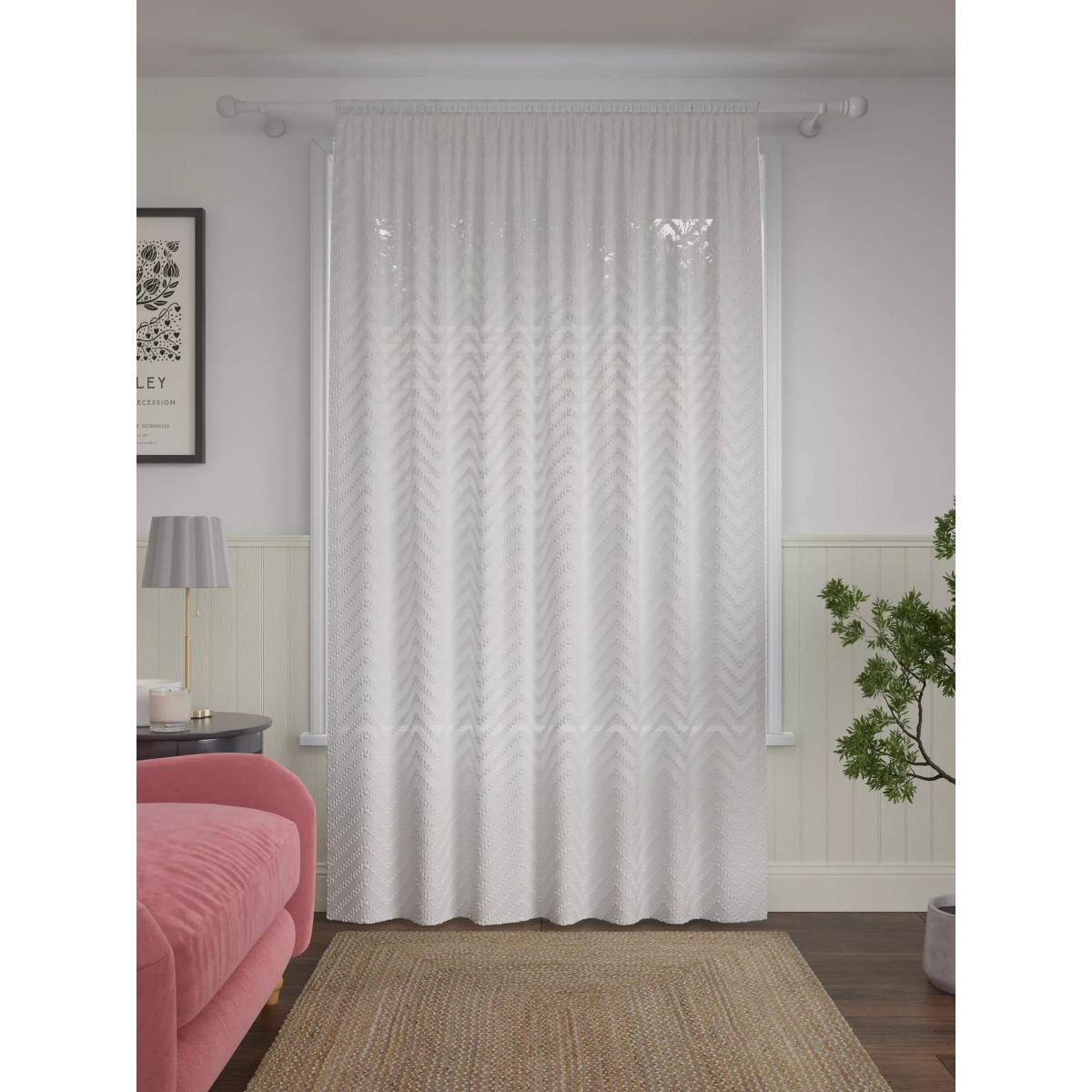 I love this curtain because of its clean, modern aesthetic combined with subtle texture. The tufted geometric voile adds visual interest without overwhelming a space, making it ideal for contemporary or minimalist interiors. It works particularly well in living rooms or bedrooms where you want to maintain a light, airy feel while adding a touch of pattern. Practical styling tips include pairing it with fully lined curtains in a complementary colour for privacy and insulation, or using it alone for a breezy, day-time look in sunnier rooms. Its whitespace and geometric detailing also make it versatile enough to suit both neutral palettes and more colourful schemes, offering a polished yet understated finish.