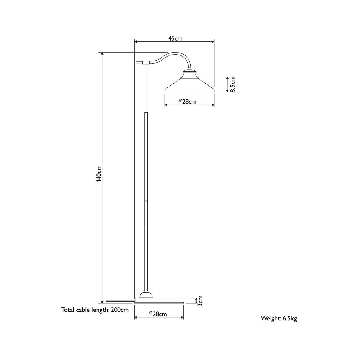 Hints of Parisian café chic, Tula combines refined glass forms and classically detailed metalwork. This floor lamp is designed with an elegant goose neck arm and offers a bold, evenly lit glass shade. Finished with a fabric braided cable and inline switch.