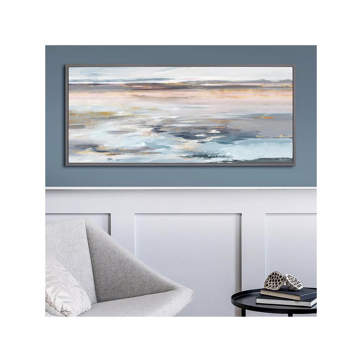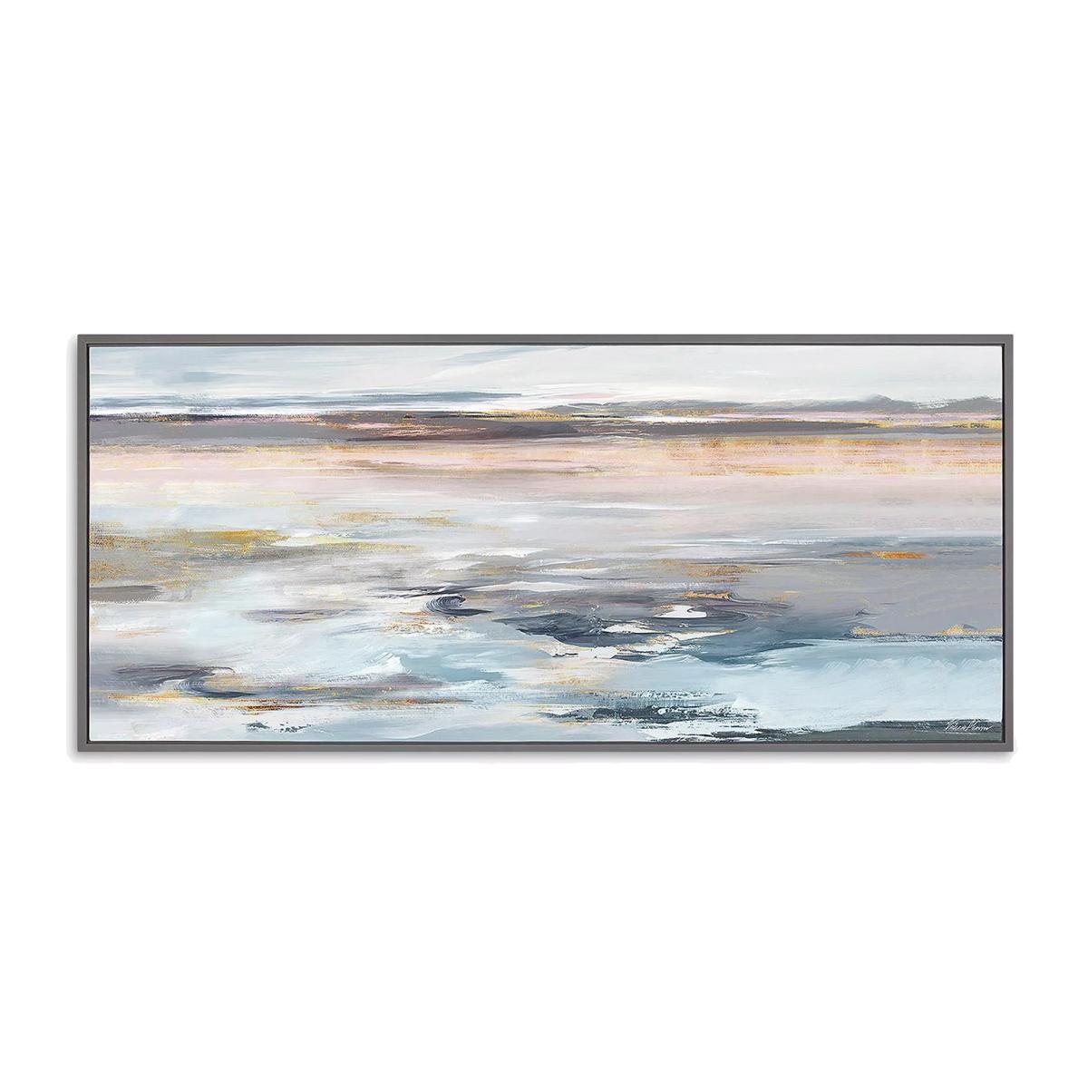 Aptly named canvas by Valeria Mravyan that somehow captures that ineffable point where the sunset sky meets the sea, with its muted hues of grey and blue shot through with vivid streaks of orange light. Made in the UK, it's printed on canvas and framed, ready to hang on your wall. Artist Valeria Mravyan has become finely attuned to the ever-changing regional light, nature, and the seasons in her native Canada. Mravyan says: "It's very important for me to express the feeling of an autumn afternoon or a peaceful, cold winter day." While her gently abstracted paintings may depict a tree, a figure, or a house, these familiar motifs are rendered otherworldly by mysterious atmospheric effects. Like theatrical backdrops or scrims, her pictures convey what she describes as, "the illusion of something that is there, but not there.” Capturing the mutability of light and weather over the course of a day, her impressions of fresh clear morning light can segue into a golden, muted late-afternoon glow over burnished trees, sometimes before our eyes. A wistful air imbues certain scenes, especially those that are misty or clouded. Mravyan's vision of the urban fabric is similarly romantic and harmonious. Her compositions feature softly angular forms and stylized buildings or landscapes built up from patches of colour. For example, her cityscapes feature mist-enshrouded ghostly high rises painted by scraping the pigment into ridged towers. Airily combining the middle ground and far distance, the artist presents multiple perspectives of the same vista. Exercising artistic license, the exteriors of structures are at times juxtaposed with their interiors. Like a waking dream; they meld places seen with places remembered. Have you thought about wall hooks and fittings?