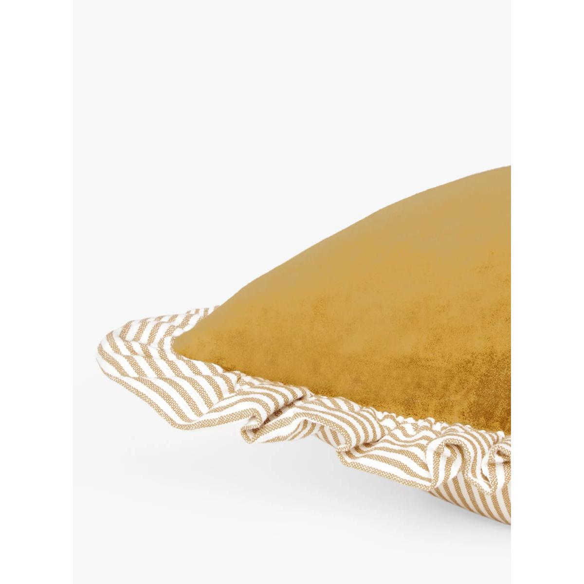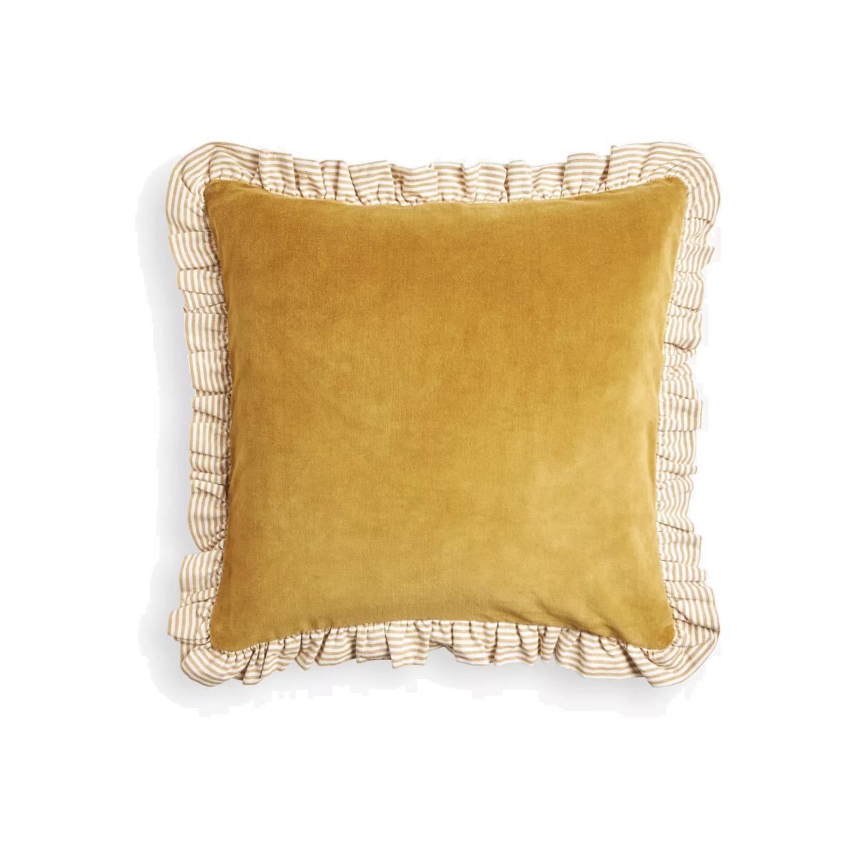 This velvet frill cushion will look just at home on a sofa, armchair or bed. Pretty and versatile, it reverses to a cotton stripe for an alternative look.