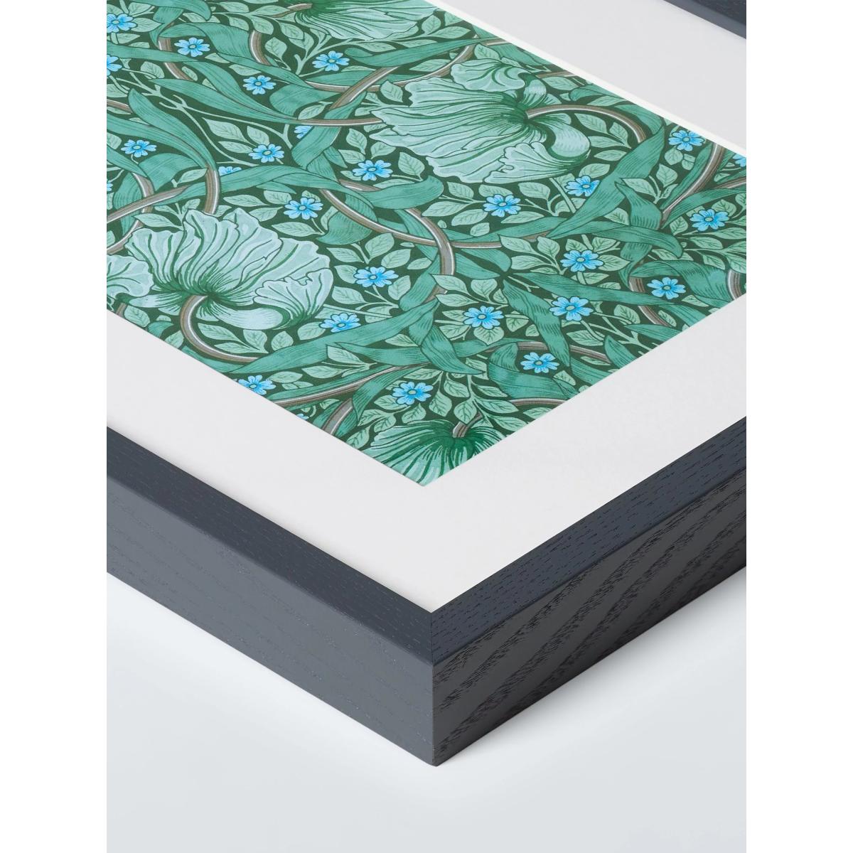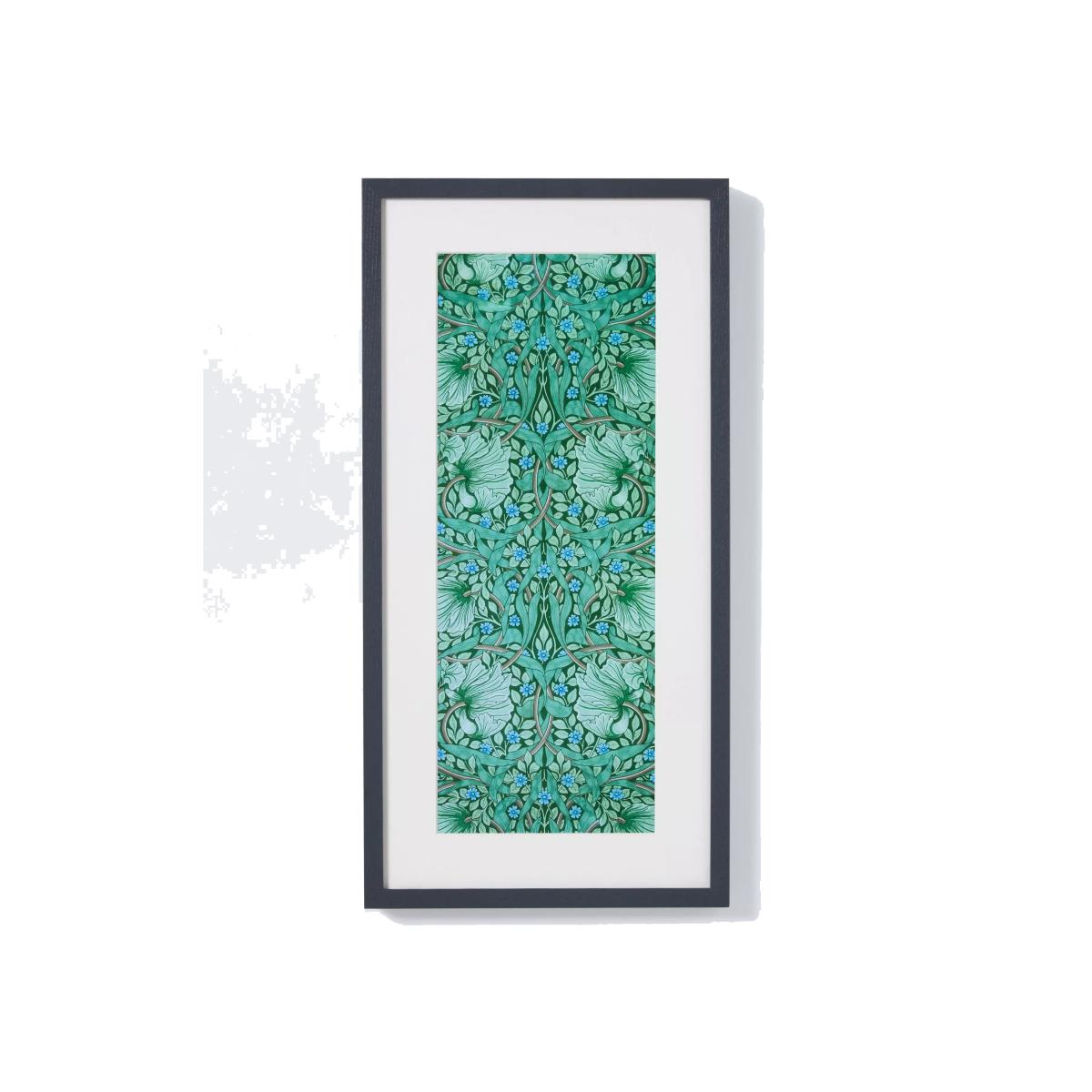 Block-printed wallpaper design by William Morris for Morris & Co. Licensed by The William Morris Gallery. Made in the UK, the print is glazed and presented in a solid, hand-stained ash wood frame, ready to hang on your wall. A key figure in the Arts & Crafts movement, William Morris designed the Pimpernel pattern in 1876, charting the tendrils which bowed in the wind, as seen through the intricate flowerheads and coils of the plant. The wallpaper was displayed in his own dining room at his Oxfordshire home, Kelmscott Manor. Have you thought about wall hooks and fittings?