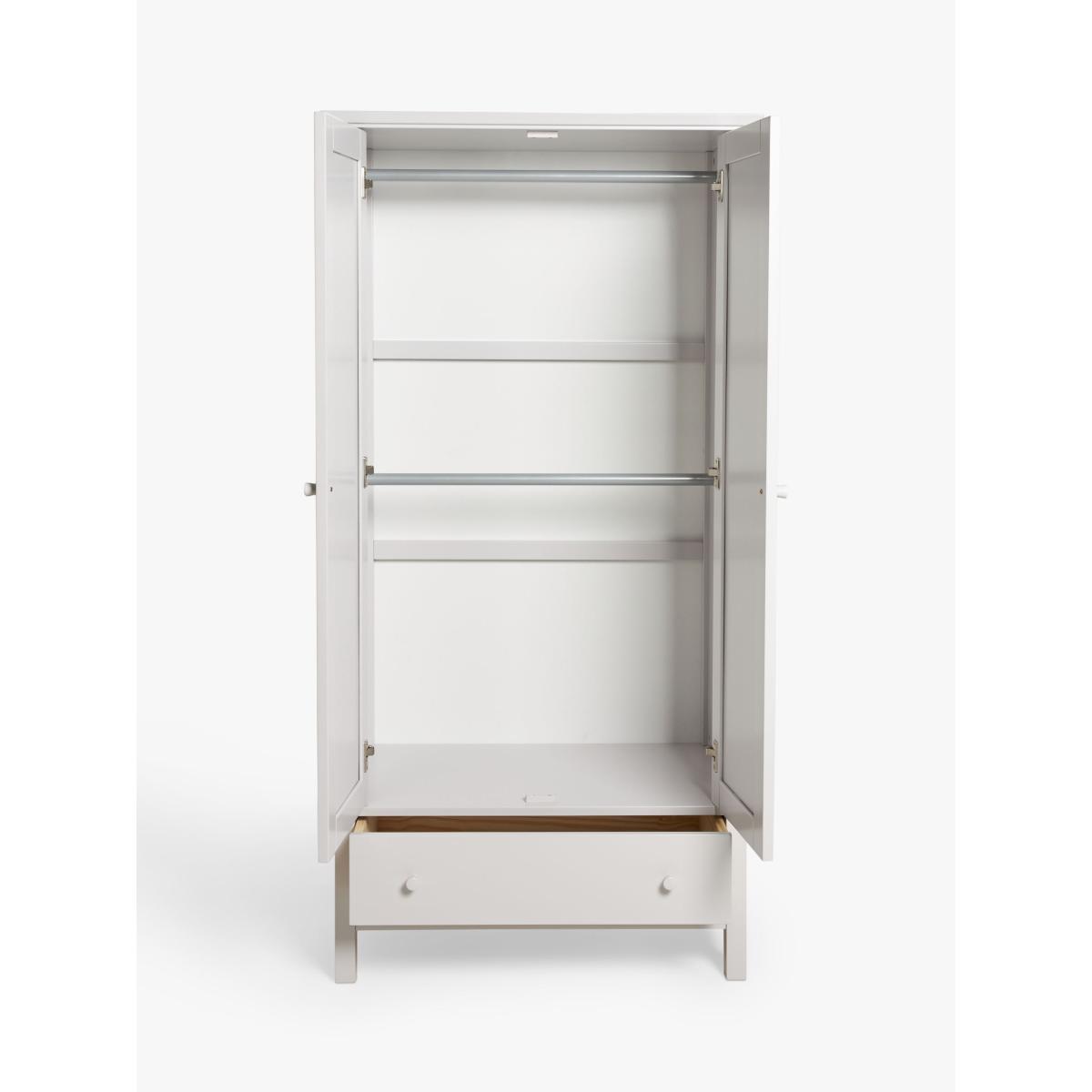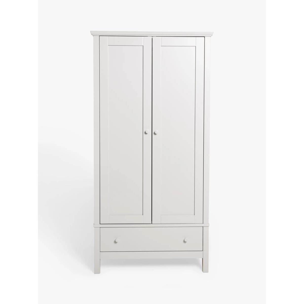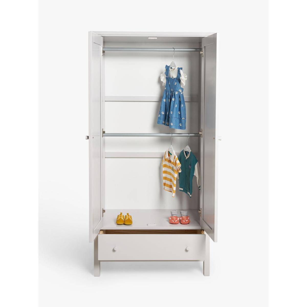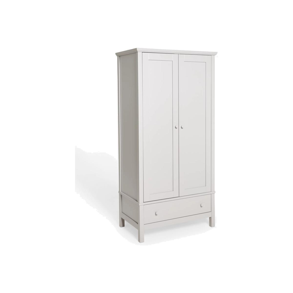 From our Wilton range, this wooden wardrobe makes a stylish and practical addition to any nursery. The double-door wardrobe boasts two hanging rails and one drawer for easy storage. Pair with other items in the Wilton range for a complete look.
