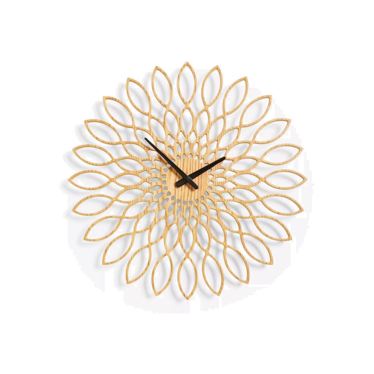 Inspired by flowers, this round wall clock has an intricate cut-out frame made of wood. Simple metal clock hands and an absence of hour markers keep the design minimalist and modern.