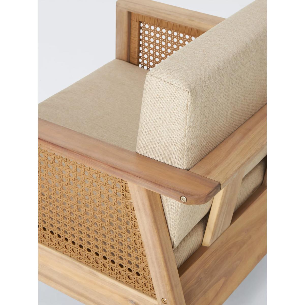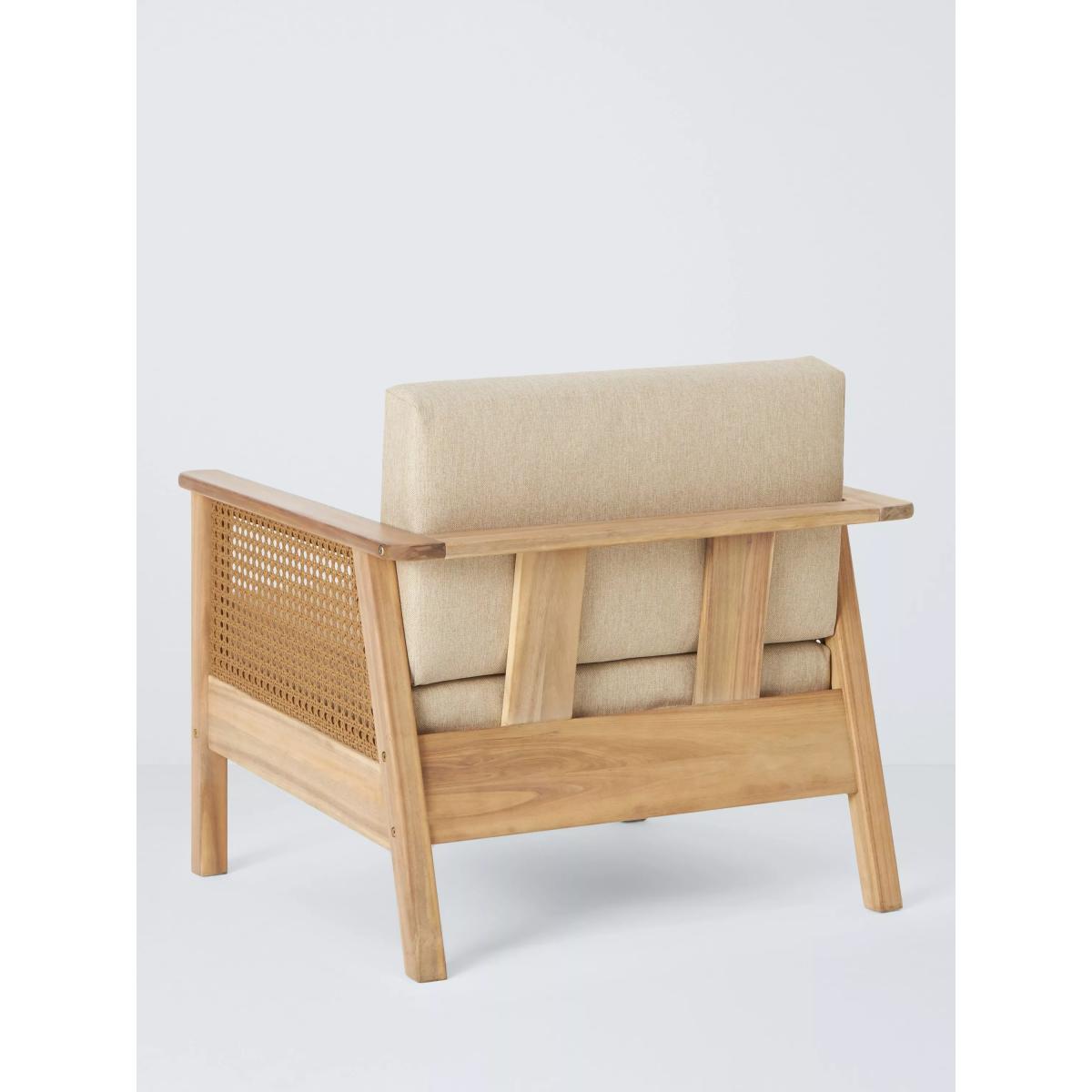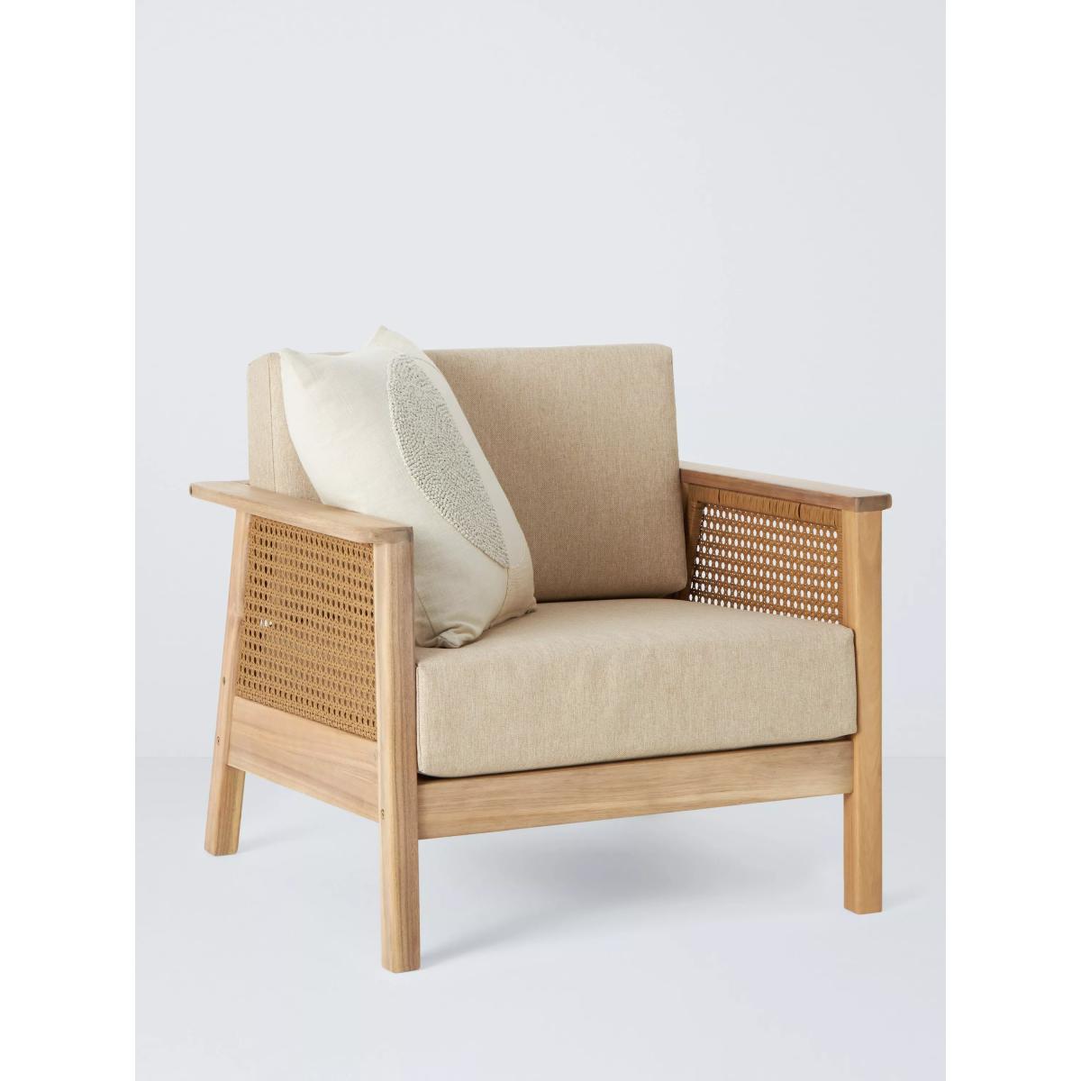 The rattan resurgence heads outside with this piece. Rattan adds texture and is less dense compared to solid wood furniture. The rattan panels on this garden lounge chair add to its mid-century look, updated with modern materials to create weather-resistant furniture. The armchair frame is made of naturally weather-resistant acacia wood. Plump seat and backrest cushions provide comfortable support and are shower-resistant. Key features: Garden lounge chair with rattan panels Naturally weather-resistant acacia wood frame Plump shower-resistant seat and backrest cushions Matches garden furniture in our Woven Rattan range Garden furniture care: To keep your outdoor furniture in the best condition, store it in a cool, dry, well-ventilated spot indoors over the winter. If it’s staying outside, use an outdoor furniture cover whenever the weather is wet or unseasonal. Make sure furniture is clean and dry before storing it away, and keep cushions in a clean and dry place when not in use. All our outdoor wooden furniture ranges are made from sustainably sourced, naturally weather-resistant tropical hardwoods. All our outdoor cushions are shower-resistant and our seating is rigorously weight-tested, ensuring stability and strength. Choose the perfect outdoor furniture We have a selection of wooden furniture for you to choose from which will suit the home or garden. Below are a few options to consider when choosing your perfect outdoor furniture. TeakA premium and popular wood with an attractive appearance which ages beautifully. Strong, durable and resistant to rot and decay, this furniture requires little maintenanceEucalyptusDistinctive scent and appearance which darkens as it ages. Provides similar natural benefits to teak including moisture resistance, hardness and durability. It's plentiful in supply which makes the furniture an inexpensive choice. AcaciaNaturally durable, this wood is incredibly hard and is unlikely to suffer damage during everyday use. It provides similar natural benefits to teak, yet unlike many other hardwoods, acacia is also relatively fast growing which minimises the environmental impact.
