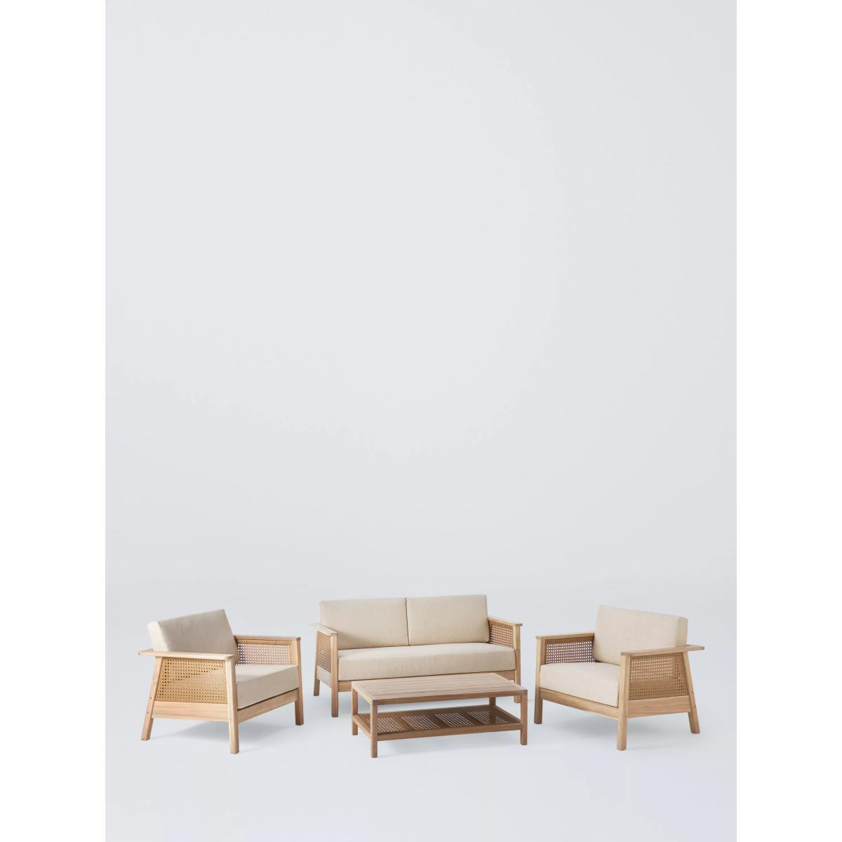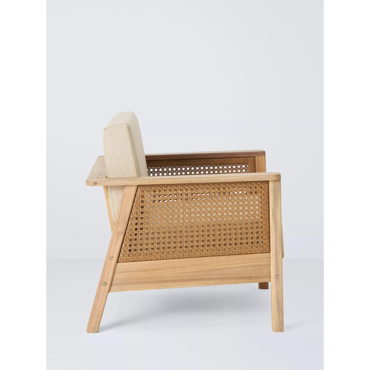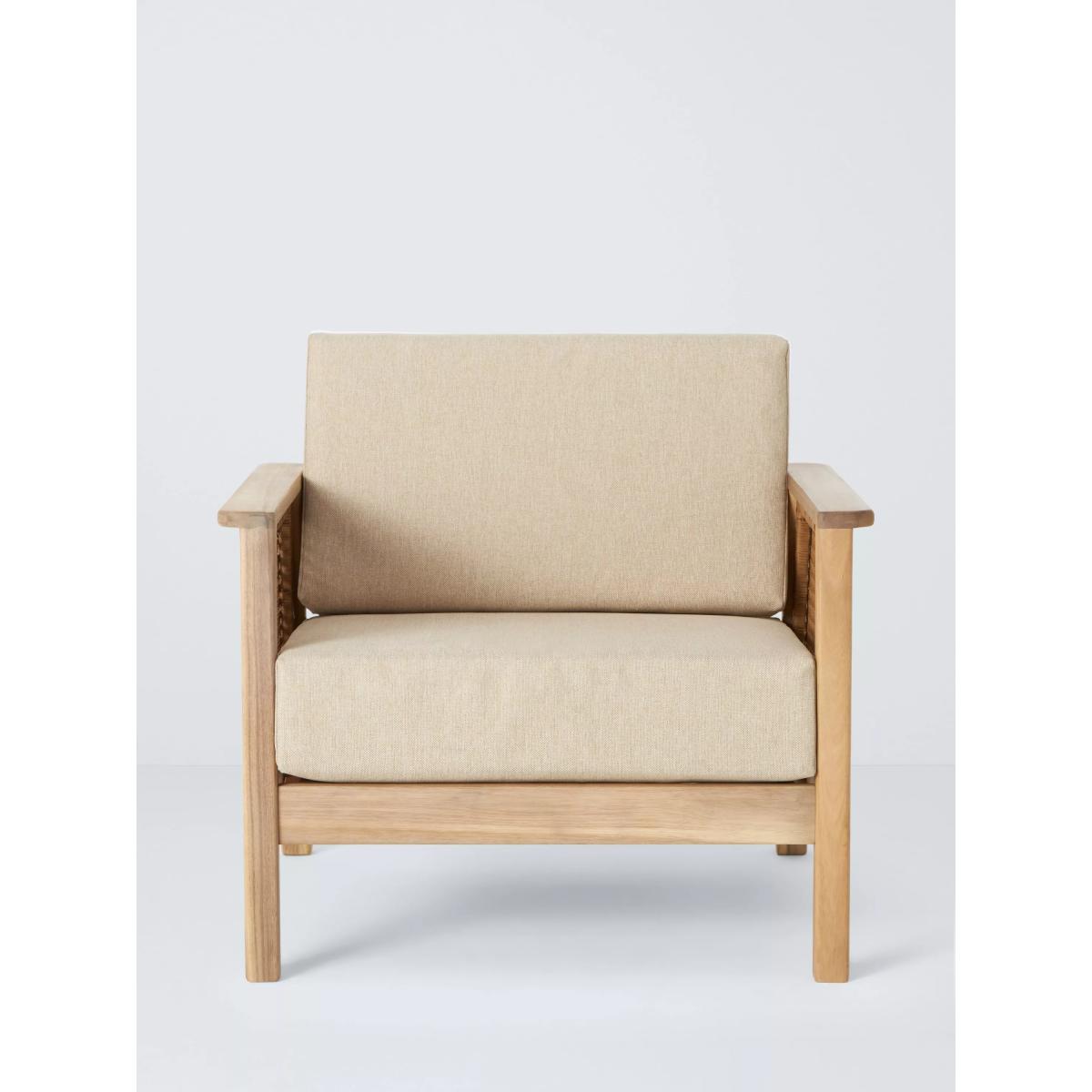 The rattan resurgence heads outside with this piece. Rattan adds texture and is less dense compared to solid wood furniture. The rattan panels on this garden lounge chair add to its mid-century look, updated with modern materials to create weather-resistant furniture. The armchair frame is made of naturally weather-resistant acacia wood. Plump seat and backrest cushions provide comfortable support and are shower-resistant. Key features: Garden lounge chair with rattan panels Naturally weather-resistant acacia wood frame Plump shower-resistant seat and backrest cushions Matches garden furniture in our Woven Rattan range Garden furniture care: To keep your outdoor furniture in the best condition, store it in a cool, dry, well-ventilated spot indoors over the winter. If it’s staying outside, use an outdoor furniture cover whenever the weather is wet or unseasonal. Make sure furniture is clean and dry before storing it away, and keep cushions in a clean and dry place when not in use. All our outdoor wooden furniture ranges are made from sustainably sourced, naturally weather-resistant tropical hardwoods. All our outdoor cushions are shower-resistant and our seating is rigorously weight-tested, ensuring stability and strength. Choose the perfect outdoor furniture We have a selection of wooden furniture for you to choose from which will suit the home or garden. Below are a few options to consider when choosing your perfect outdoor furniture. TeakA premium and popular wood with an attractive appearance which ages beautifully. Strong, durable and resistant to rot and decay, this furniture requires little maintenanceEucalyptusDistinctive scent and appearance which darkens as it ages. Provides similar natural benefits to teak including moisture resistance, hardness and durability. It's plentiful in supply which makes the furniture an inexpensive choice. AcaciaNaturally durable, this wood is incredibly hard and is unlikely to suffer damage during everyday use. It provides similar natural benefits to teak, yet unlike many other hardwoods, acacia is also relatively fast growing which minimises the environmental impact.