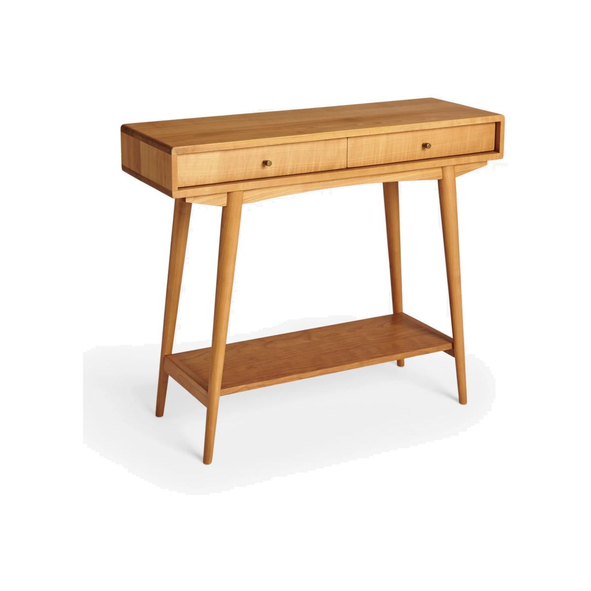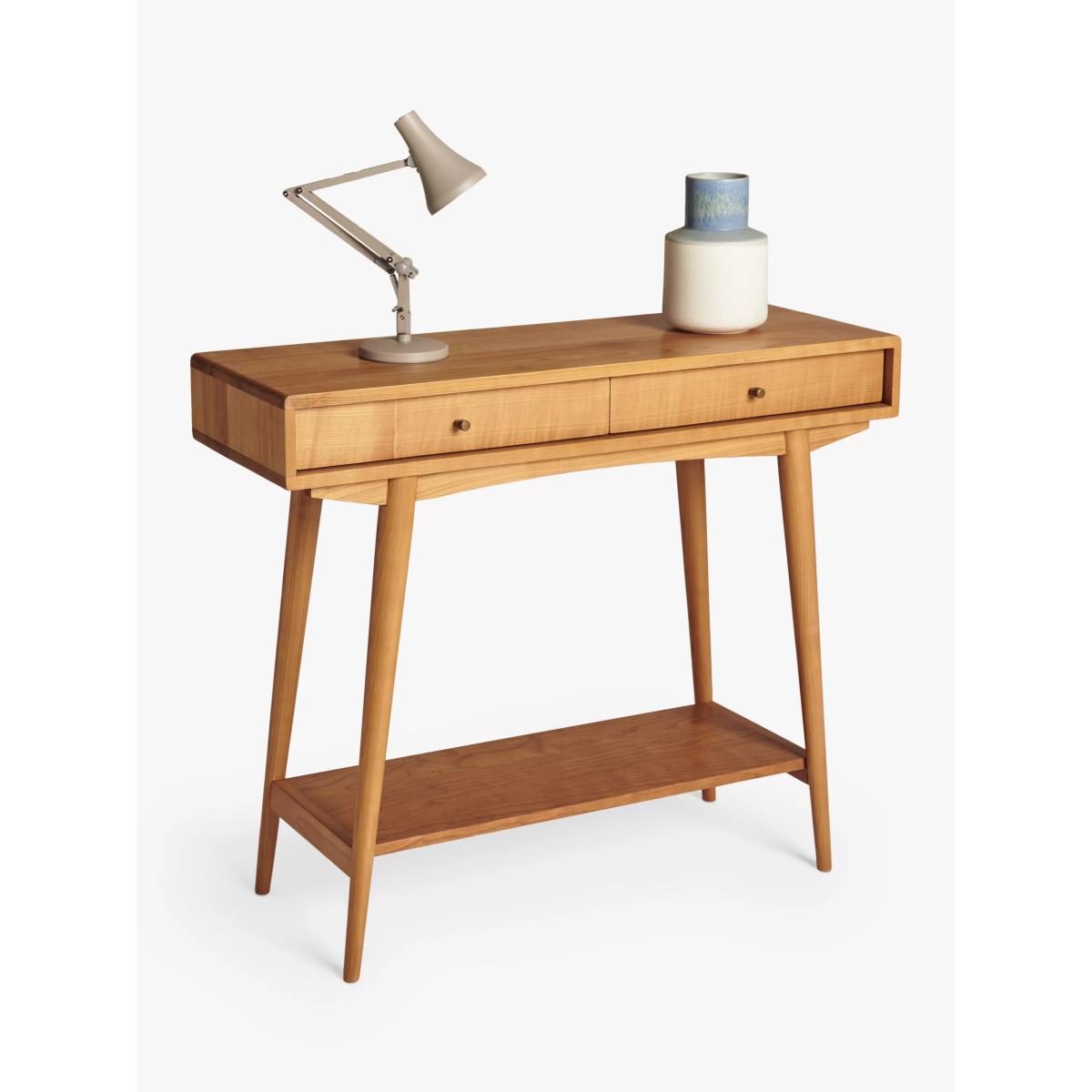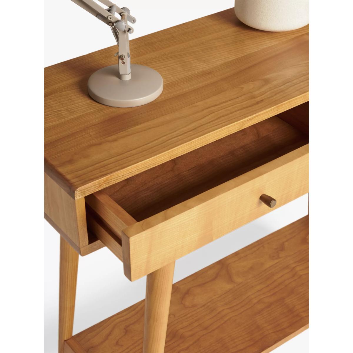 Inspired by and named after High Wycombe, the home of British furniture making, this console table is made from lacquered FSC cherry wood which has a naturally warm and distinct colour and tactility. Celebrating British mid-century furniture design, it features retro detailing with soft edges and angled, spindle legs. Two drawers and a bottom shelf give you plenty of storage space to keep your living room or hallway neat and clear of clutter. Want to see it first? You may want to see and get a feel for the furniture in one of our shops before ordering. We'll be able to tell you where the range you'd like to view is on display.