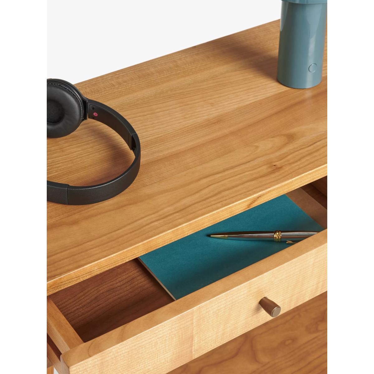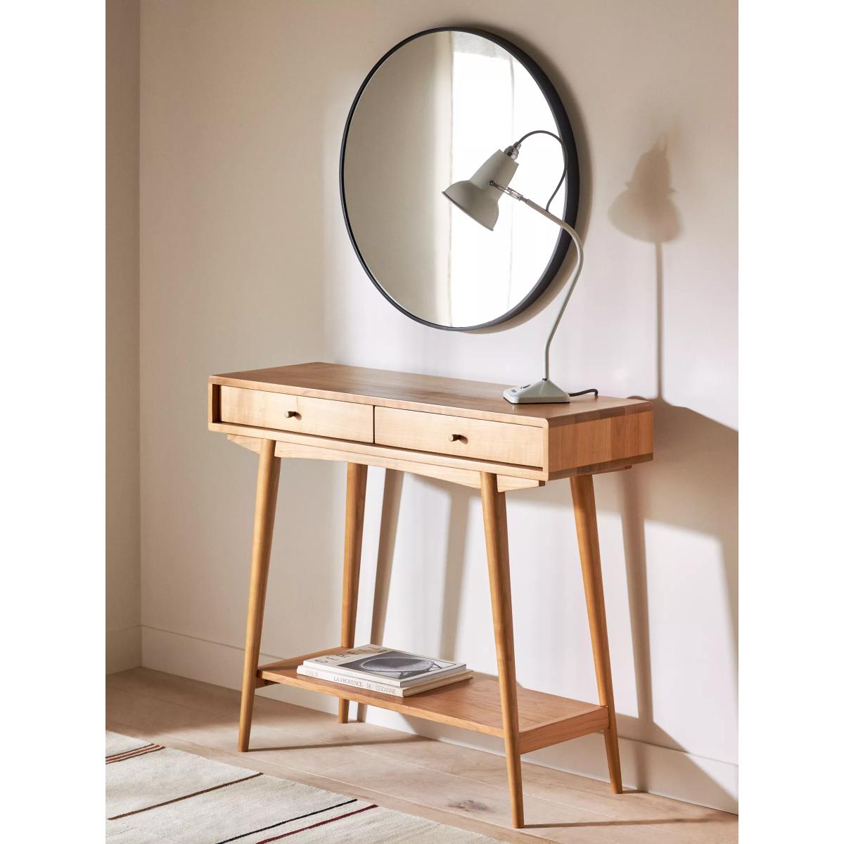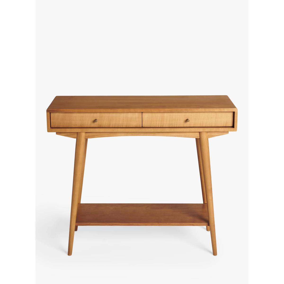 Inspired by and named after High Wycombe, the home of British furniture making, this console table is made from lacquered FSC cherry wood which has a naturally warm and distinct colour and tactility. Celebrating British mid-century furniture design, it features retro detailing with soft edges and angled, spindle legs. Two drawers and a bottom shelf give you plenty of storage space to keep your living room or hallway neat and clear of clutter. Want to see it first? You may want to see and get a feel for the furniture in one of our shops before ordering. We'll be able to tell you where the range you'd like to view is on display.