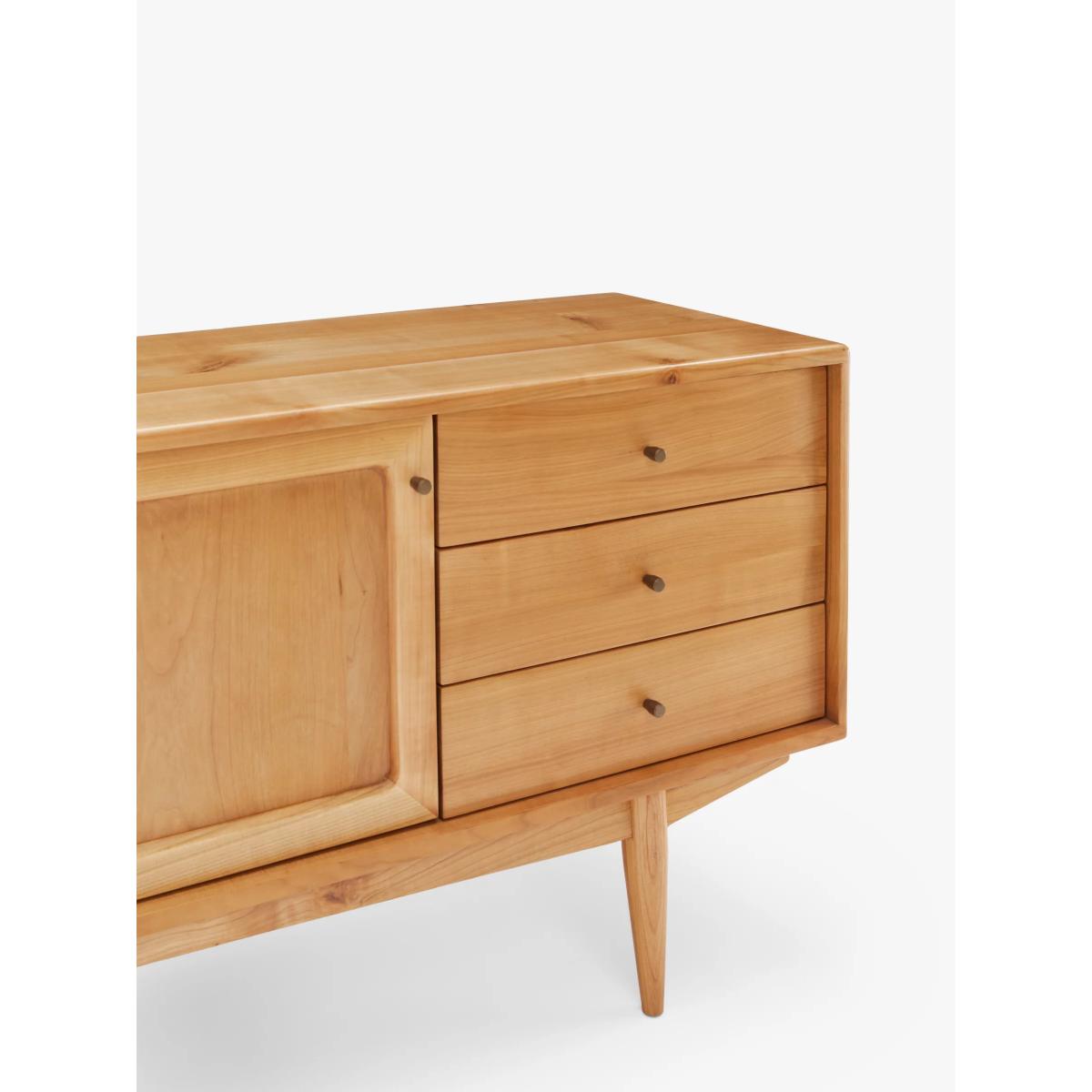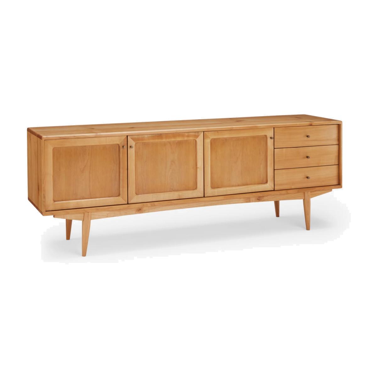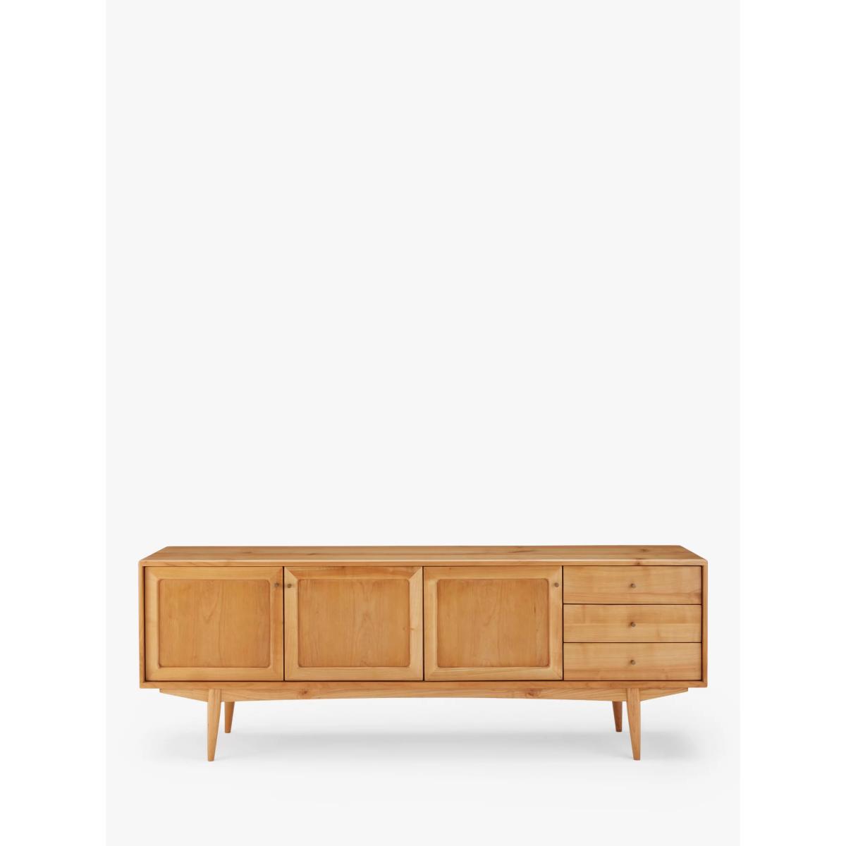 Inspired by and named after High Wycombe, the home of British furniture making, this sideboard is made from lacquered cherry wood which has a naturally warm and distinct colour and tactility. Celebrating British mid-century furniture design, it features retro detailing with soft edges and angled, spindle legs. Each door opens to a separate section with an adjustable shelf and a cable hole at the back. Three left-hand drawers give you space to store all your accessories such as cables, chargers and remote controls. Want to see it first? You may want to see and get a feel for the furniture in one of our shops before ordering. We'll be able to tell you where the range you'd like to view is on display.