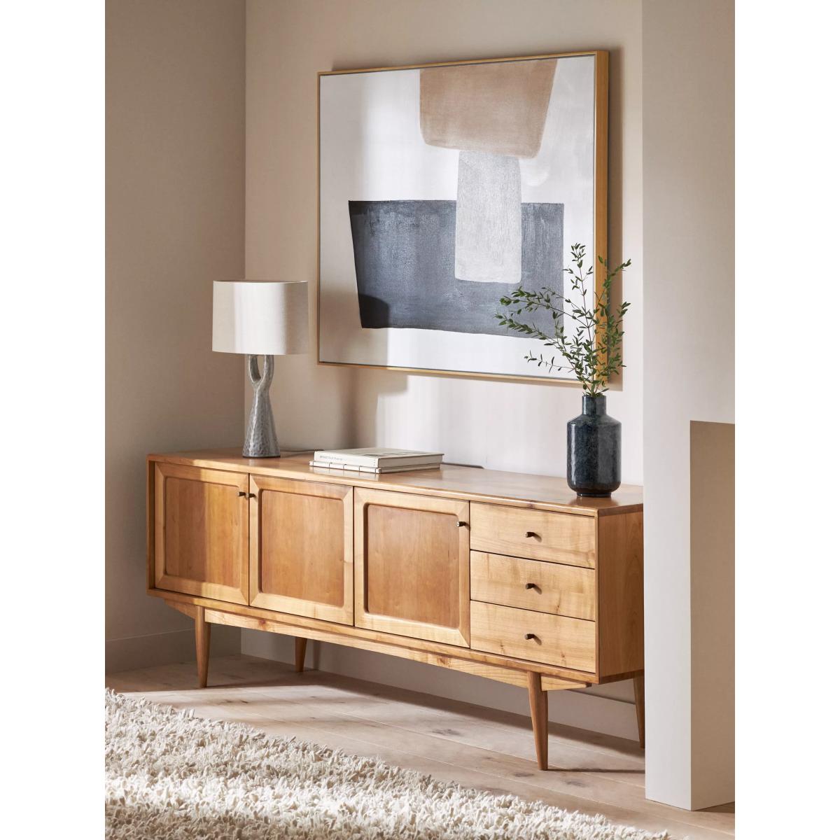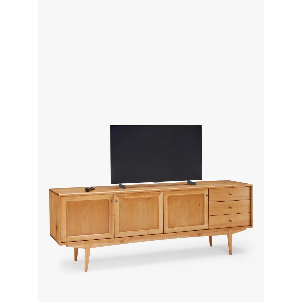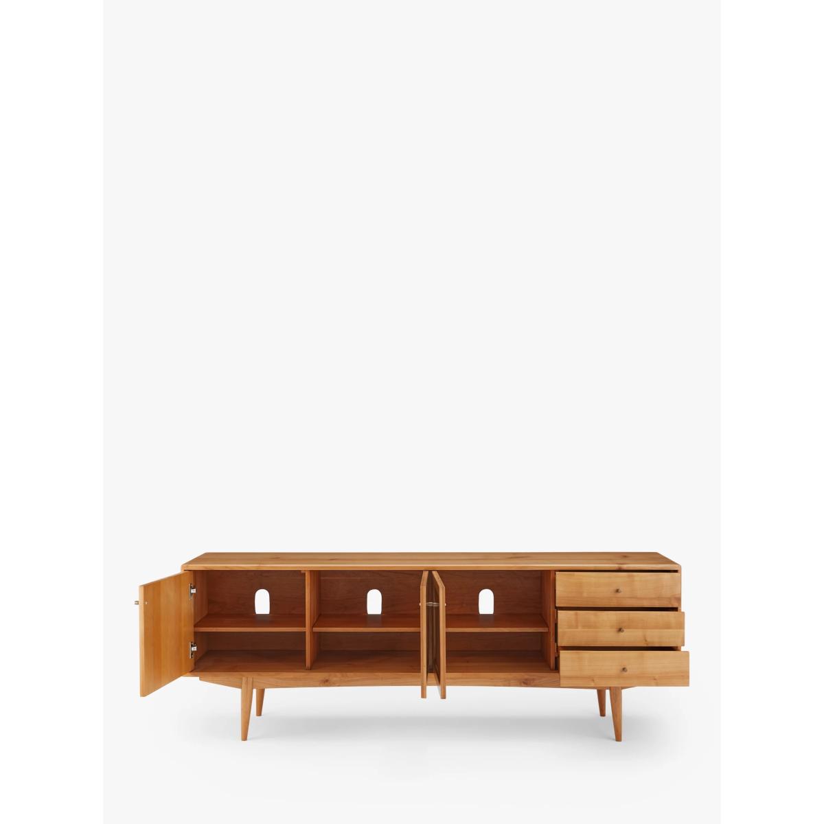 Inspired by and named after High Wycombe, the home of British furniture making, this sideboard is made from lacquered cherry wood which has a naturally warm and distinct colour and tactility. Celebrating British mid-century furniture design, it features retro detailing with soft edges and angled, spindle legs. Each door opens to a separate section with an adjustable shelf and a cable hole at the back. Three left-hand drawers give you space to store all your accessories such as cables, chargers and remote controls. Want to see it first? You may want to see and get a feel for the furniture in one of our shops before ordering. We'll be able to tell you where the range you'd like to view is on display.