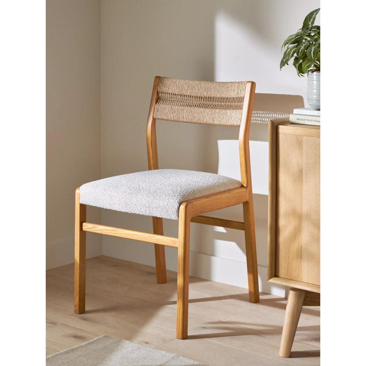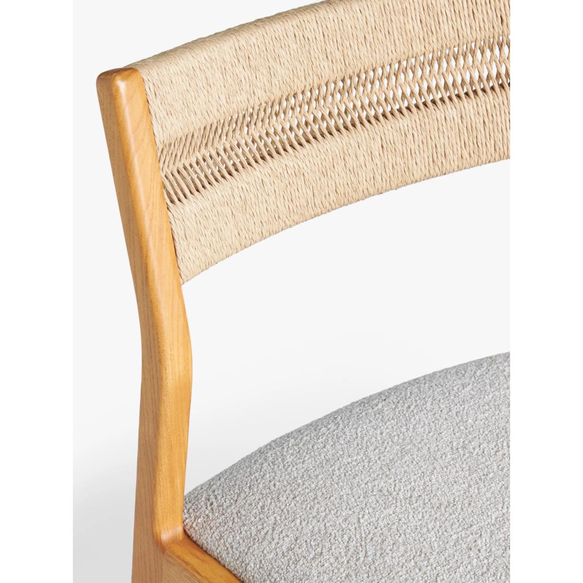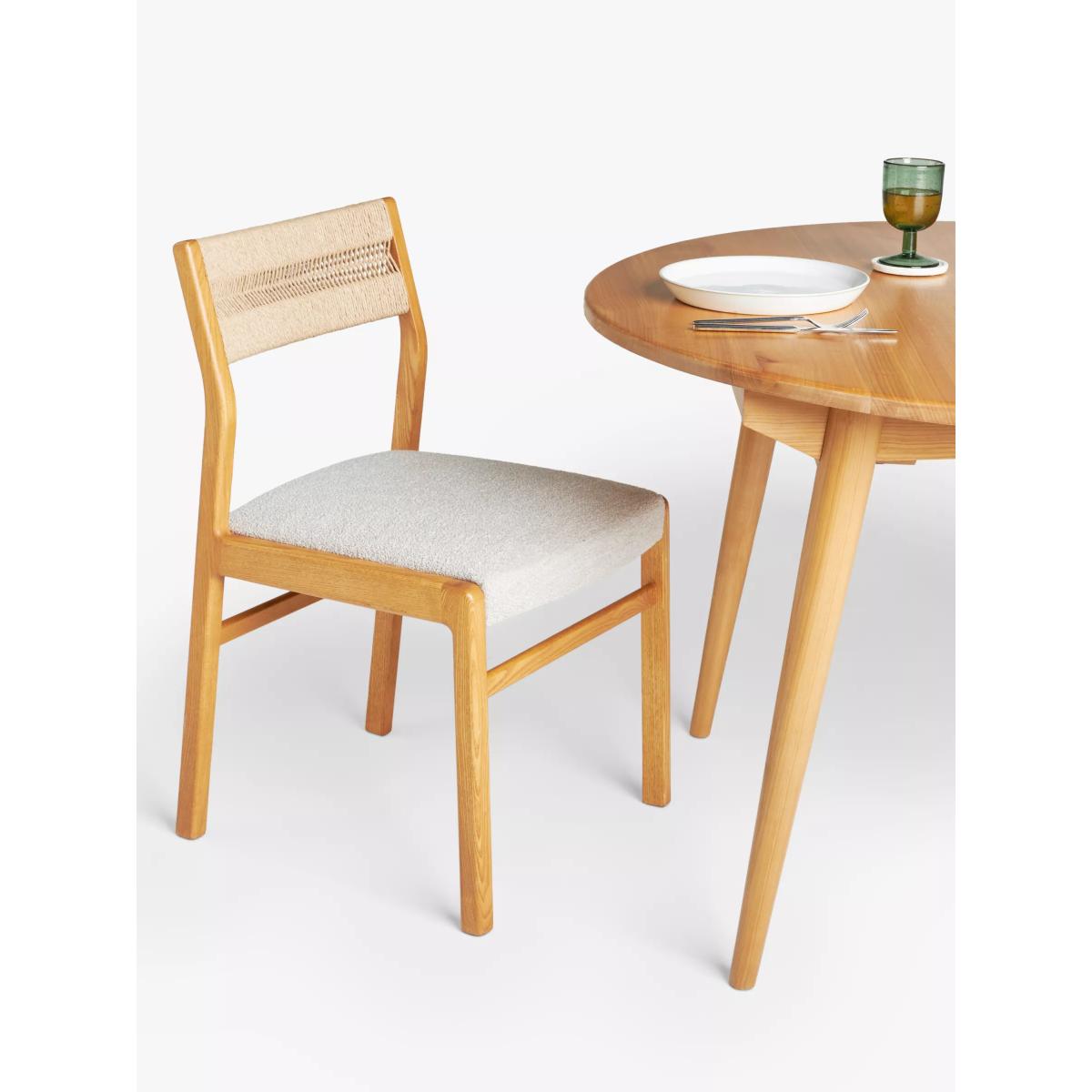 Inspired by and named after High Wycombe, the home of British furniture making, this dining chair is made from lacquered FSC ash wood which has a naturally warm and distinct colour and tactility. Celebrating British mid-century furniture design, it features retro detailing with soft edges and angled, spindle legs. This ash wood dining chair has an intricately woven rope back and is upholstered in hardwearing polyester fabric in a soft, cream shade to suit most surroundings. Want to see it first? You may want to see and get a feel for the furniture in one of our shops before ordering. We'll be able to tell you where the range you'd like to view is on display.