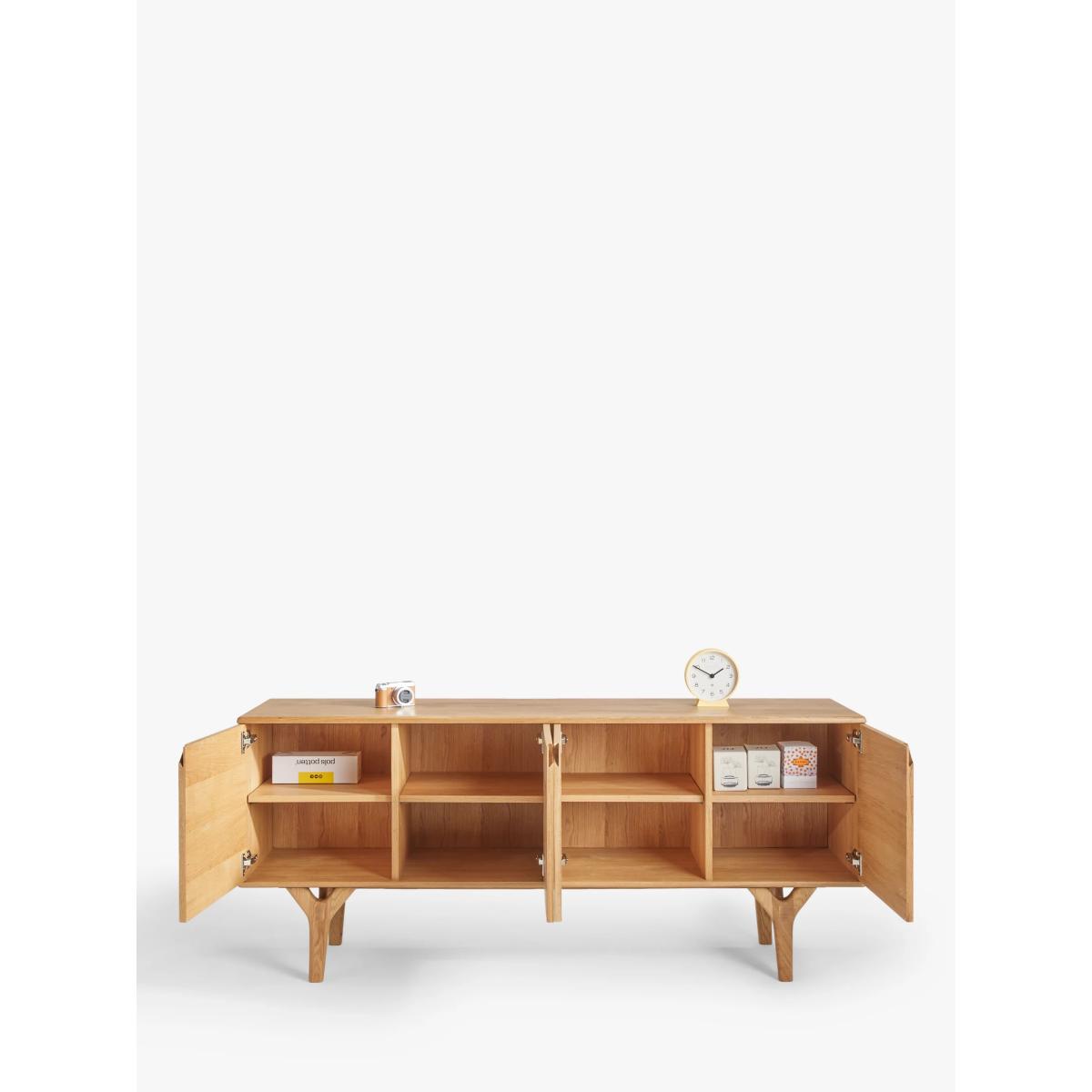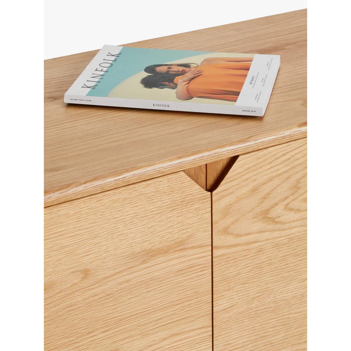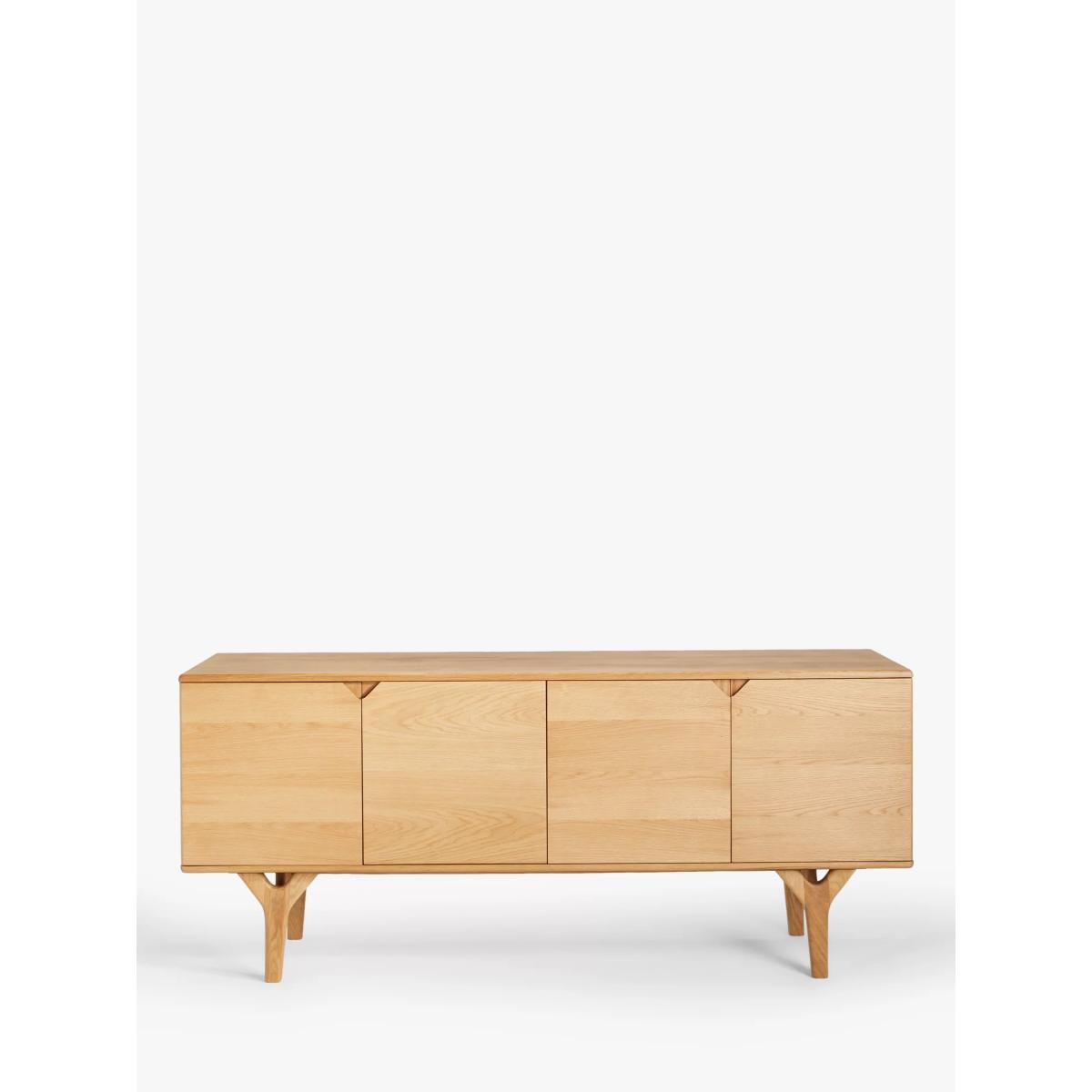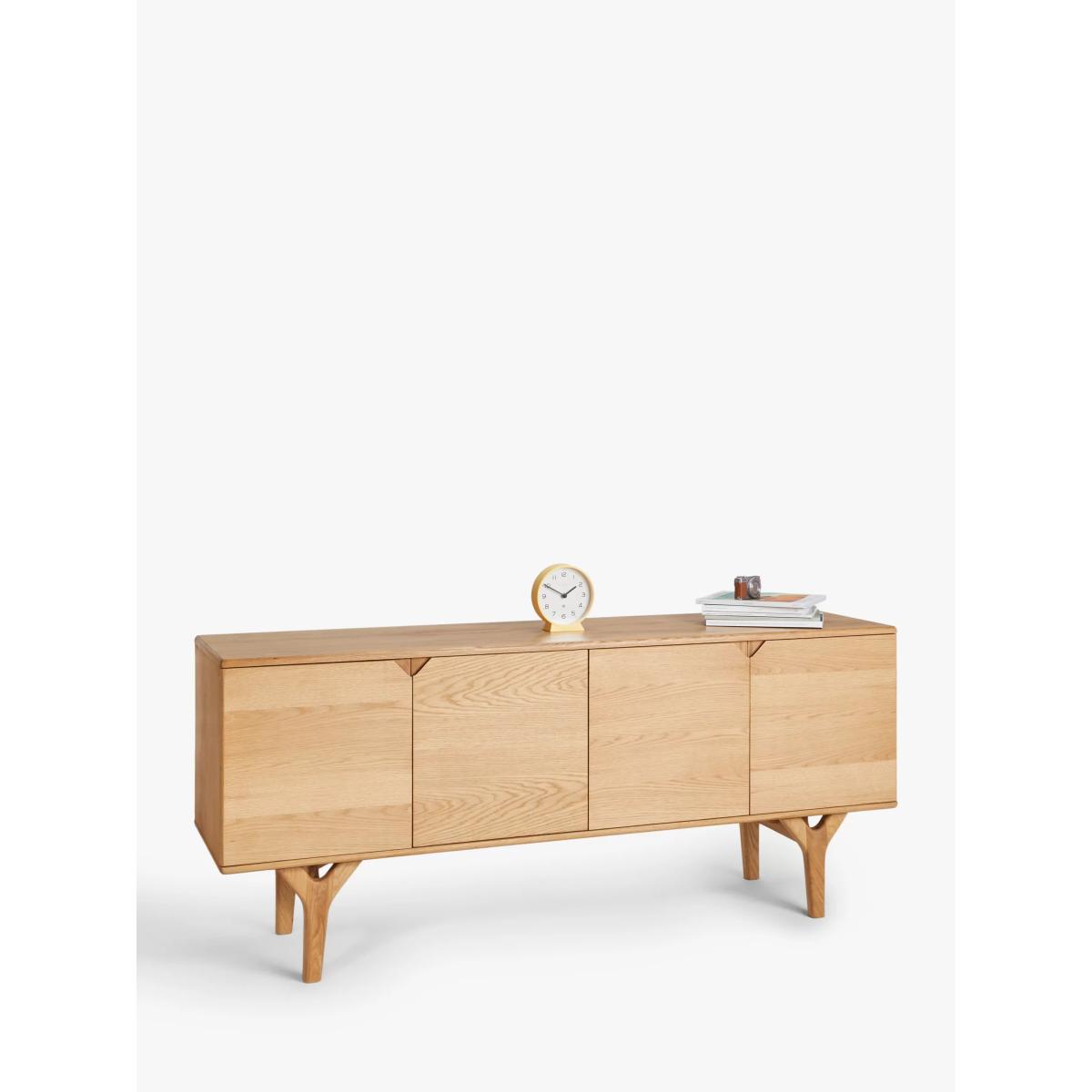 Created for us by Danish design duo Says Who, renowned for compelling details and expert woodworking, this sideboard is built for your contemporary home. Taking its cues from Scandi-inspired design, this large sideboard is made from solid and veneered oak with a soft-edge finish on the frame and robust y-shaped legs. We love the finish of oak and its unique patterns and grains which will add a natural warmth to your space. Inside each cupboard section is an organised interior with adjustable shelving, so there's plenty of room for your essentials. Want to see it first? You may want to see and get a feel for the furniture in one of our shops before ordering. We'll be able to tell you where the range you'd like to view is on display.