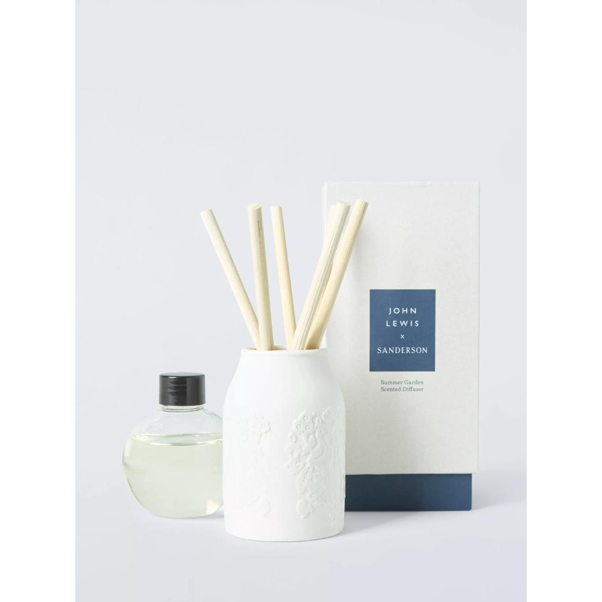 Summer Garden scented diffuser with etched ceramic jar and 6 natural rattan diffuser reeds. Designed by Sanderson. John Lewis x Sanderson In partnership with Sanderson, the home of iconic florals and illustrative botanicals. Celebrating a shared love of heritage prints and timeless British design.