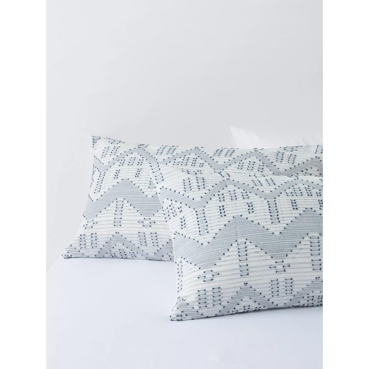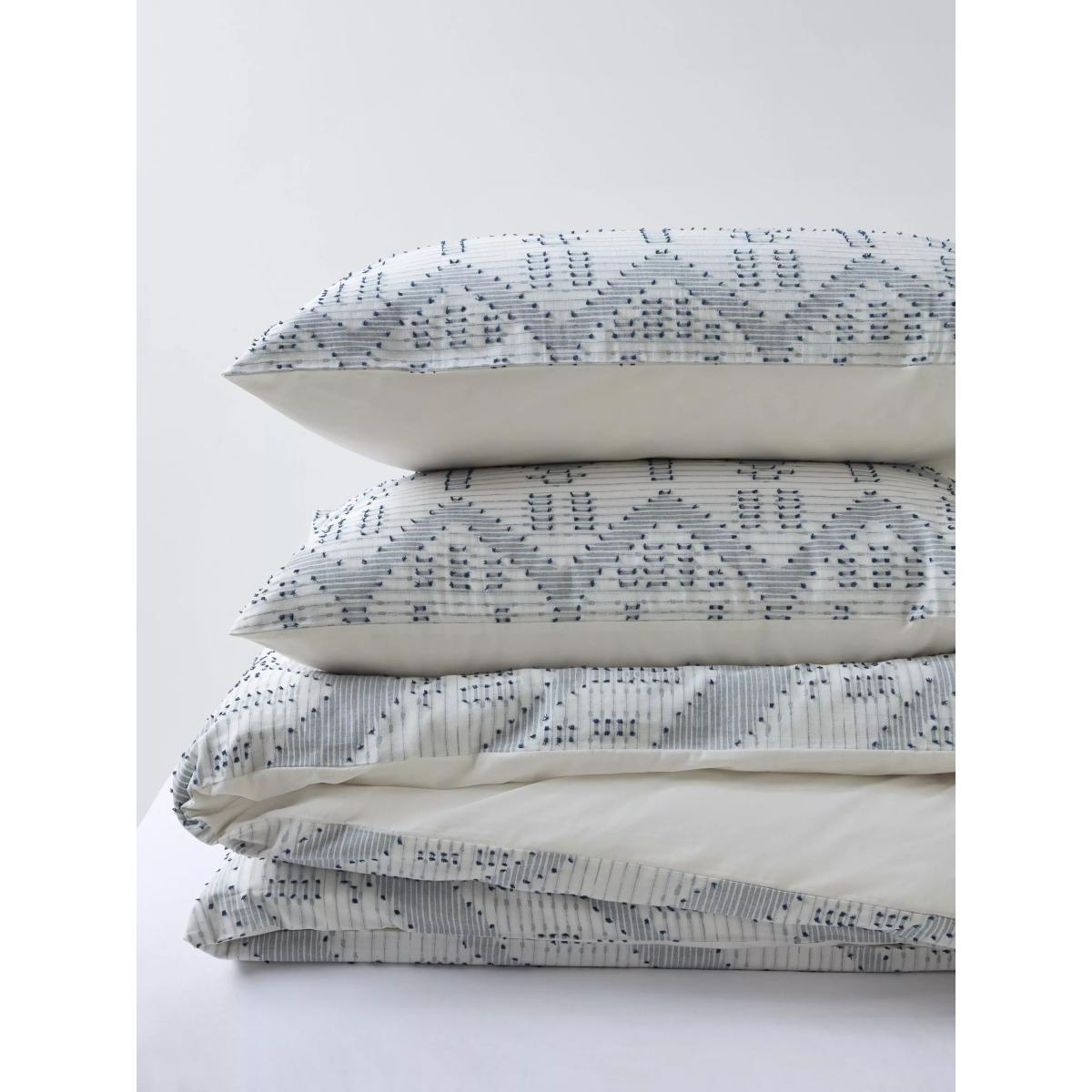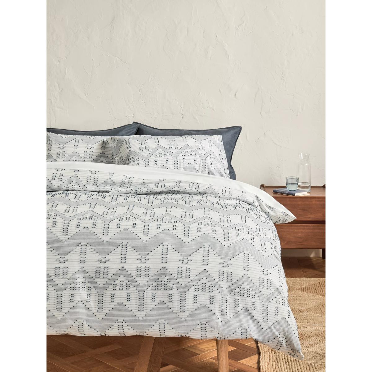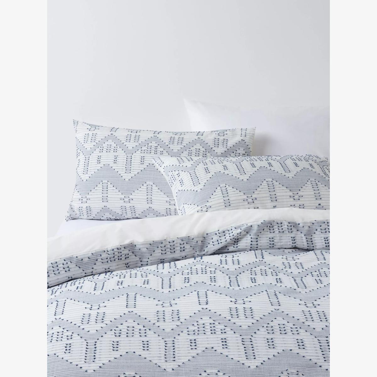 A fresh and relaxed design with a blue Ikat weave on a white background and plain reverse. The cool colourway lends itself well to accessorisation with bright pops of colour. The all-cotton 200 thread count fabric is naturally breathable, helping keep you cool and comfortable throughout the night. The single set comes with one standard pillowcase, while the double, king and super king sets come with two standard pillowcases. Bedding sizes To fit duvet/pillow size (cm) Standard pillowcase, L75 x W50cm Single duvet cover, L200 x W135cm Double duvet cover, L200 x W200cm King duvet cover, L220 x W225cm Super king duvet cover, L220 x W260cm