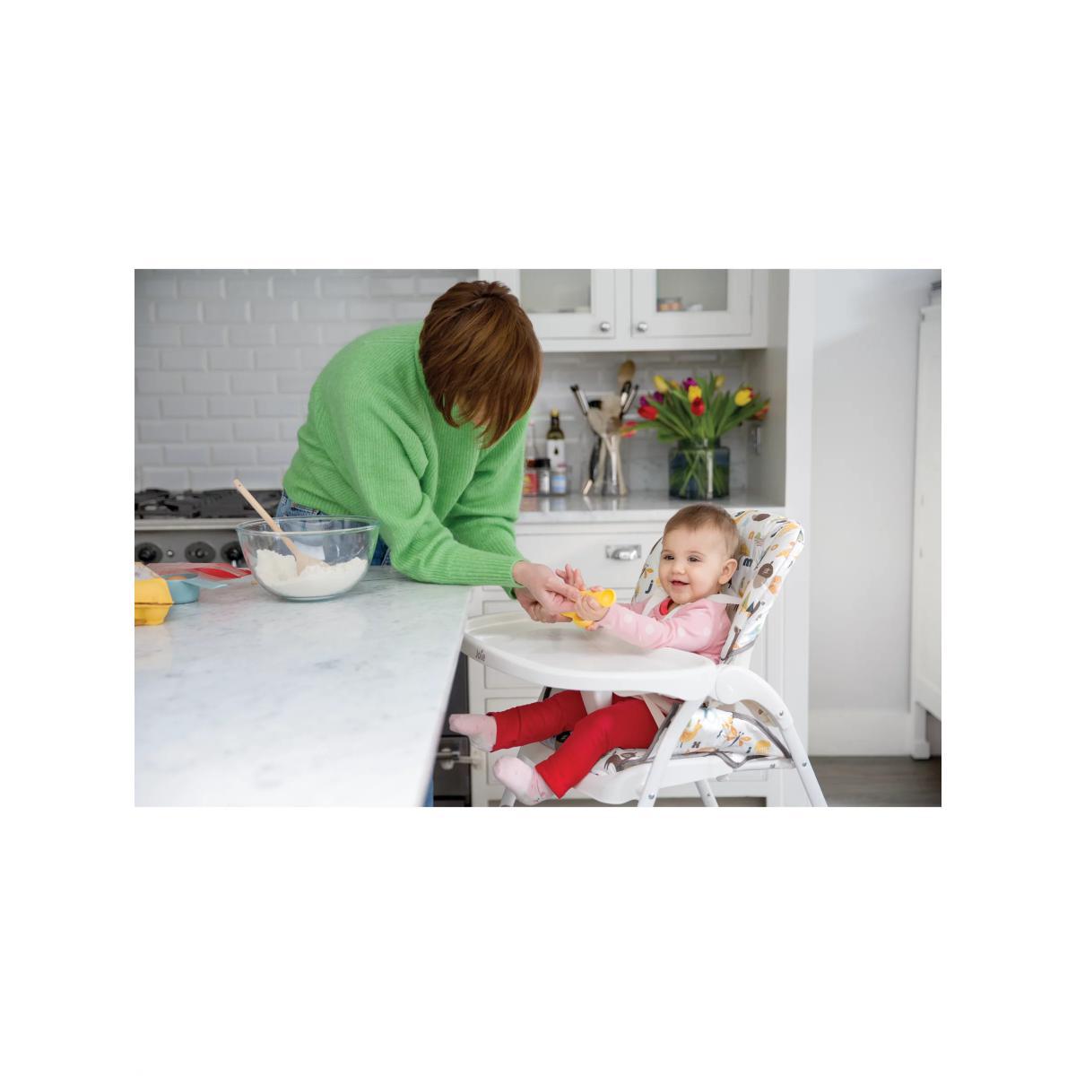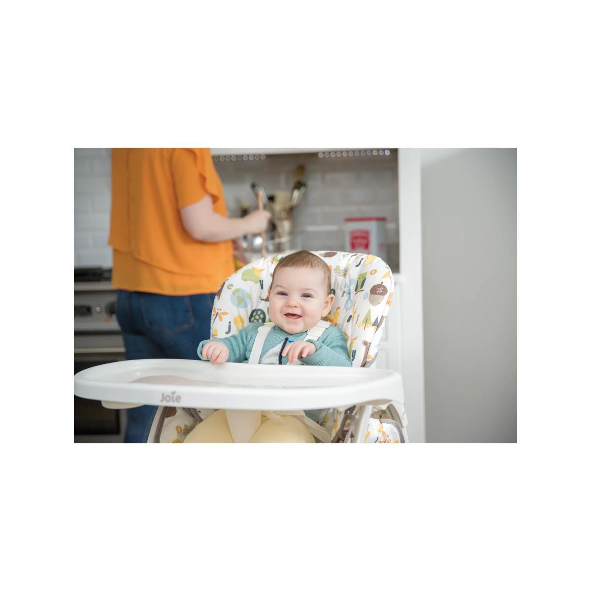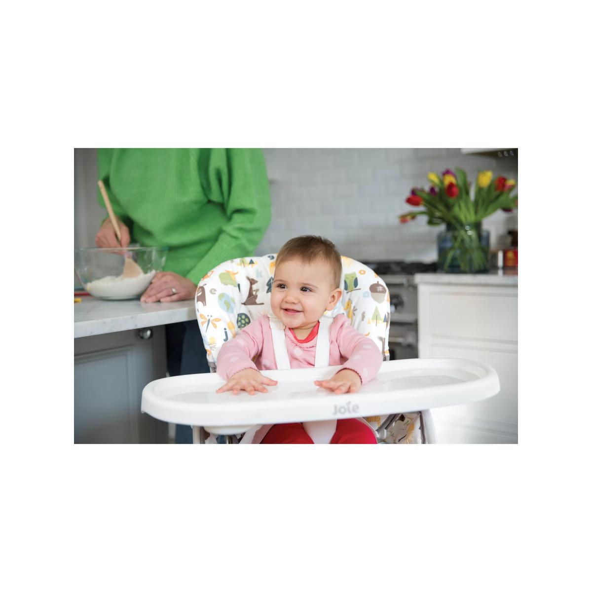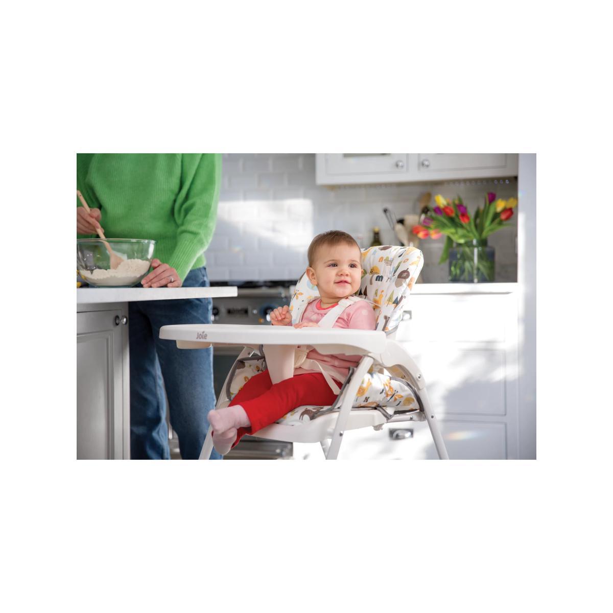 Meet the Mimzy™ Snacker from Joie Baby, a mealtime must-have with a one-hand compact fold. With simple no-fuss features, this chair makes dining with baby simple and easy. The chair folds in a flash with a one-hand fold that allows for easy access to the seat and closes up ultra-flat in an instant. Three different recline options mean it can grow with your child from 6 months up to 3 years. Convenient and compact - the dishwasher safe tray and unique tray storage on the back legs make cleaning up a breeze. Key Features: One-hand, quick compact fold is easily accessed in the middle of seat Streamlined design with full-sized features Stands while folded for easy storage Unique tray storage on back of seat Tray with cupholder adjusts to three depths to accommodate children of all shapes and sizes 3-position seat recline Large storage basket Removable, wipeable seat pad Soft. Touch, 5-point harness system keeps baby secure and adjusts to 3 heights Product weight: 6.25kg