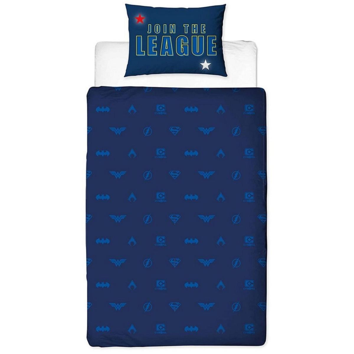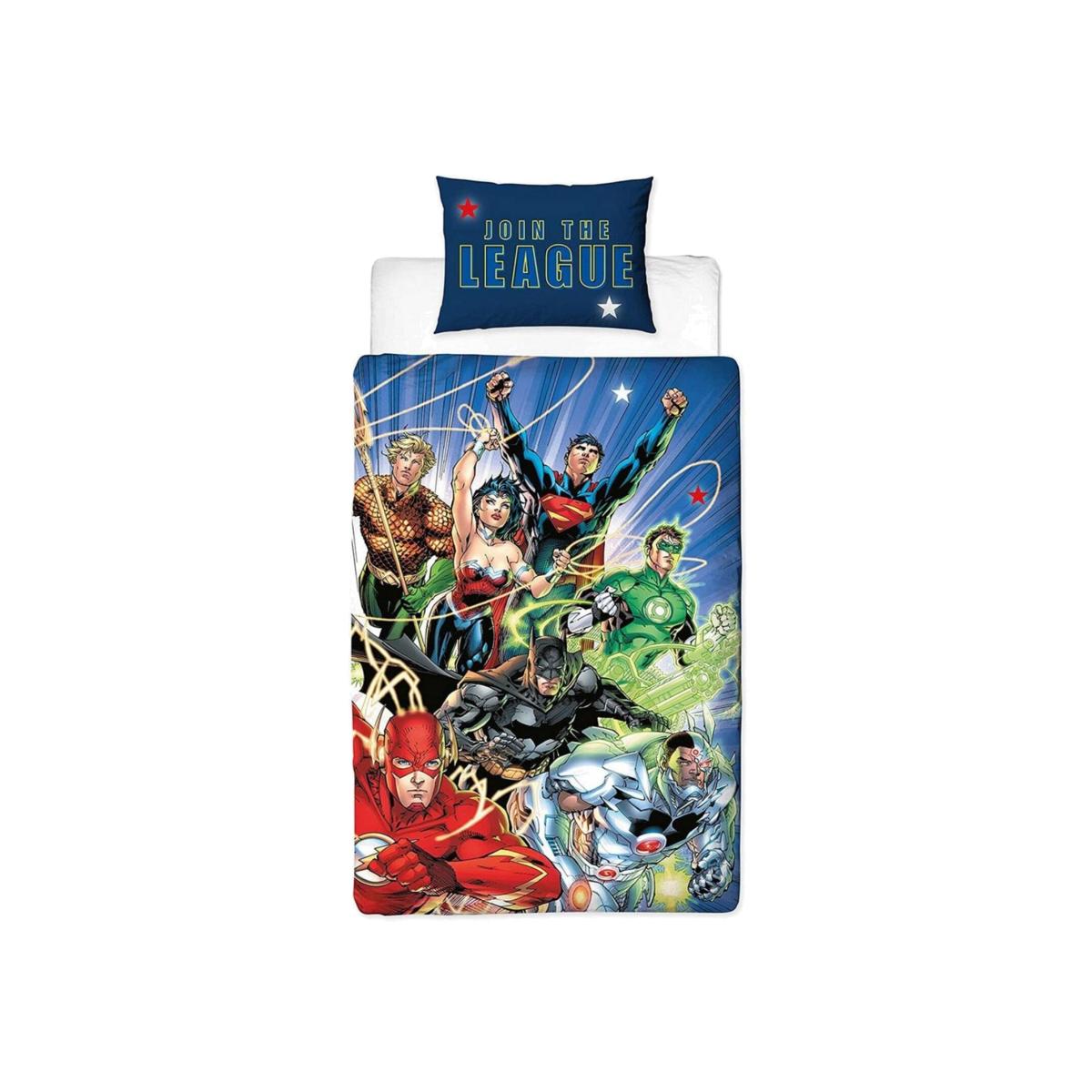 This fantastic Justice League Join single duvet cover is the perfect bedding set for any superhero and comic book fans. The design features a fantastic image of Batman, Superman, Flash, Green Lantern, Wonder Woman, Aquaman and Cyborg in action on one side, while the reverse has a repeat pattern of the superheroes logos on a dark blue background. This cotton mix bedding set is suitable for machine washing and can be tumble dried on a low setting.