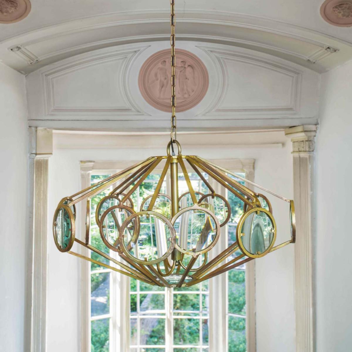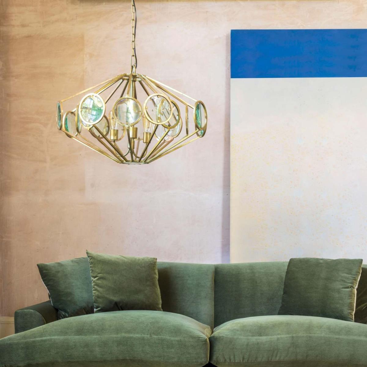 A striking lighting centrepiece with a midcentury edge, featuring convex glass discs within an antiqued brass finish frame.