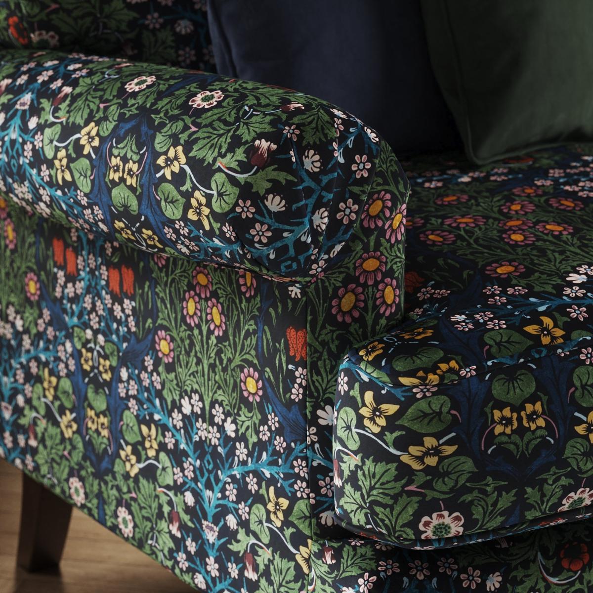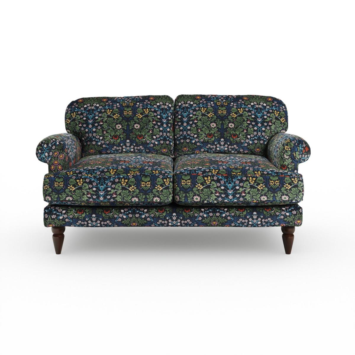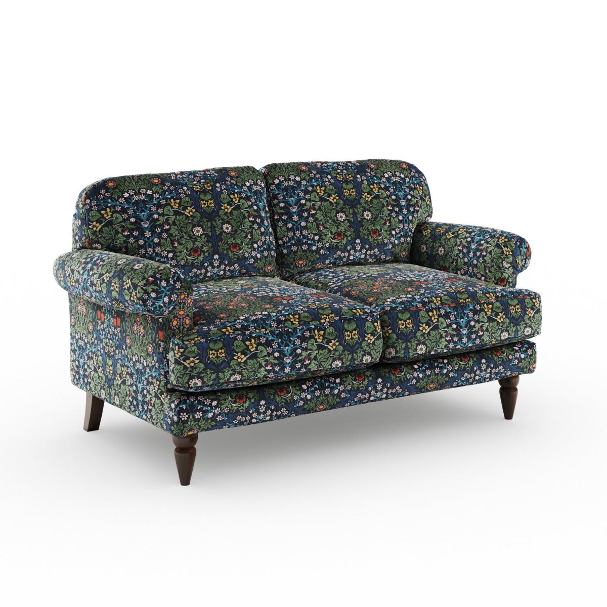 * William Morris print upholstery* Scroll arms* Pleated arm front* Fibre filled seat* Solid Oak feet A Dunelm design upholstered in a William Morris print, this piece is accented by the iconic William Morris Blackthorn design. This 2 seater sofa features a timeless scroll arm design and a beautifully pleated arm front. The fibre seat and back cushions provide exceptional comfort, while the solid oak wooden feet add a touch of natural elegance and sturdy support. Disclaimer:This product is not pattern matched, pattern may vary from photo.
