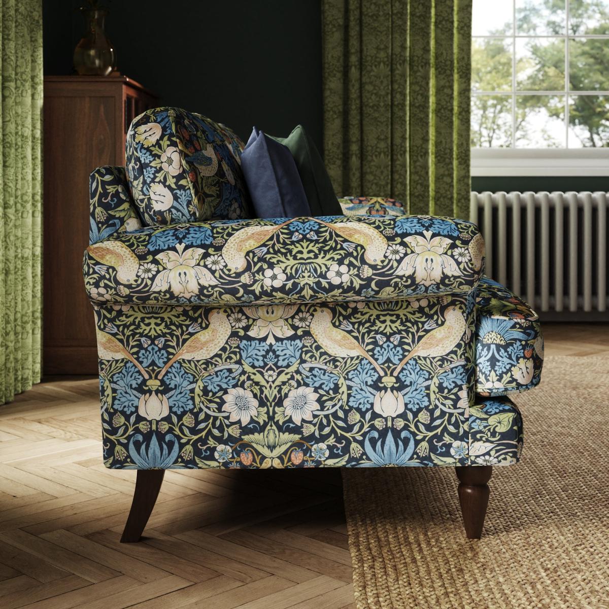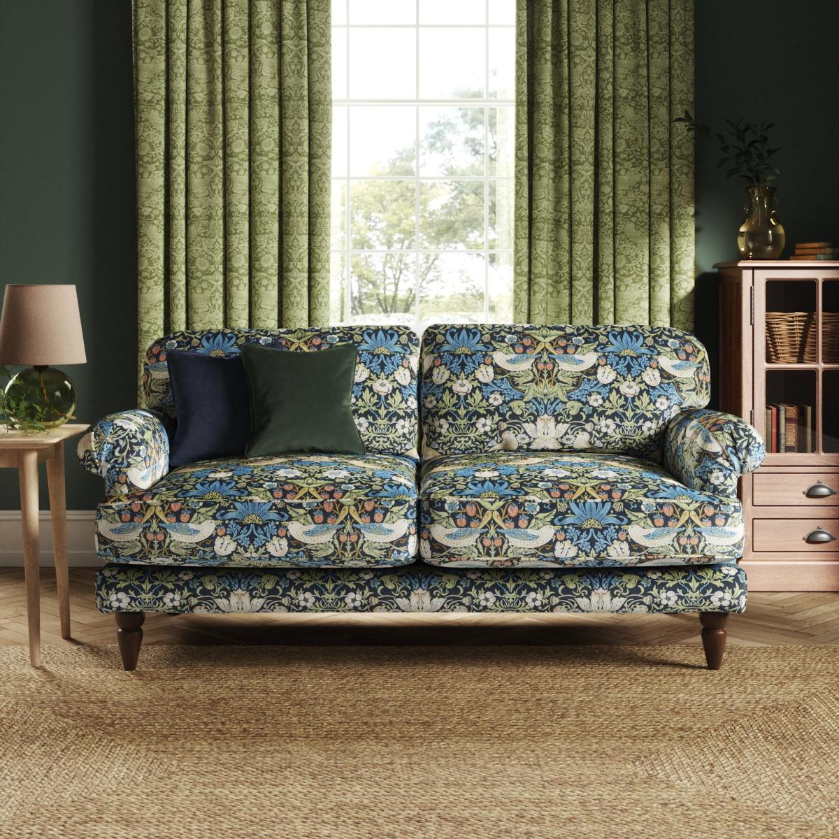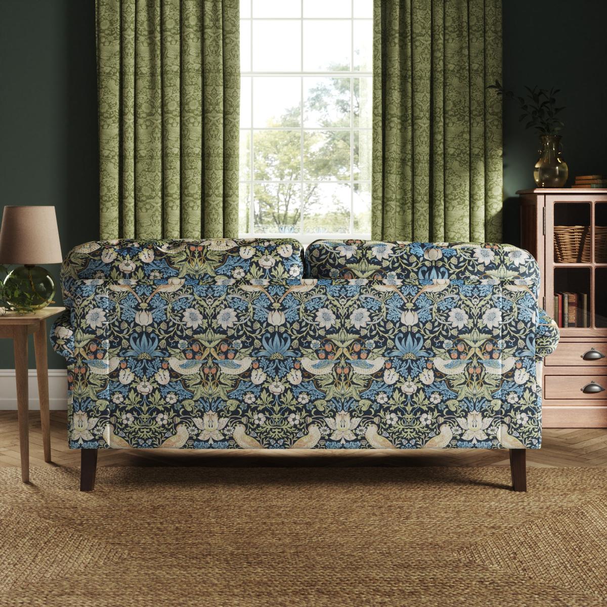 I love the Jolene William Morris sofa for its striking vintage charm and rich fabric, making it a true statement piece. Its velvet finish adds a touch of luxury and softness, perfect for both traditional and eclectic interiors. The Strawberry Thief print adds colour and character, while the midnight backdrop keeps it versatile enough to pair with a range of colour schemes. When styling, consider balancing its vibrant pattern with more subdued accessories-perhaps a neutral rug and simple cushions-to let the sofa shine. It works well in period homes or modern spaces seeking a splash of heritage style, and pairing it with brass or wooden accents can elevate its timeless appeal.
