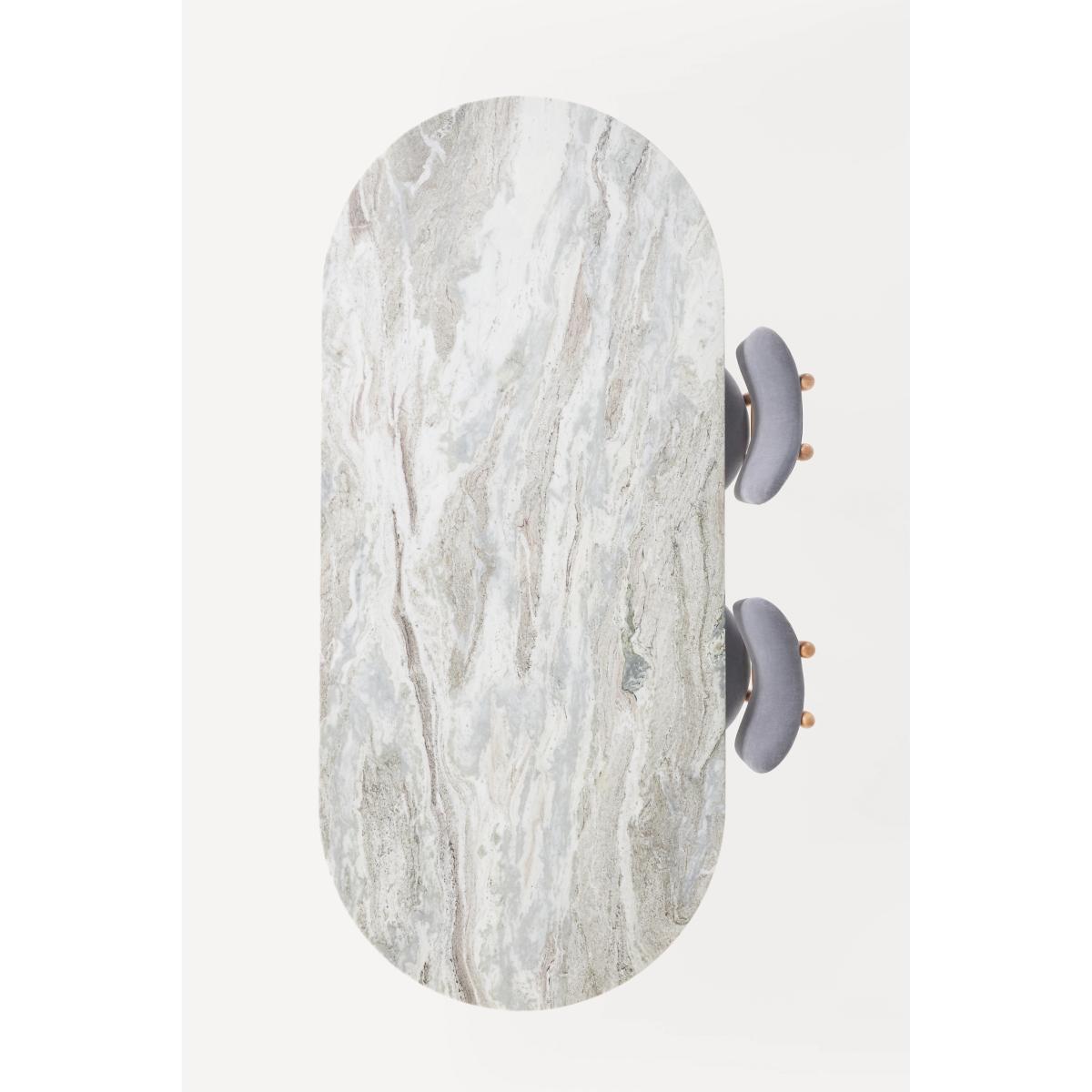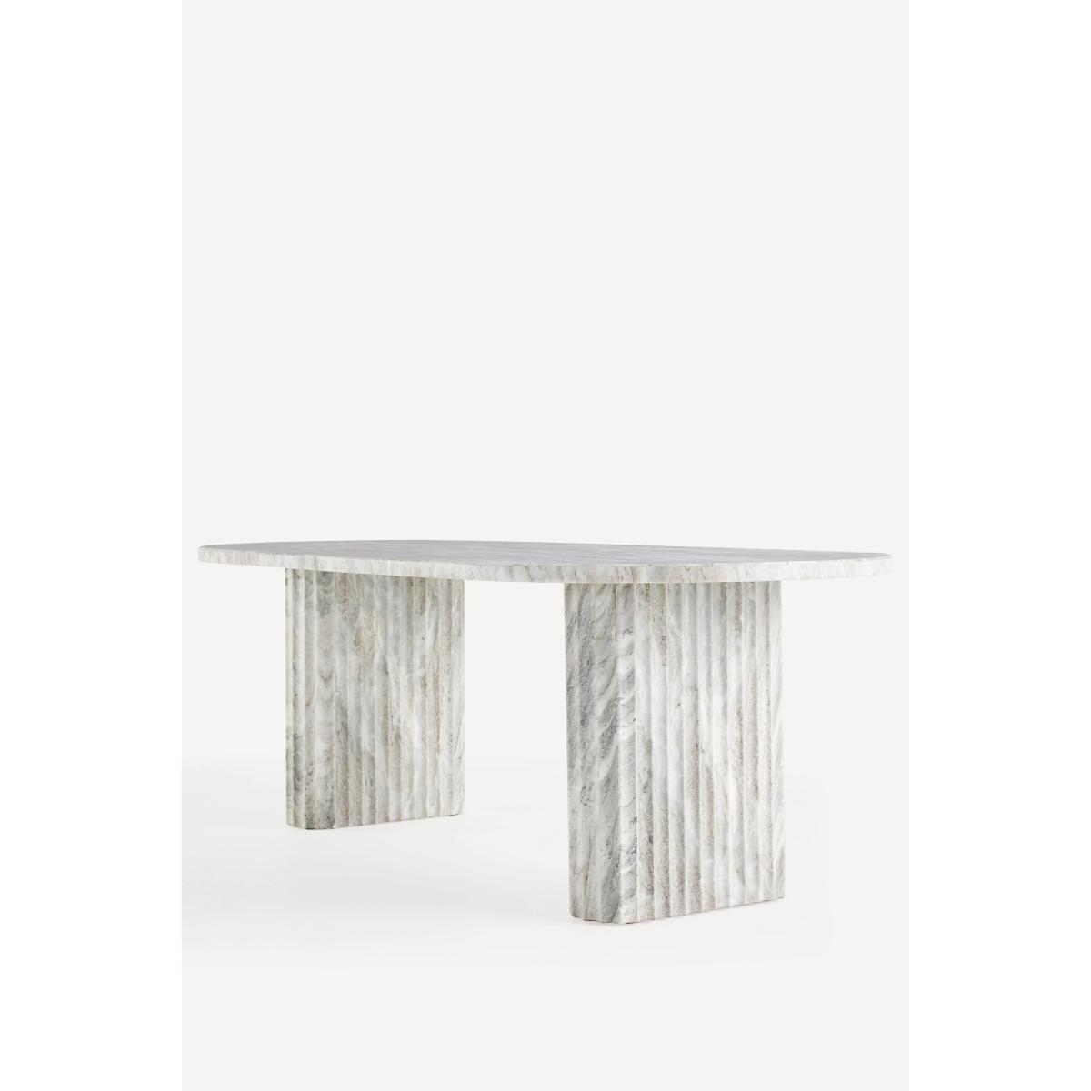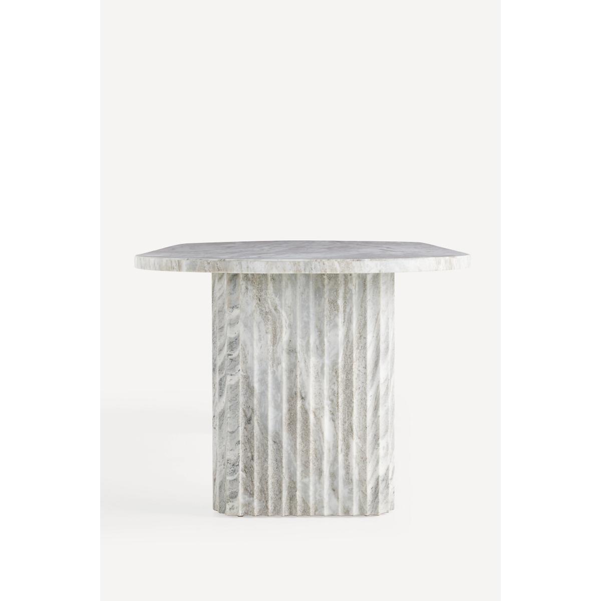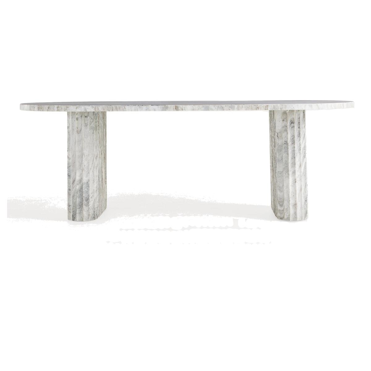 Hand-carved from marble, this exquisite dining table features thick, fluted legs, adding a touch of sophistication to your dining room. * Marble dining table with plywood and metal frame * Because this furniture is crafted by hand, no two pieces are exactly alike. Please expect unique variations in color, natural texture, and pattern (including woodgrain) from the imagery shown * Wipe clean with soft cloth. Avoid using chemical cleaners * Address spills immediately with a dry, soft cloth. Natural stone is a porous material, and although it has been sealed, spills should be blotted promptly to minimize staining * Use trivets, coasters, placemats, and felt pads to help prevent scratches * Levelers are included * This piece is intended for indoor use * No assembly required * Imported