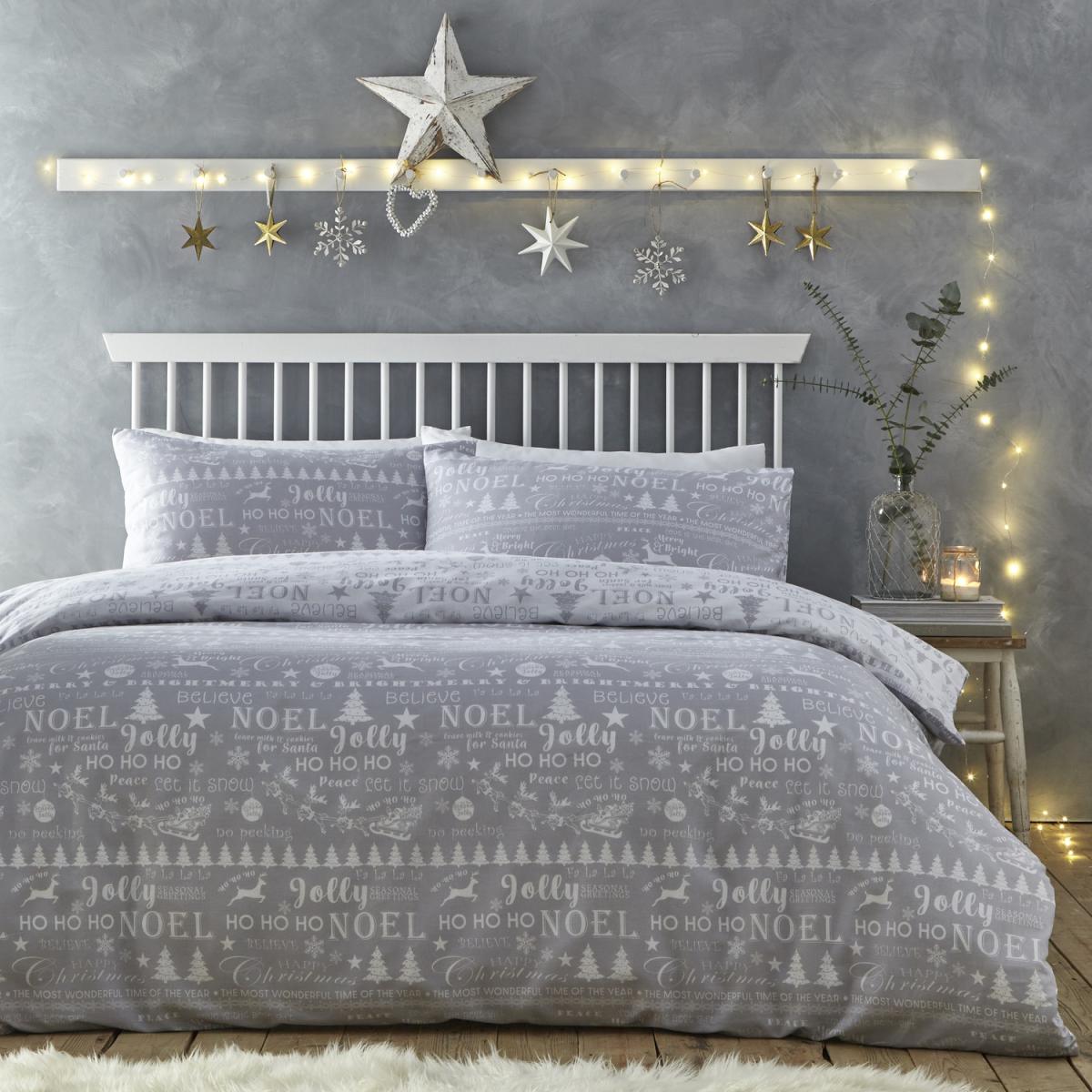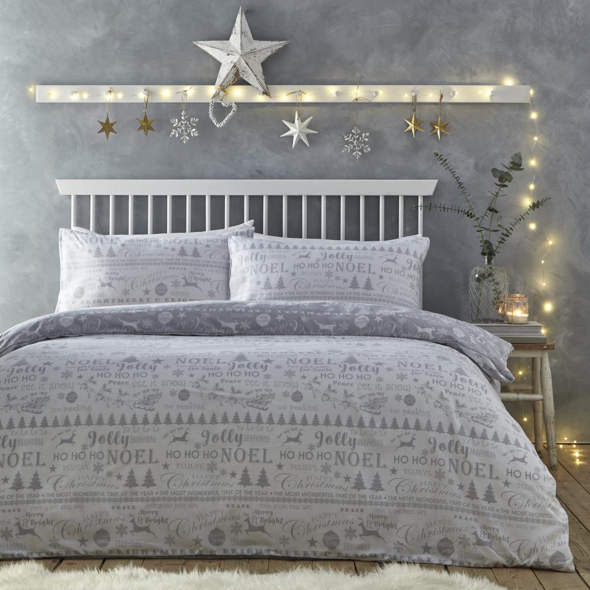The Jolly Christmas Silver White duvet set is a festive bedding option that can add a cheerful touch to your bedroom during the holiday season. The set includes a duvet cover and pillowcases that feature a lovely Silver and White background with a playful pattern of Christmas trees, snowflakes, and other seasonal motifs in shades of White and Silver. Made from high-quality, soft and breathable materials such as cotton, this duvet set can help you stay comfortable and cosy throughout the night, making it perfect for cold winter nights. The duvet cover is also machine washable, which makes it easy to clean and maintain. In addition to its functional benefits, the Jolly Christmas silver white duvet set can also add a touch of whimsy and joy to your bedroom decor during the holiday season. Whether you are looking to update your bedding for the holidays or searching for a unique gift for a loved one, this duvet set is sure to bring a smile to your face and help you get into the festive spirit.