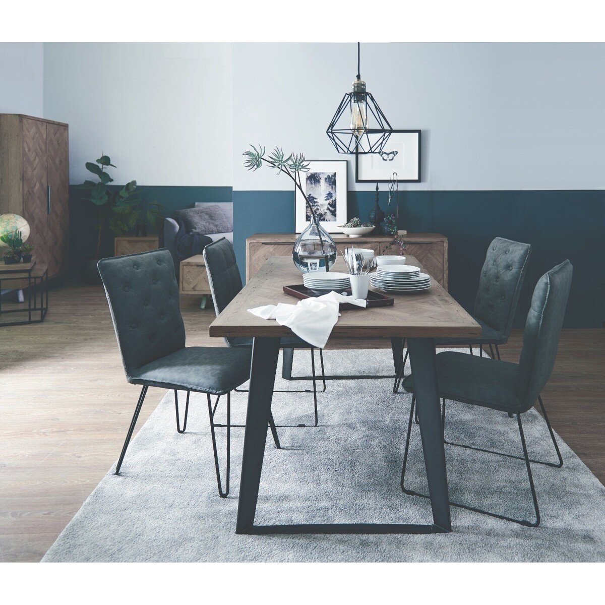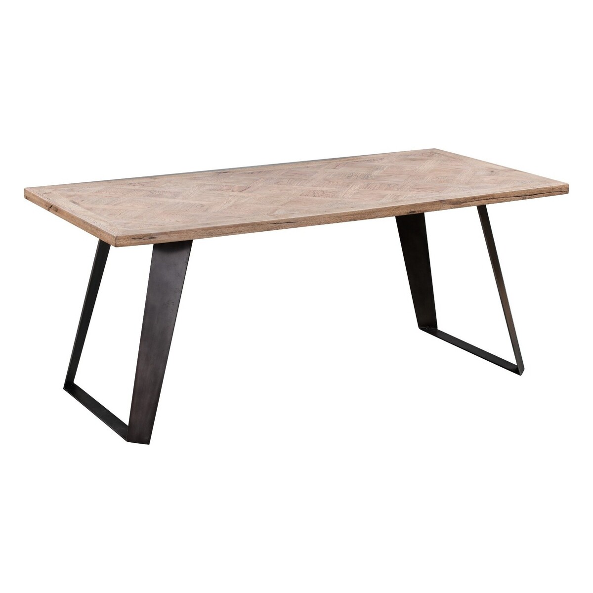 This is a large dining table, elegantly combining wood and metal. The table features an industrial and geometric design that makes a statement in any dining space. Large dining table, 220 cm long, seats up to 8 people. Wood table top with an aged grey finish and sharp, straight lines. The top fetaures a basket weave parquet design with a glossy coating. Angular metallic legs with a striking gunmetal grey finish. Hardy construction that ensures the table is strong and durable.