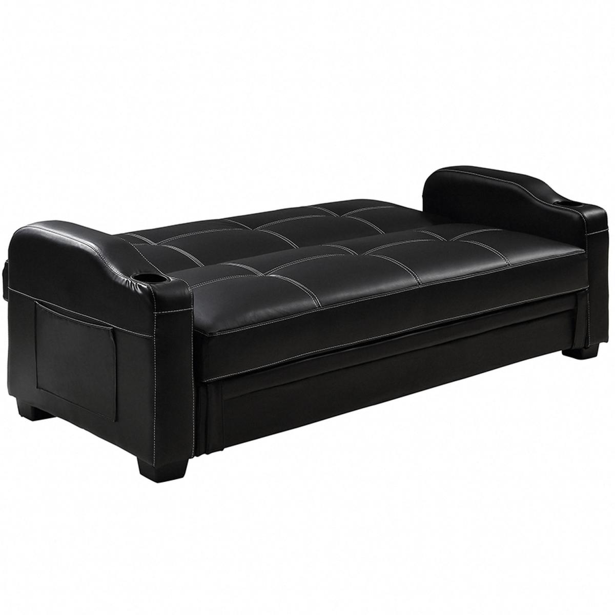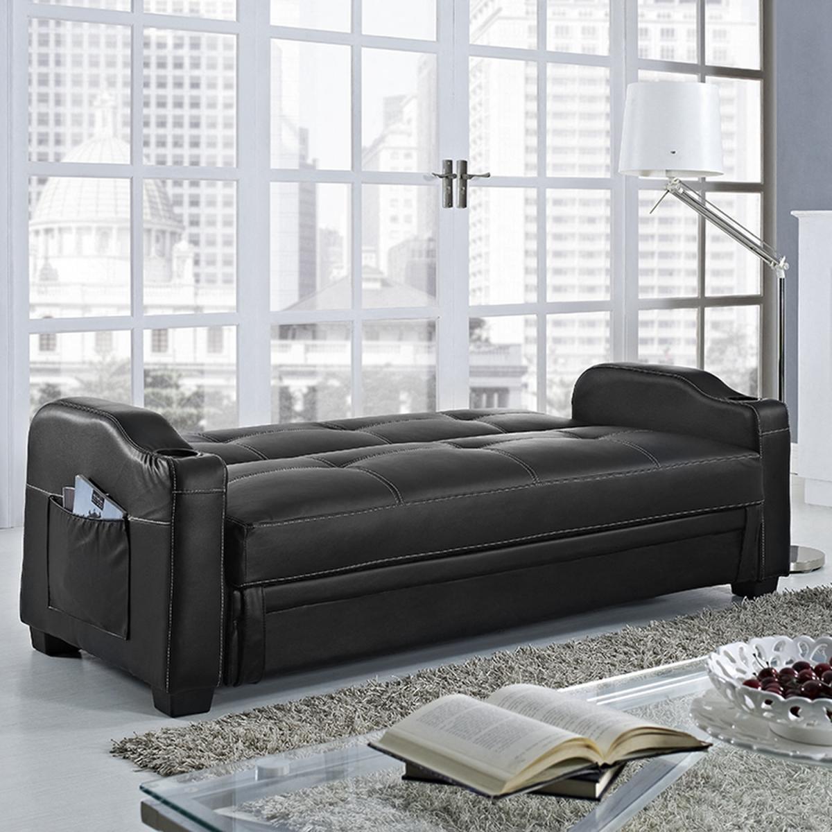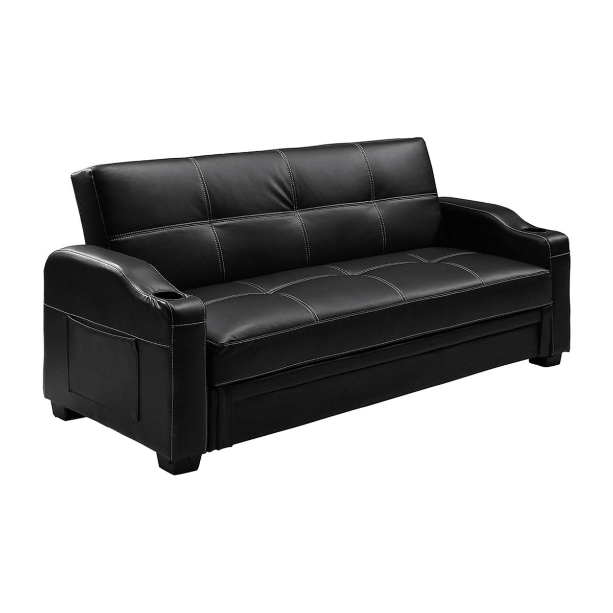 Introducing JONAH, a 3 seater faux leather sofa bed, available in Brown Faux Leather. JONAH has a sewn backrest with stitching detail. It also has the addition of under seat storage, cupholders on each armrest and a pocket on the side for magazines or remote controls. Convertible design - this sofa bed has a simple clic-clac mechanism that allows it to swiftly and simply transform from a sofa to a recliner to a bed, making it ideal for overnight guests. this sofa bed cannot be freely positioned in your room. The back of this sofa bed is upholstered in a black woven fabric that doe not match the colour of the sofa bed fabric. You may be required to screw the legs to the underside of the sofa bed since they do not all have pre-drilled holes. All of our sofa beds come with an easy-to-follow assembly guide. Due to differences in lighting and screen resolution on laptop, desktop, and mobile devices, some fabrics may appear somewhat different in person. To get the most out of your sofa bed, we recommend gently cleaning with the upholstery attachment of you vacuum cleaner or using a sofa hand brush once a week. Delivered by our friendly couriers within 1-3 working days. The courier will deliver to the main door of the building only on an all-day 7am to 7pm service with no time slots provided.