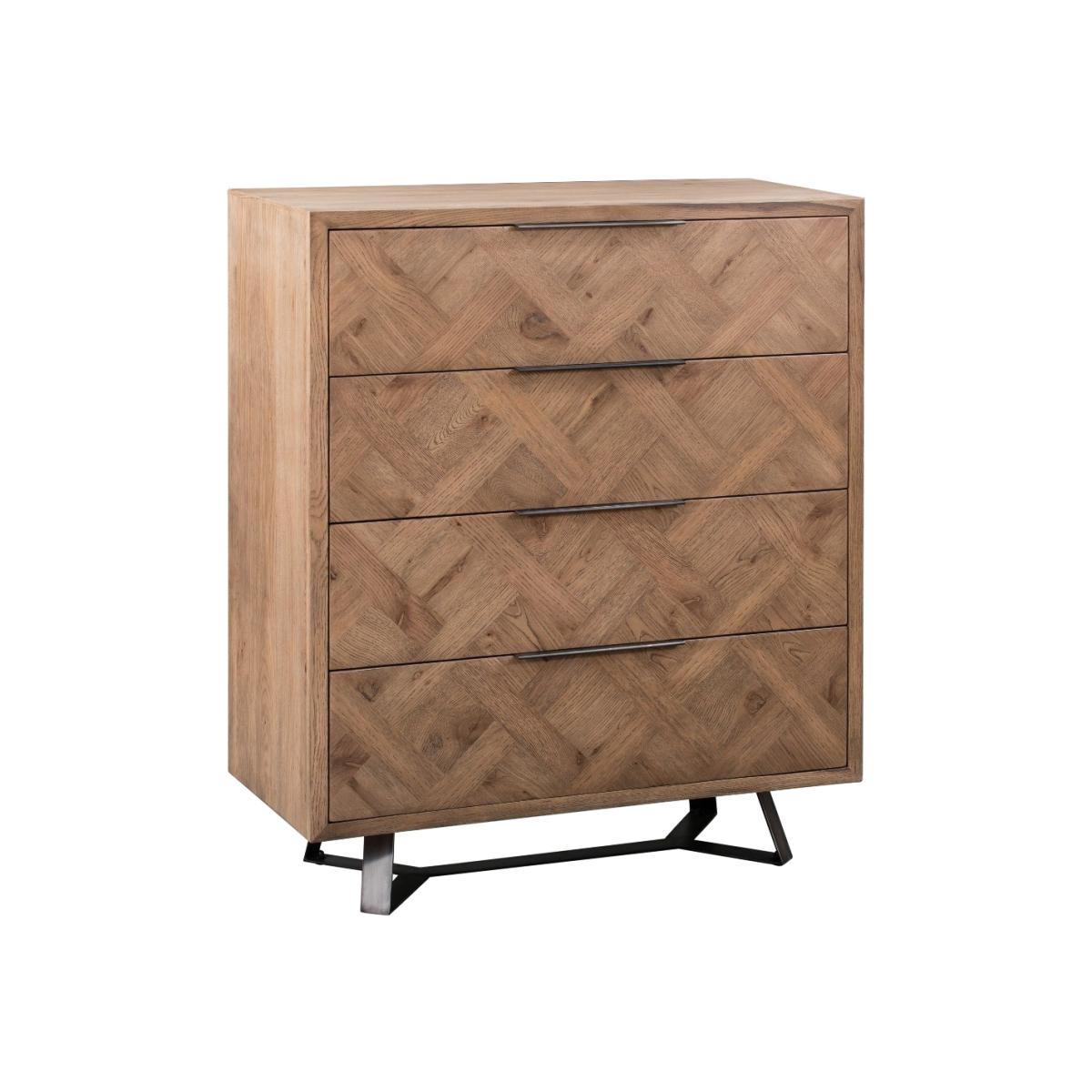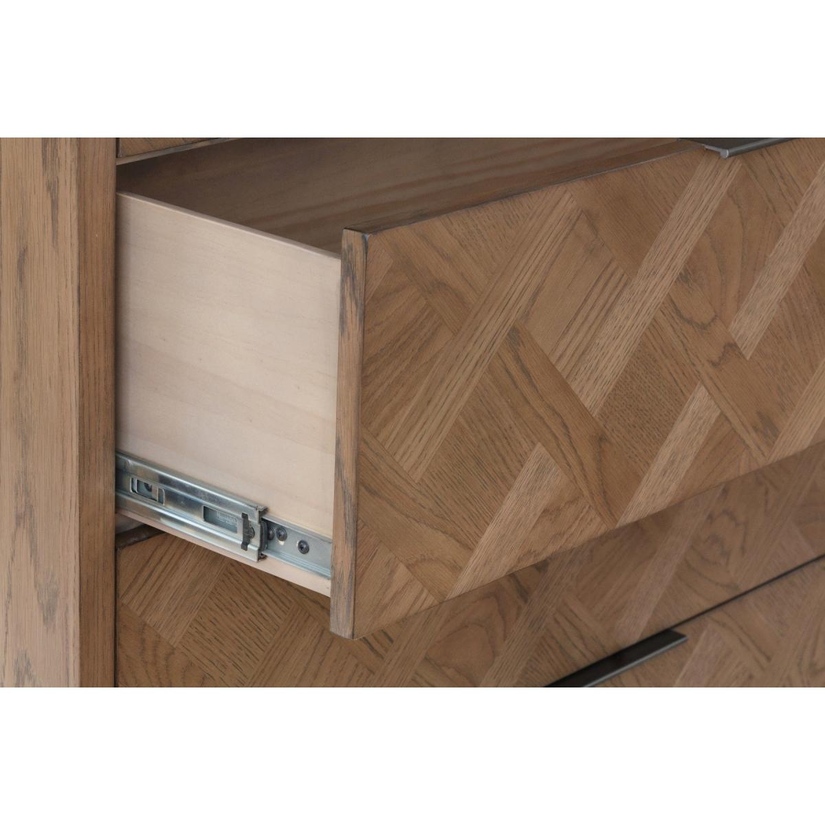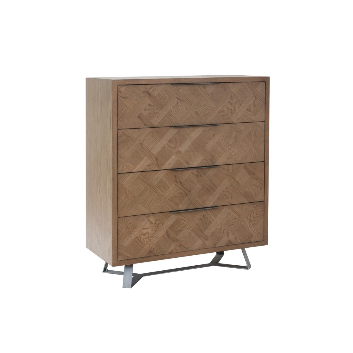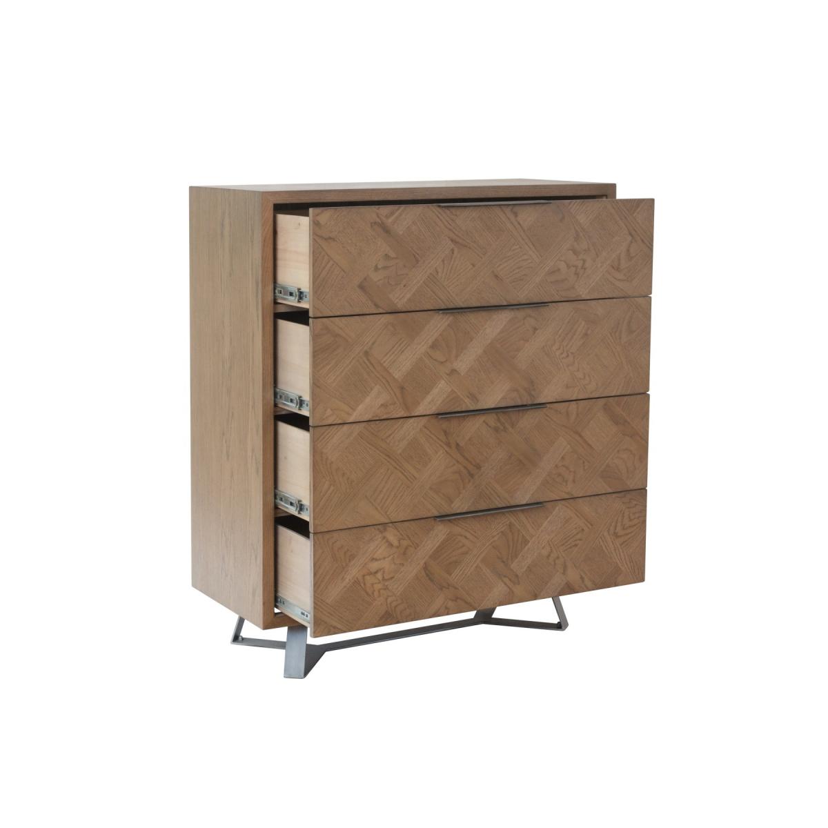 The Jonah chest of drawers is designed to accommodate your storage needs without compromising on quality, style and durability. Crafted from oak, pine, and oak veneer, this chest of drawers has a strong, enduring frame and features an elegant aged grey oak finish that exudes character and warmth. Strong, solid wood frame. Striking aged grey oak finish that brings out the grain in the wood. Elegant basket weave parquet design for a unique look. 4 large, deep dovetailed drawers running on metal guides offer plenty of storage space. Graphite top-mounted handlebars. Comes ready assembled. Look out for more items from this collection.