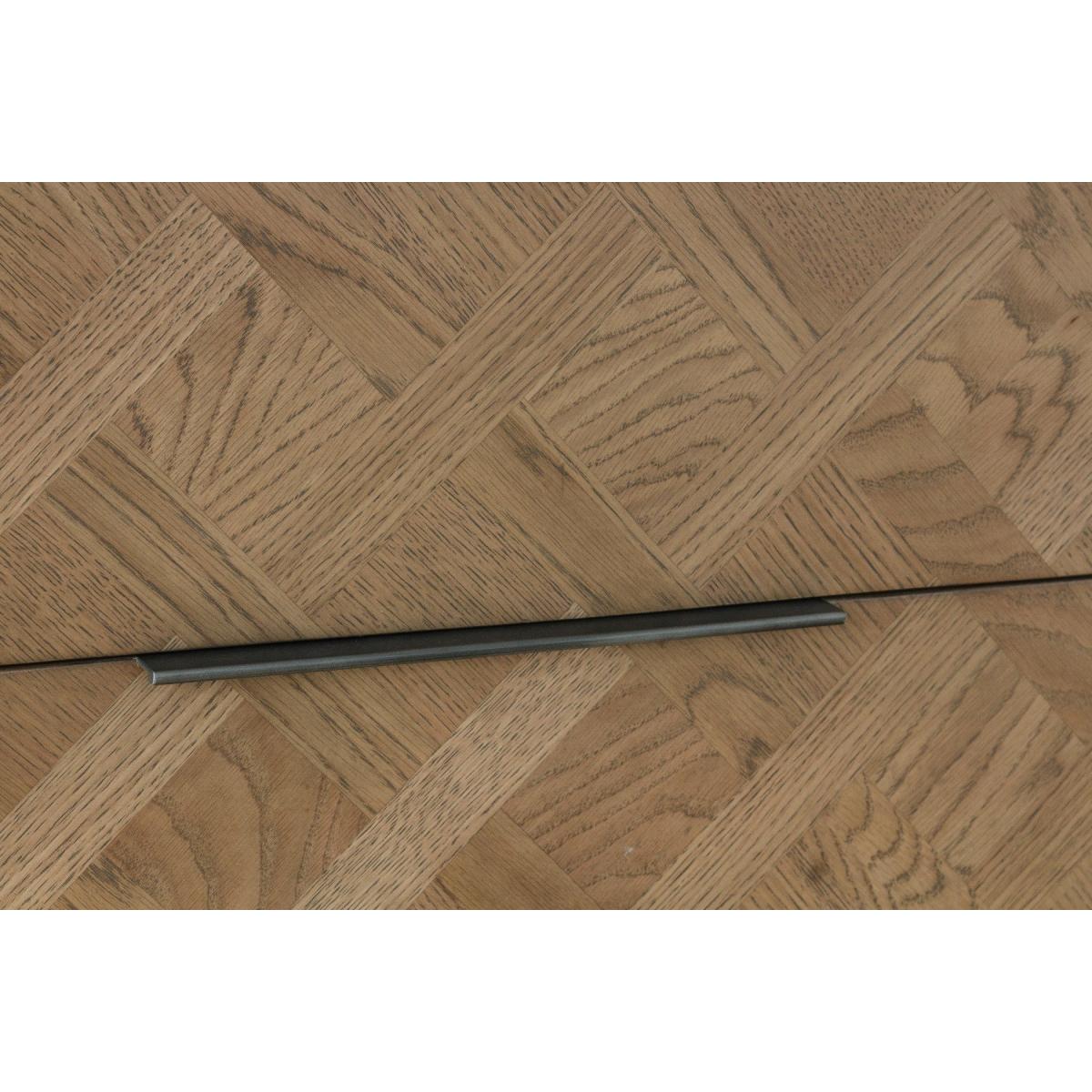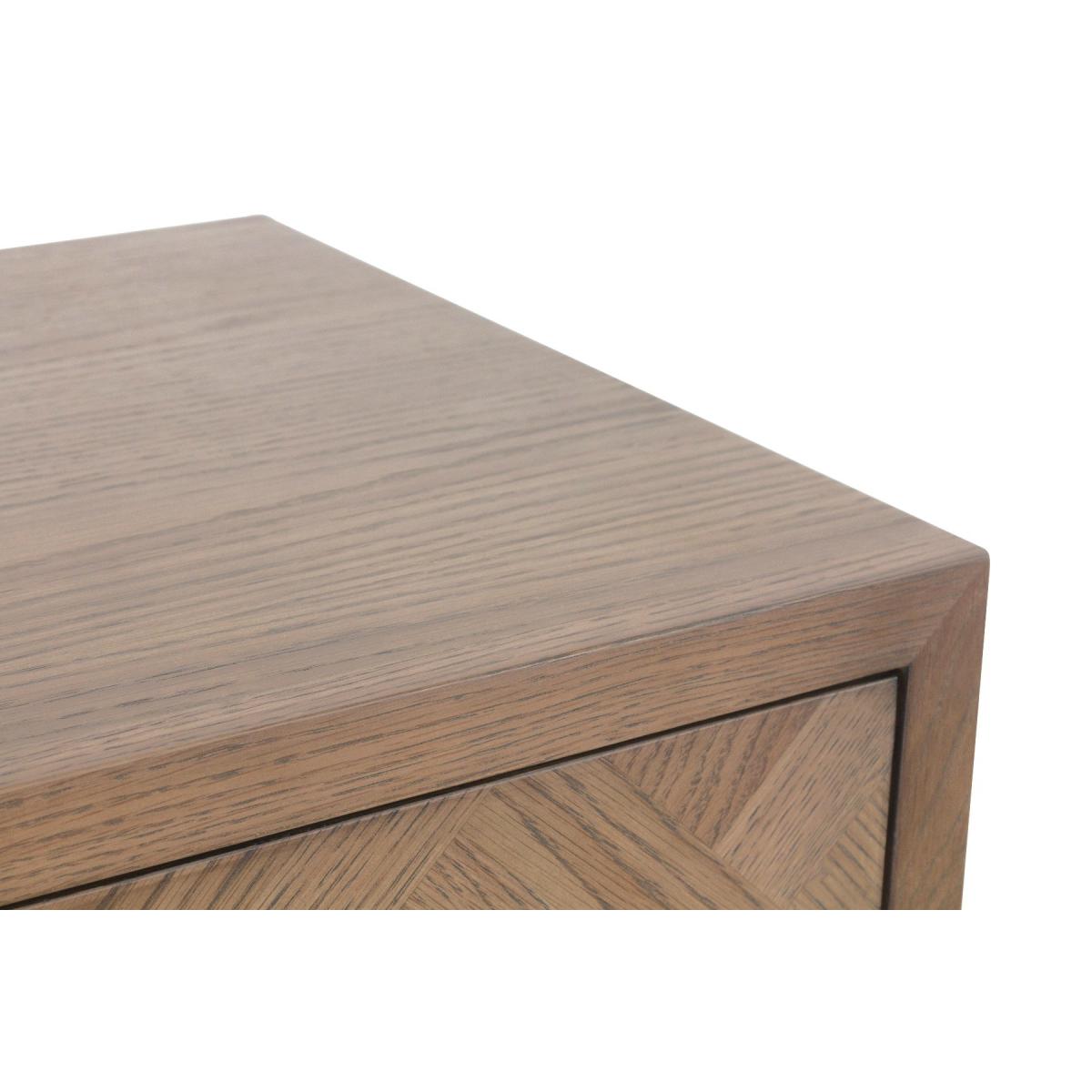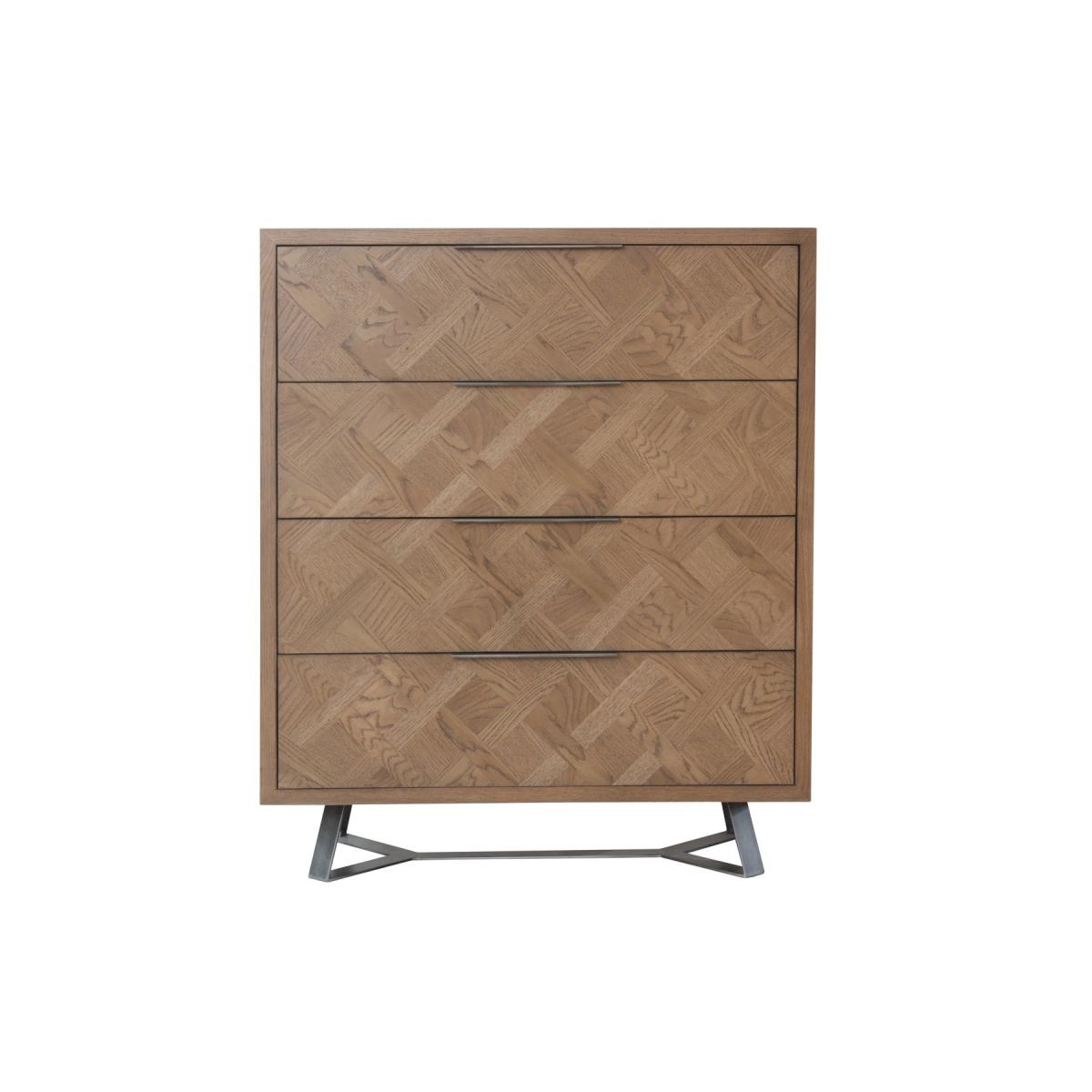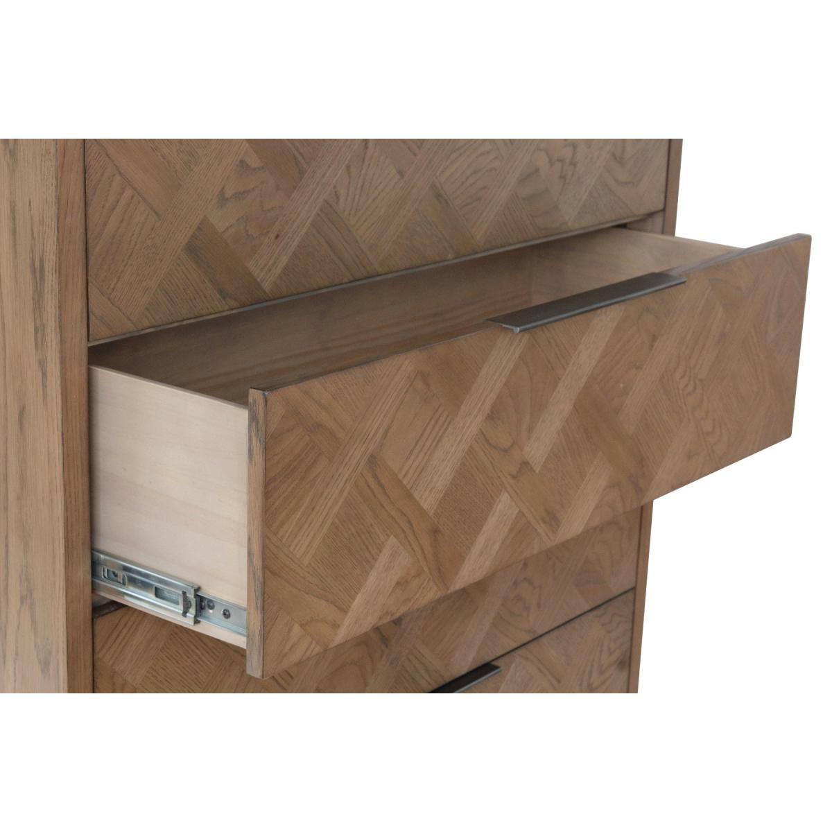 The Jonah chest of drawers is designed to accommodate your storage needs without compromising on quality, style and durability. Crafted from oak, pine, and oak veneer, this chest of drawers has a strong, enduring frame and features an elegant aged grey oak finish that exudes character and warmth. Strong, solid wood frame. Striking aged grey oak finish that brings out the grain in the wood. Elegant basket weave parquet design for a unique look. 4 large, deep dovetailed drawers running on metal guides offer plenty of storage space. Graphite top-mounted handlebars. Comes ready assembled. Look out for more items from this collection.