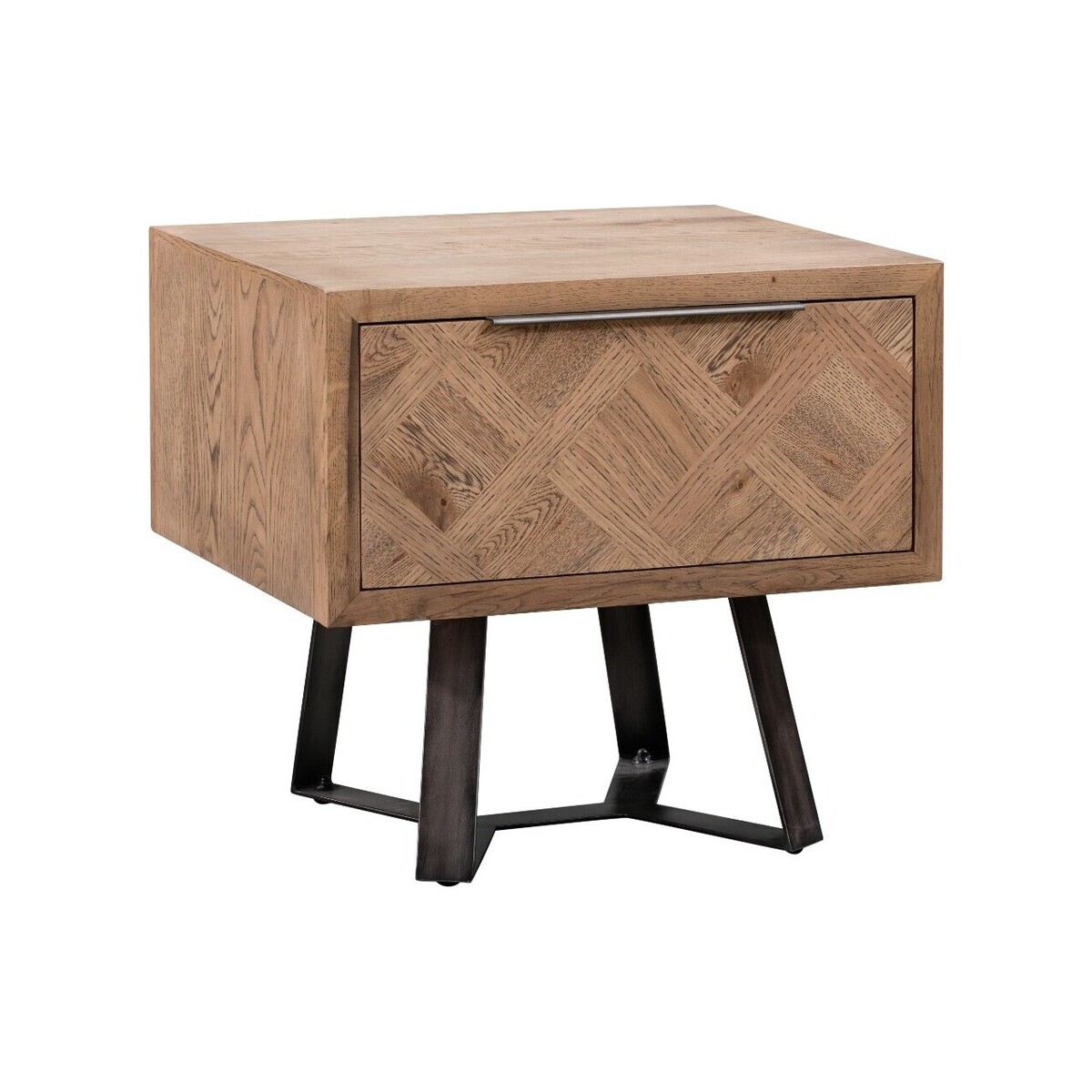 This is a tasteful side table with a drawer, carefully crafted from wood and metal. The stylish Side table combines style and functionality, providing exceptional value for money. Aged grey oak finish that gives it a warm, vintage look. Handy, deep drawer with delicate basketweave parquet finishing. Metal drawer runners and soft-close hinges. Sleek, top-mounted handle with gunmetal grey finish. Angular metal legs that provide steadfast support.