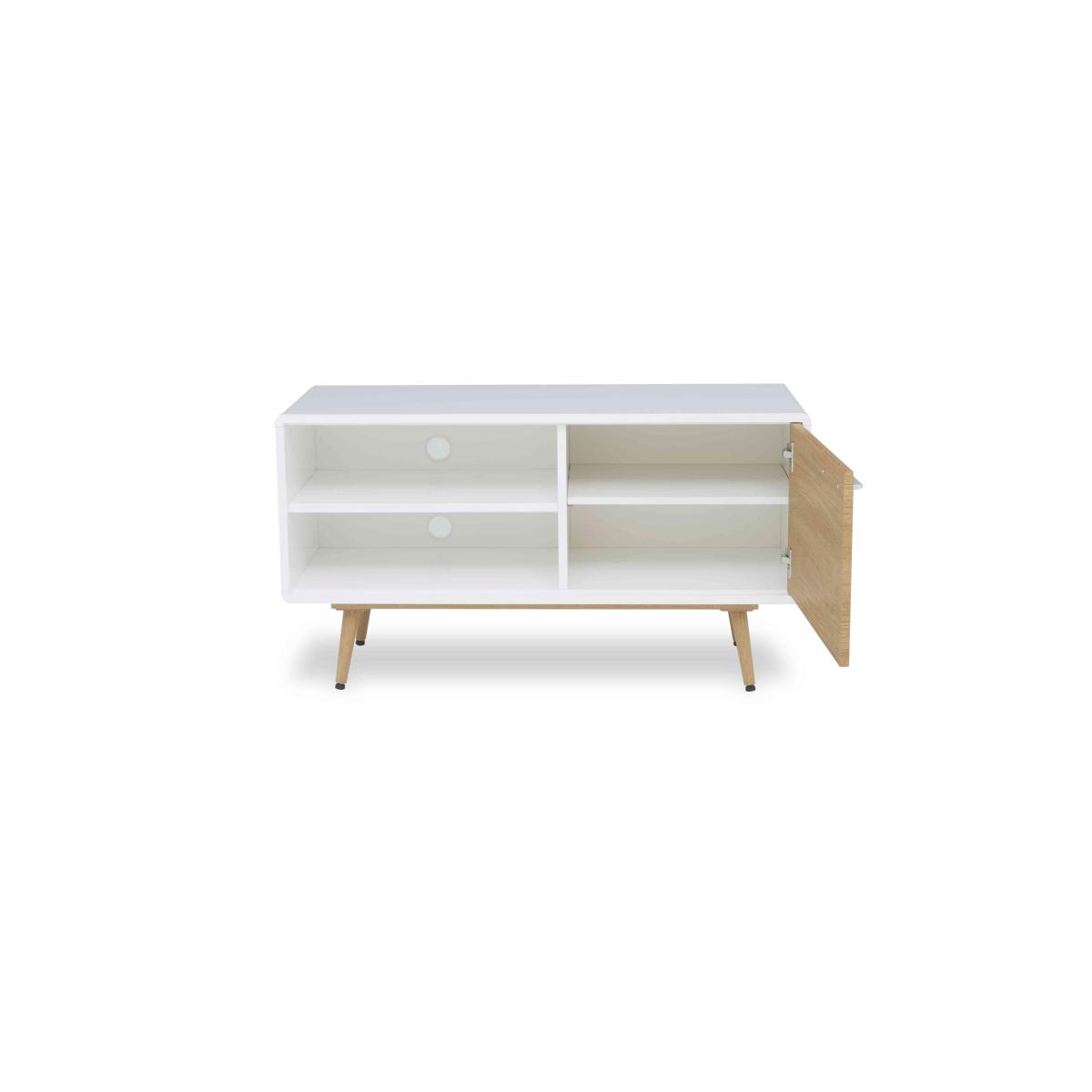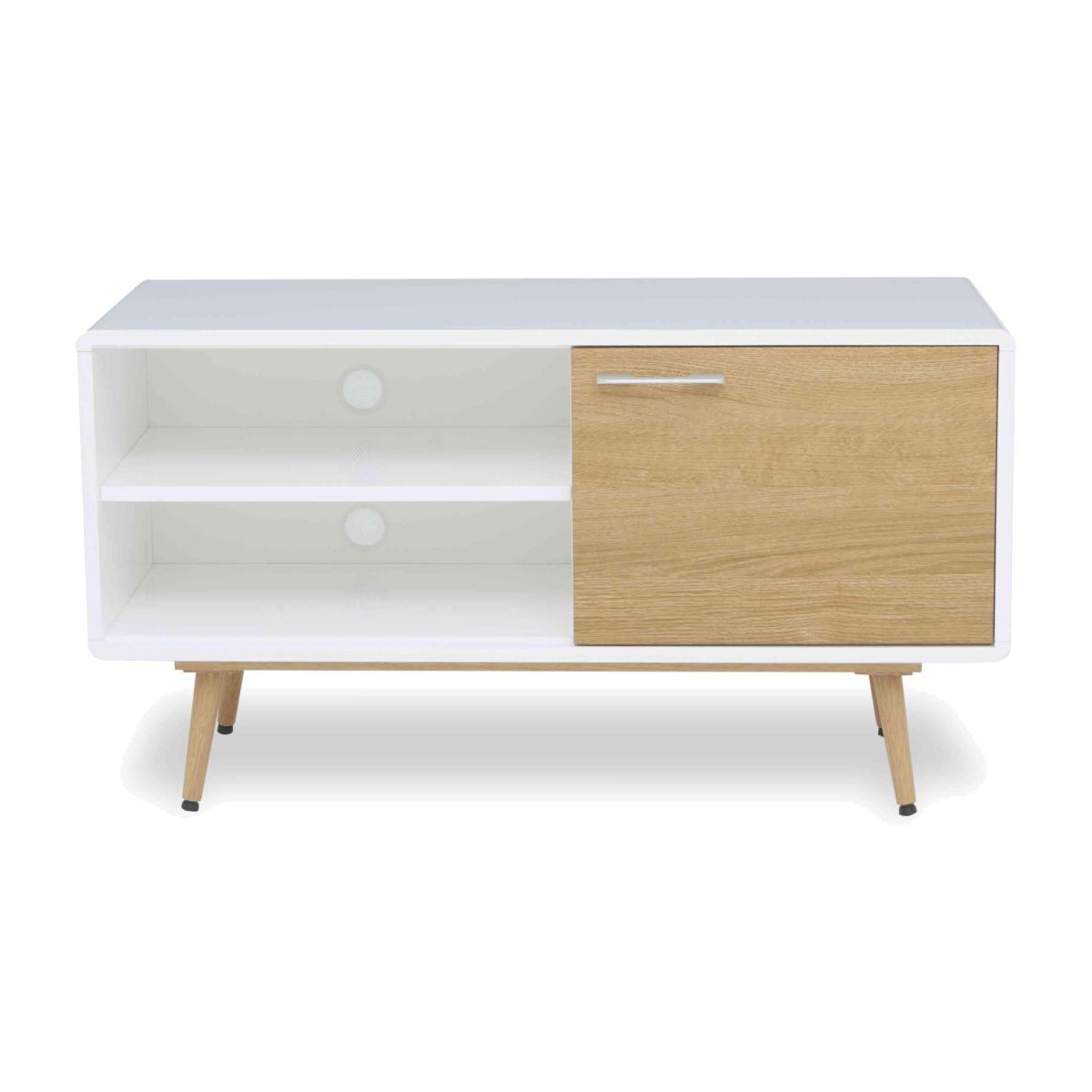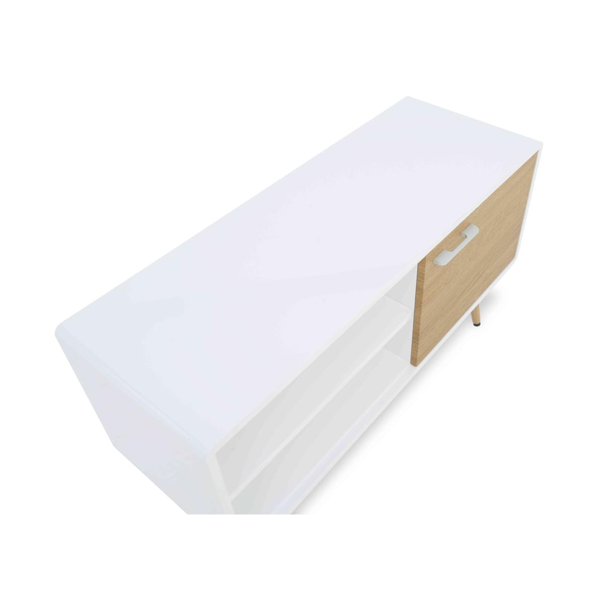Perfectly capturing today’s coastal chic trend – with more than a touch of Scandi style – our Jonah range makes it easy to transform dining rooms and living spaces into havens of magazine-worthy style. This incredibly well-priced furniture collection showcases oak-effect and white high-gloss finishes, and includes two sizes of extending dining table, dining sets and sideboards as well as living room storage pieces and occasional tables. Mix and match to find the perfect combination of contemporary style and practical storage for your home. The Jonah range is a Furniture Village online exclusive. Perfect for a compact contemporary living space, this TV cabinet offers well-designed storage and a chic and stylish look at an amazing price. Online only. Why you'll love it Contemporary coastal style for effortlessly fashionable homes. Exceptional value for money. On-trend glossy white and oak-effect finish with slender angled legs. Superb quality with a sturdy metal frame and legs. 1 cupboard plus alcove with shelf. Cupboard doors are soft closing. A Furniture Village online exclusive. This small TV cabinet is part of the Jonah range. What you need to know Single-door cupboard has 1 fixed shelf. The high-gloss surface may reveal the polishing process in the form of small scratches. Avoid placing in direct sunlight. Do not use abrasive cleaning products. Wipe clean with a damp cloth and dry with soft duster. We recommend using placemats and coasters at all times. Shop the complete Jonah range for dining sets, sideboards, occasional tables and more. WARNING!