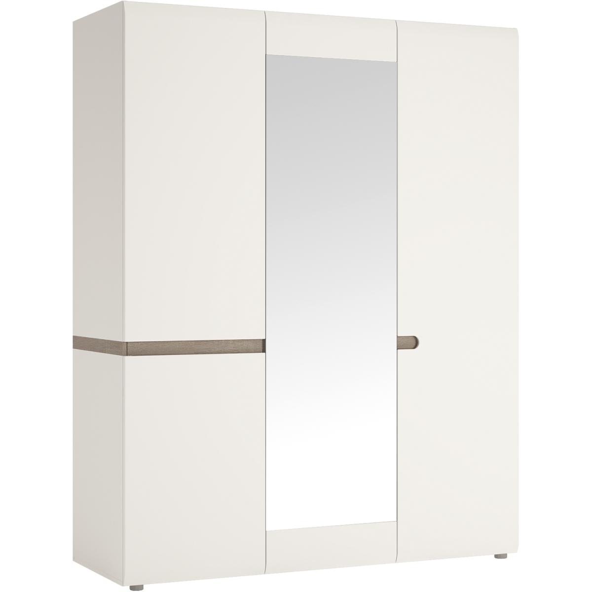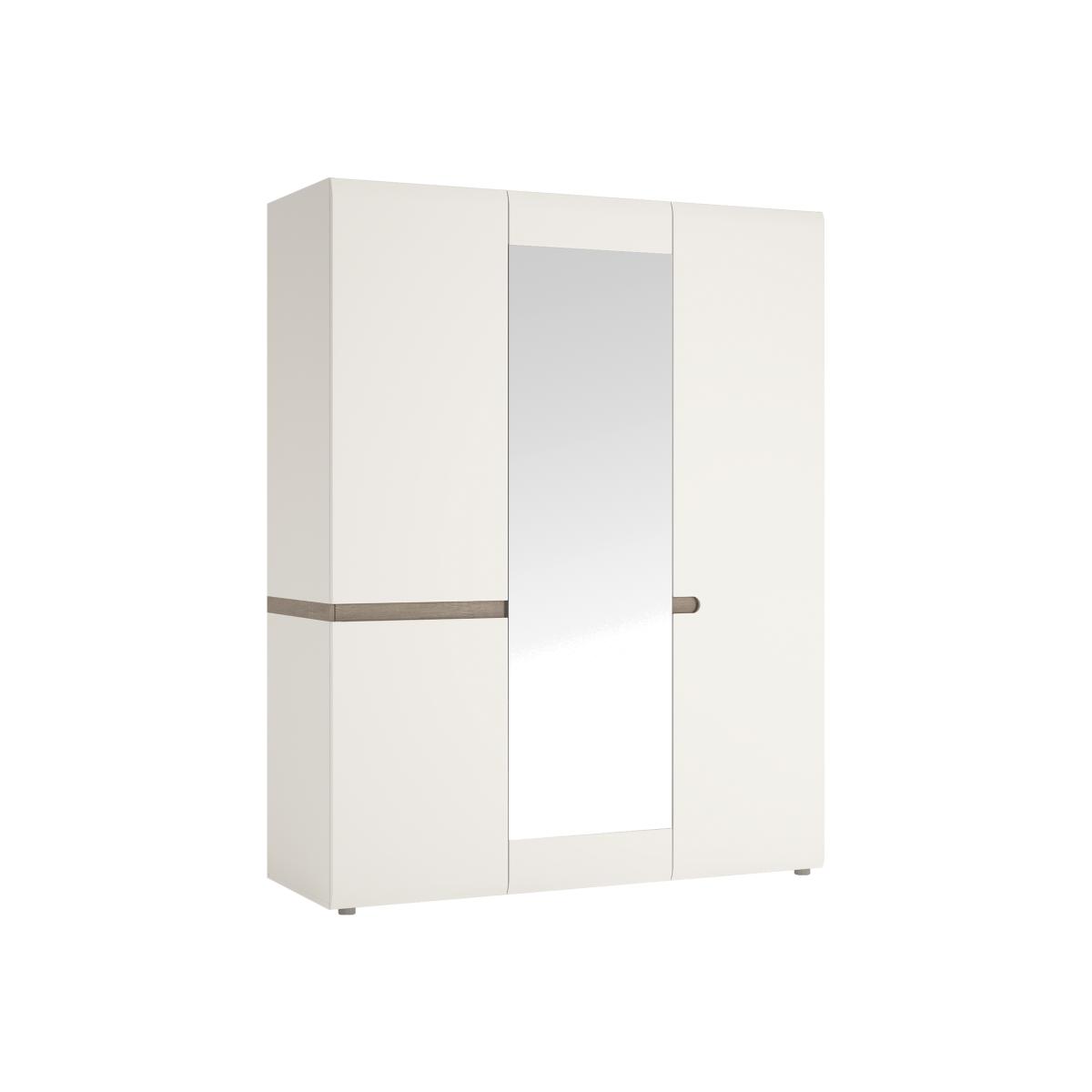 Three-door Wardrobe with mirror in white with a Truffle Oak trim. Unconventional design - a proposal for the followers of the latest trends. The clever mix of scratch resistant white melamine with beautiful high gloss fronts and oak melamine trim makes this top-quality collection of furniture the ideal destination for the most modern of homes, the massive range that includes many cabinets and wall units fulfills every storage and display option.