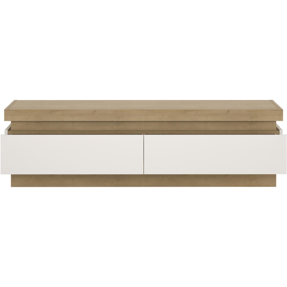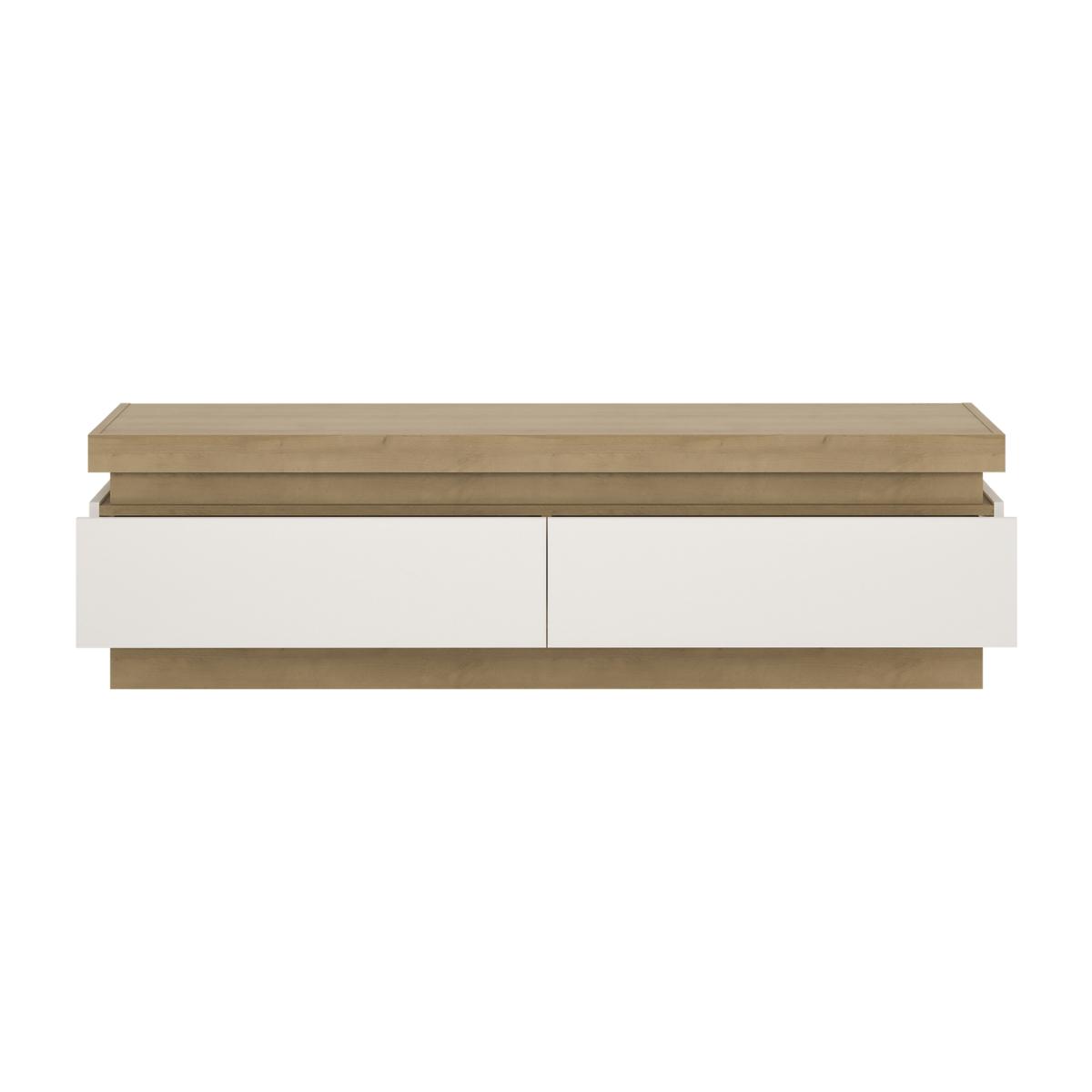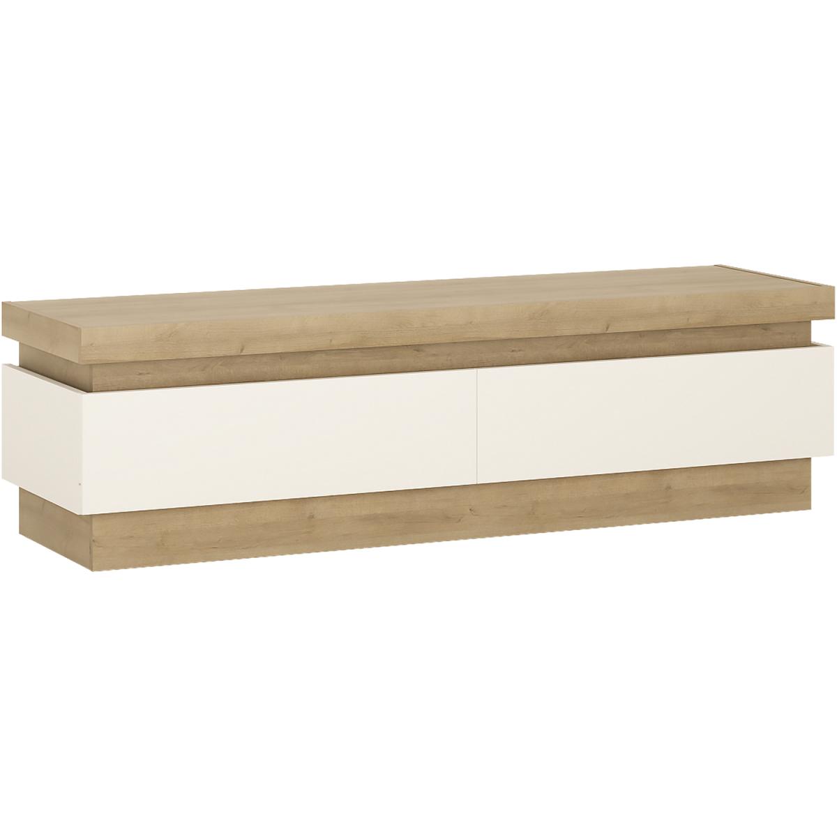 Two-drawer TV cabinet (including LED lighting) in Riviera Oak/White High Gloss. Generous 146cm wide TV cabinet, wide enough to take the latest TVs. Plenty of storage in the easy gliding storage drawers. Includes a concealed lighting arrangement. A high-quality collection in an ultra-modern design - with each item complementing each other.