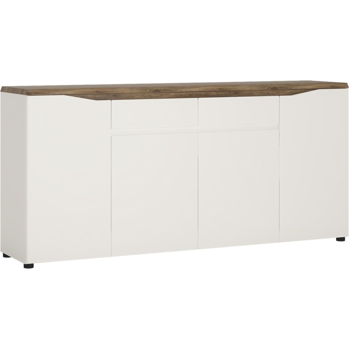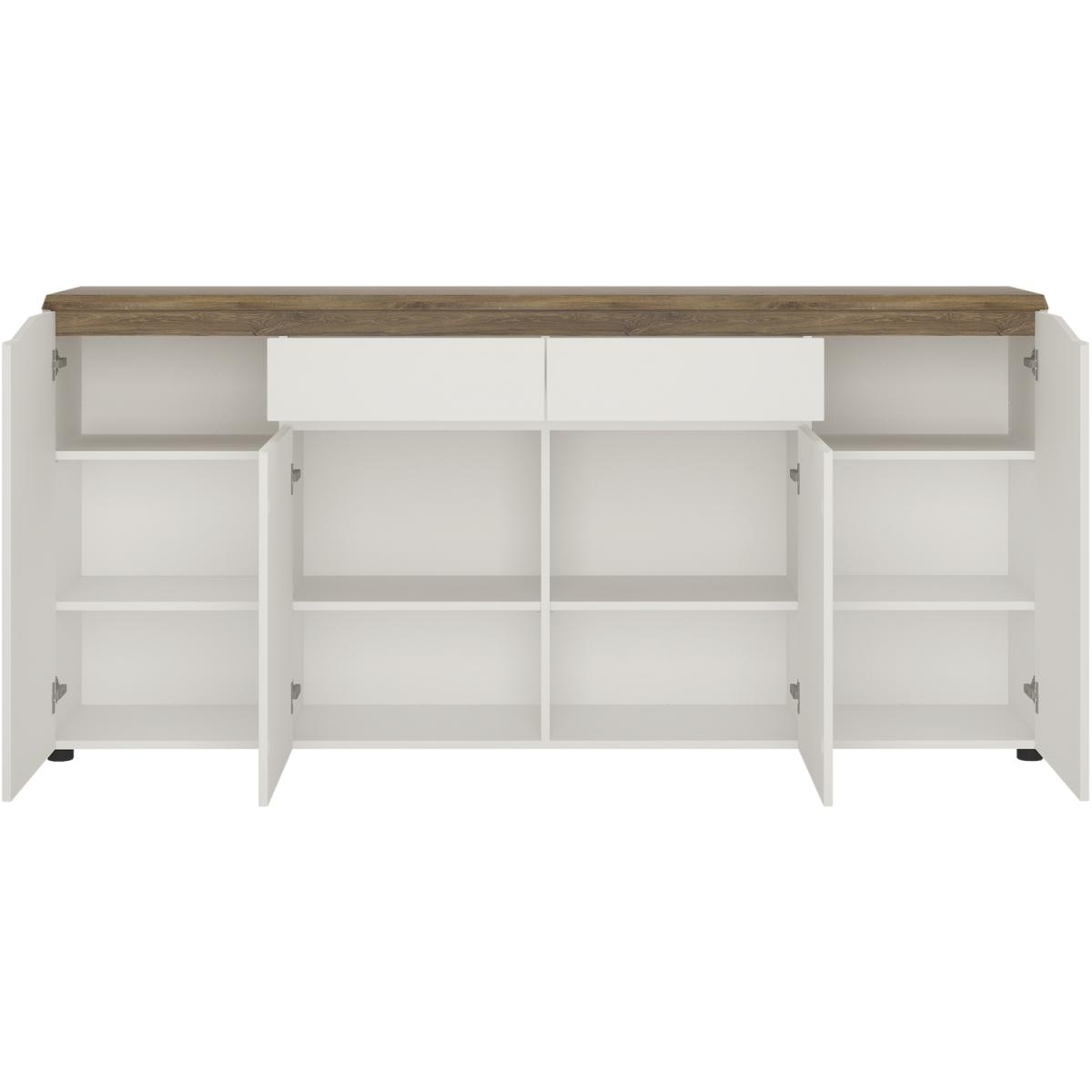 Four-door two drawer sideboard in Alpine White with high gloss fronts and Stirling Oak. Lots of hidden storage space in this modern and large sideboard with 2 drawers, and 4 doors with adjustable internal shelving. This great collection is perfect for lovers of bright and modern interiors, striking and sophisticated.