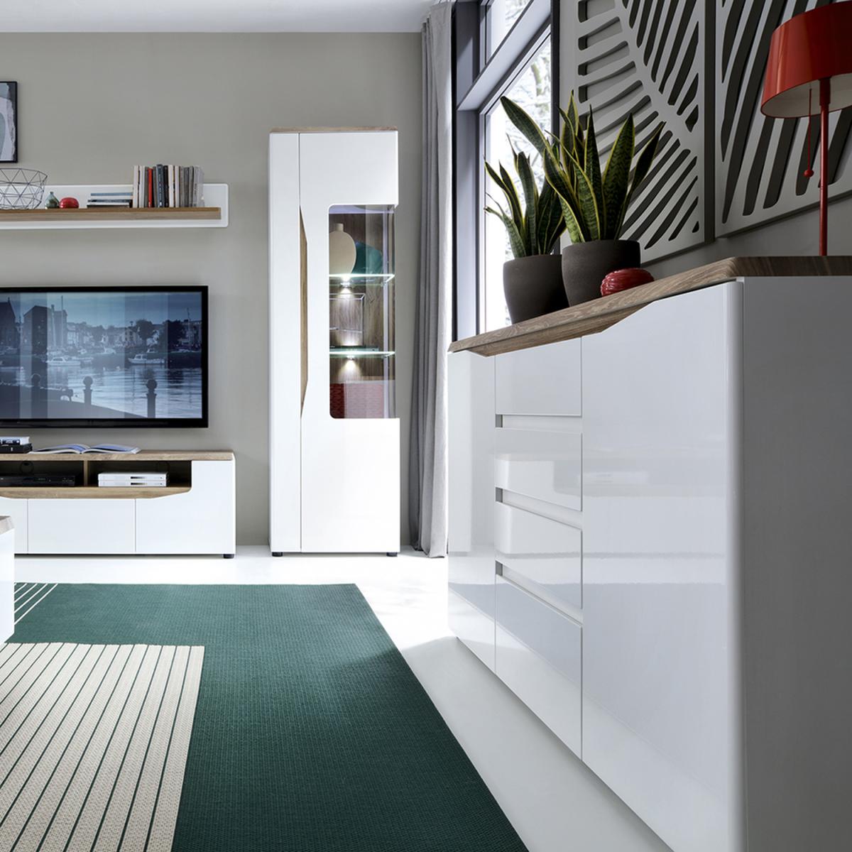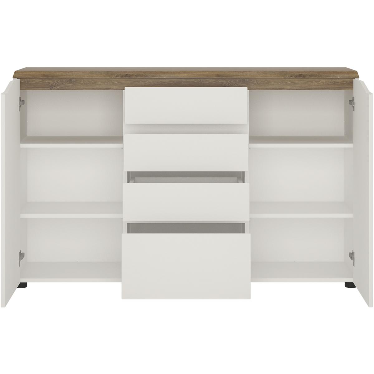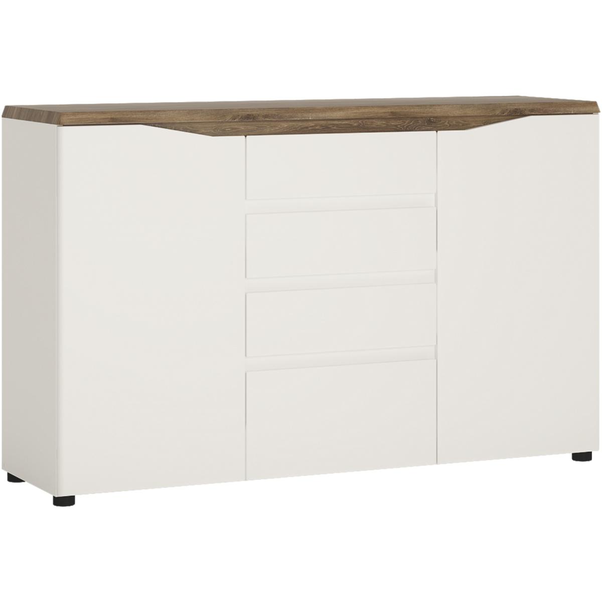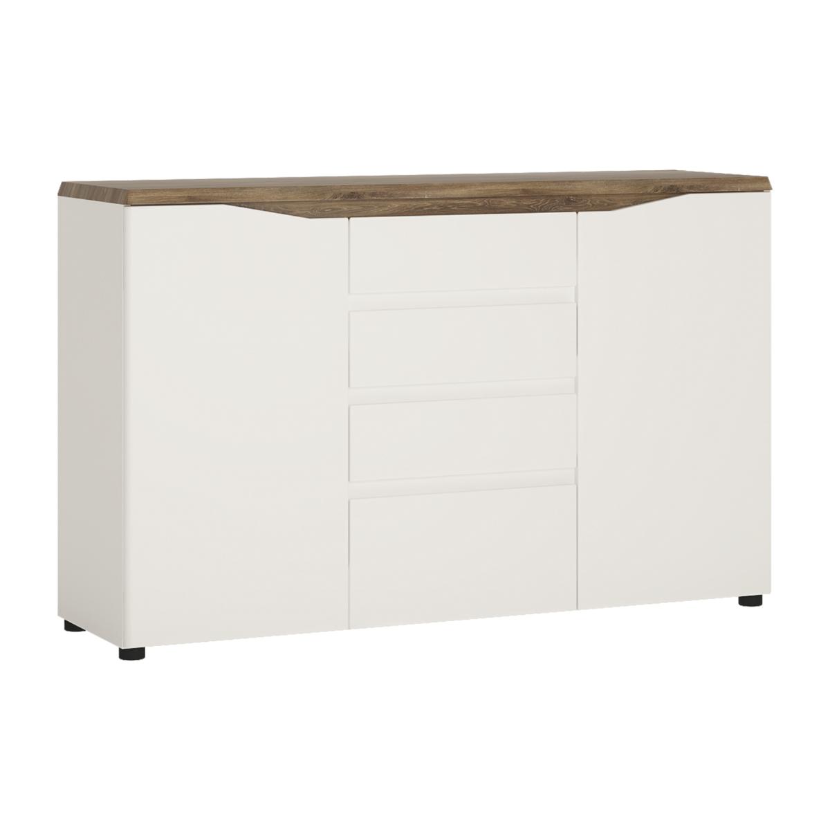 Two-door four drawer sideboard in Alpine White with high gloss fronts and Stirling Oak. Lots of hidden storage space in this modern sideboard with 4 drawers, and 2 doors with adjustable internal shelving. This great collection is perfect for lovers of bright and modern interiors, striking and sophisticated.