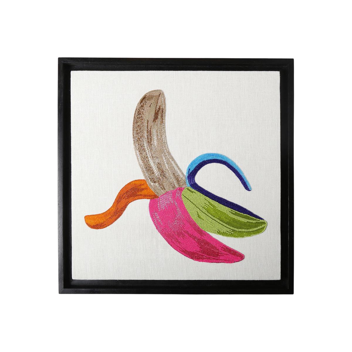 Jonathan Adler's signature banana design has been reimagined in full beaded brilliance. Made in collaboration with an artisanal workshop in India, it's been expertly crafted by a master beader, taking nearly 100 hours to create from start to finish. Beads of varying heights and patterns create a sense of depth and dimensions, resulting in a truly remarkable piece of art for your modern home. Key features: * Wall art * Material: linen, glass beads * Dimensions: 61x61cm * Colourful banana design with dazzling details * Made in collaboration with an artisanal workshop in India * Hand-beaded on linen * Beads of varying heights create a sense of depth & dimension * Textured wood frame with black stain finish * Takes nearly 100 hours to create * More decorative accessories available from Jonathan Adler