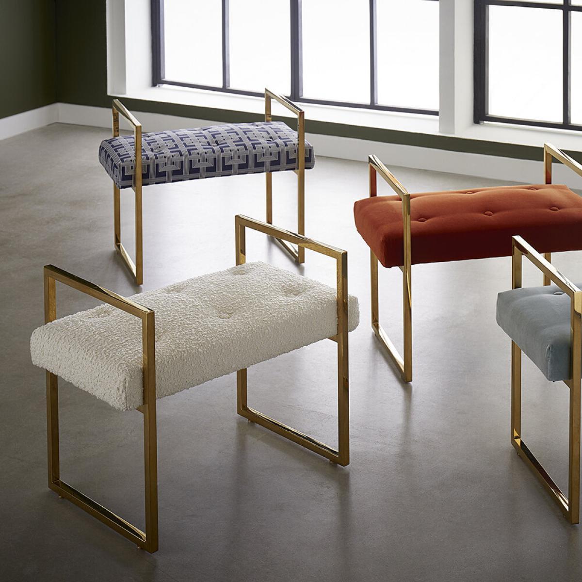 I love this bench for its clean, modern lines combined with a touch of luxe thanks to the metallic frame. It works particularly well in contemporary and minimalist interiors, providing a stylish yet functional addition to entryways, bedrooms, or living spaces. To style it effectively, consider layering a throw or stacking a couple of cushions on top for added comfort and visual interest. It's also versatile enough to be used at the foot of a bed or as extra seating in a living room, especially when paired with textured rugs or contrasting colours in surrounding furnishings. This piece offers a sleek, sophisticated look that balances form and function effortlessly.