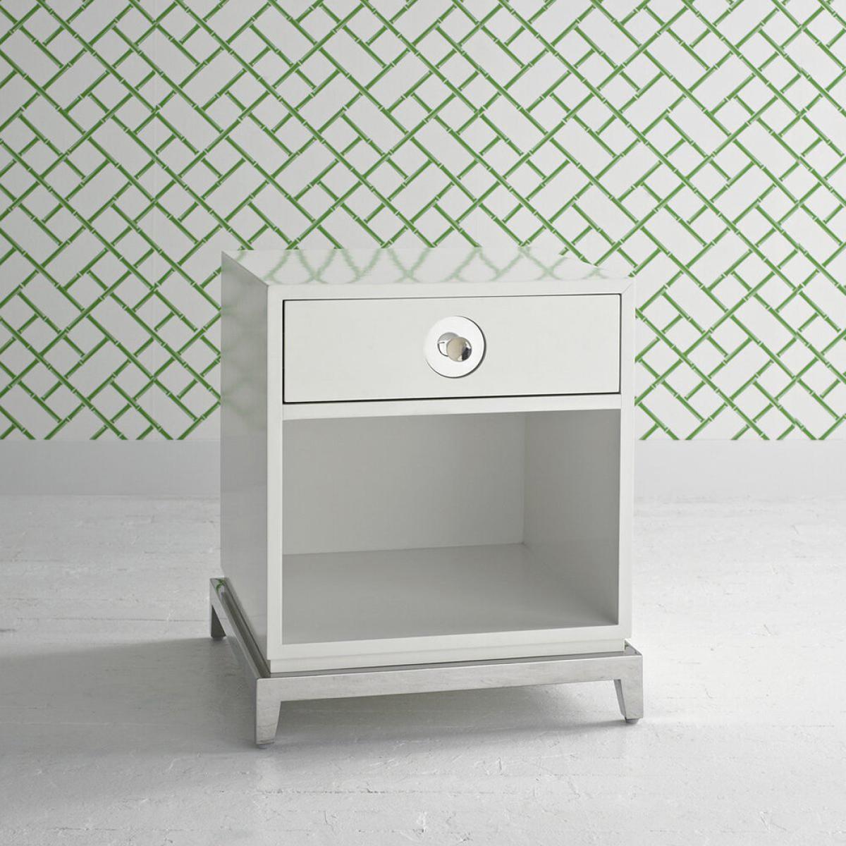 Inject a dash of Hollywood glamour into your home with this Channing end table from Jonathan Adler. Featuring one self-closing draw with a polished nickel pull and base, this matte white table is perfect for placing beside your bed or next to your sofa.
