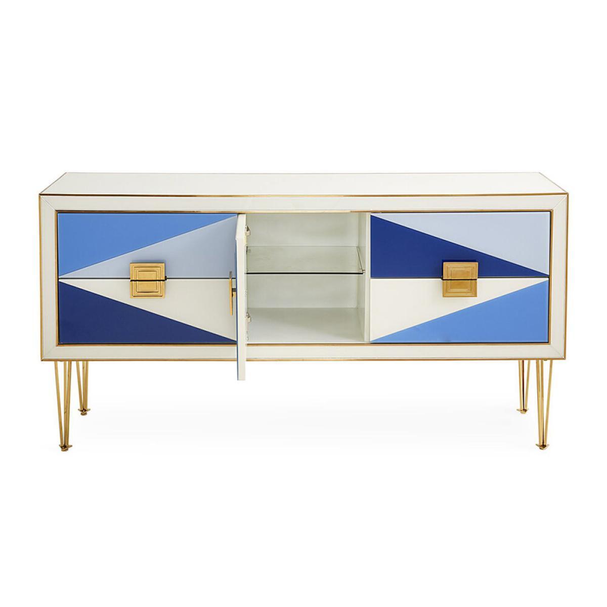 Bring sophisticated storage into your home with this Harlequin credenza from Jonathan Adler. Featuring an array of back-painted glass panes, it is finished with brass pulls that reveal a chic ivory interior. Complete with one centre cabinet and four draws either side, this stunning cabinet is as practical as it is stylish. Key features: * Material: glass, brass * Dimensions: H77xW152xD40.5cm * Features back-painted glass panes * In brilliant blue tones * Ivory interior * Polished brass pulls and legs * One centre cabinet with an adjustable shelf * And four draws either side * Wipe clean with a soft dry cloth
