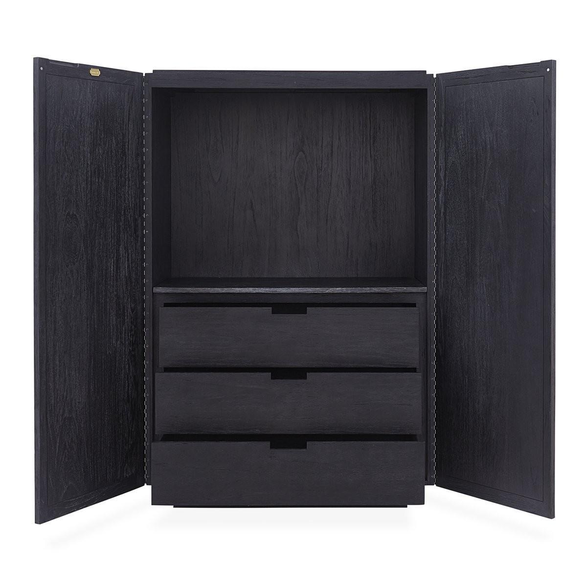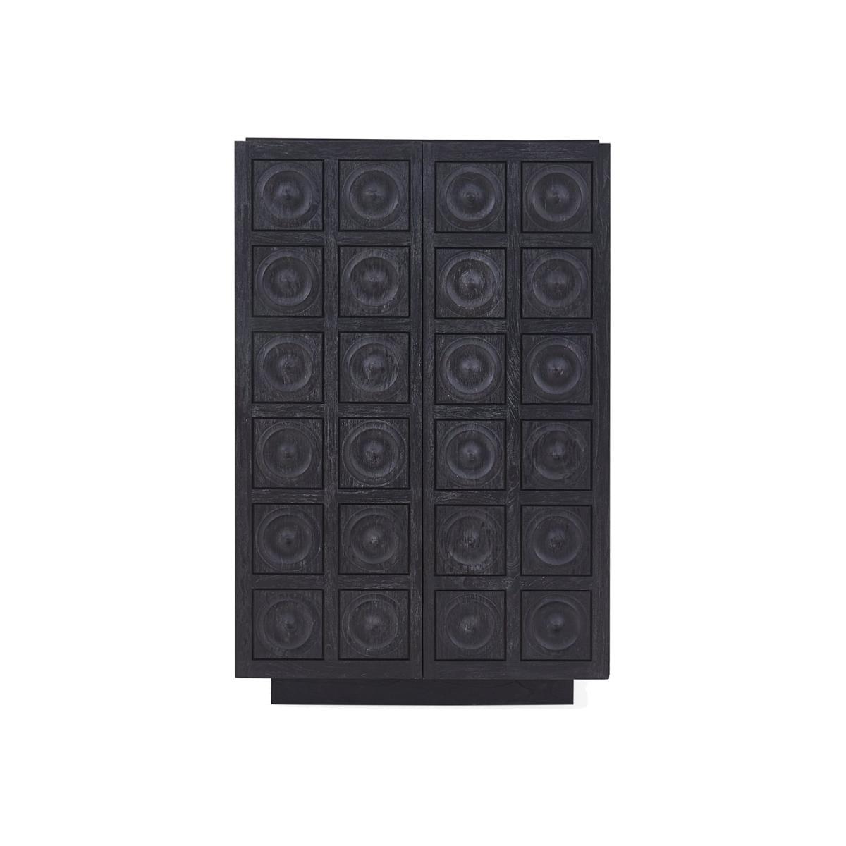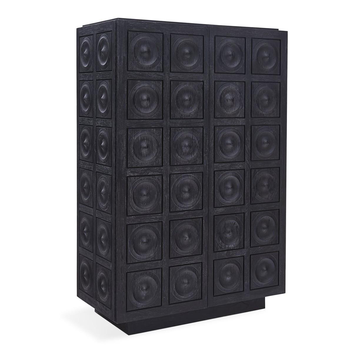 Limed Luxury. An ebonized and limed mindi wood cabinet faced with solid mindi circle tiles. Featuring hidden pulls and an interior fitted with three self-closing drawers and an adjustable shelf. Familiar but fresh, our Antwerp Circles Cabinet is the kind of piece you fantasise about stumbling upon at Paris' Marché aux Puces. Think French '50s limed furniture reimagined for the 21st century. Hardworking, chic, and durable, it's a sublime addition to your entryway or dining room.