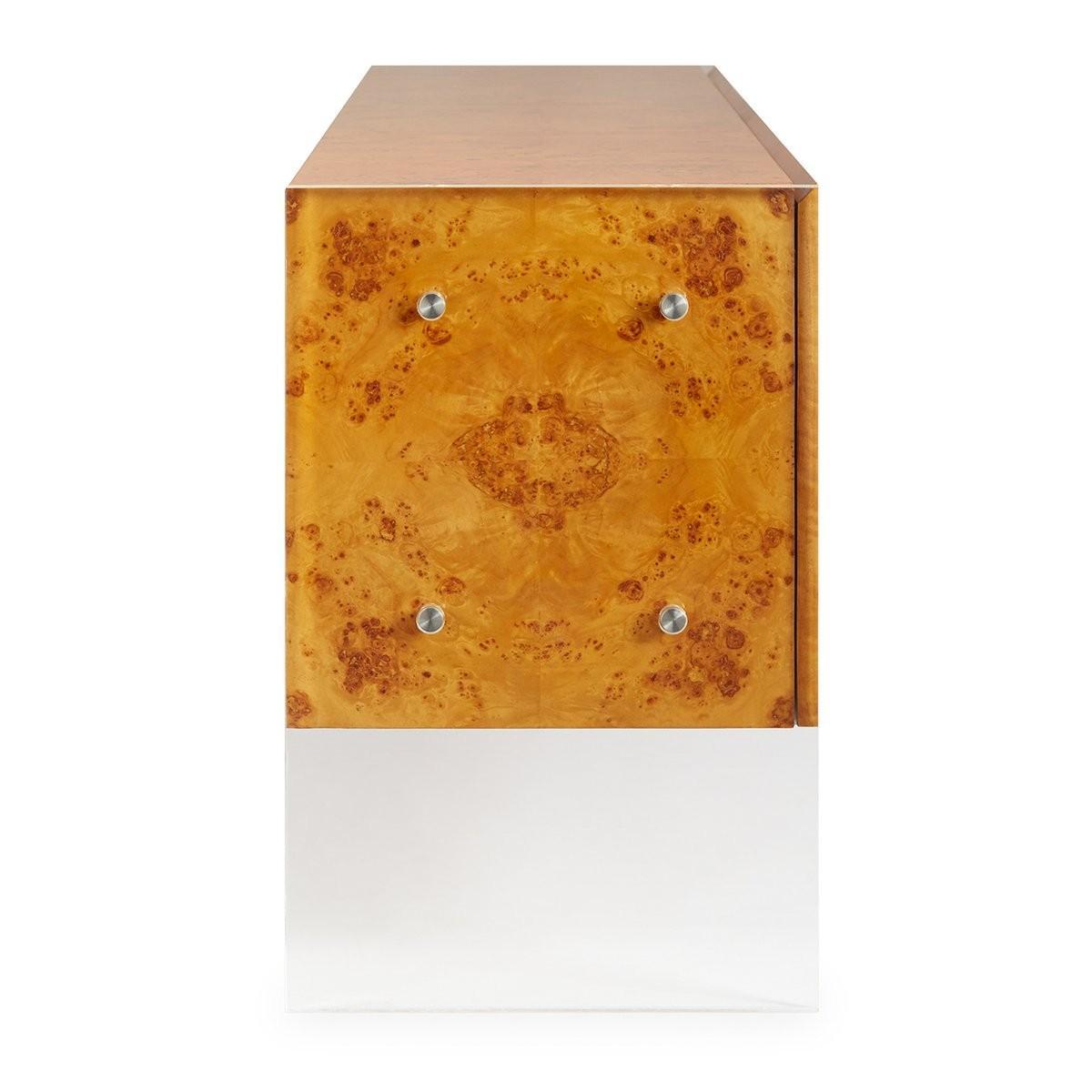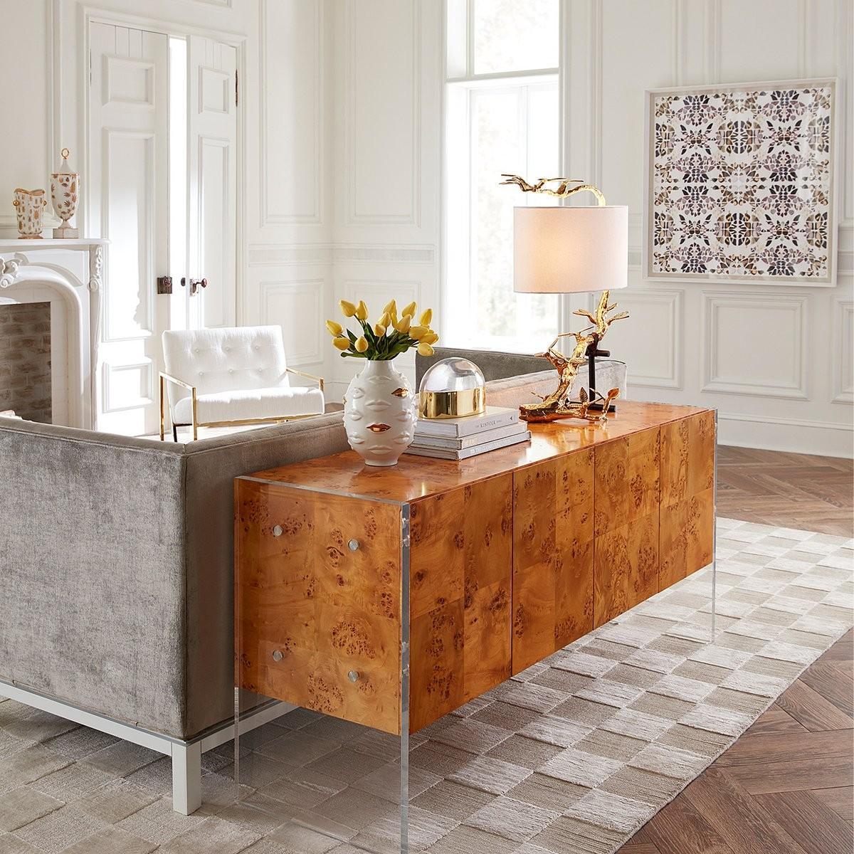Timelessly Chic. A Minimalist world of burled wood, acrylic panels, and stainless steel. Pieced, burled mappa wood floats between acrylic legs with stainless steel accents. Pieced veneer cabinet faces showcase naturally occurring patterns in the wood, and an adjustable shelf inside provides posh storage. With a fully finished back, this is a fab piece to float in the middle of the room. Available in natural for an organic and worldly vibe, or moody and masculine charcoal for high drama.