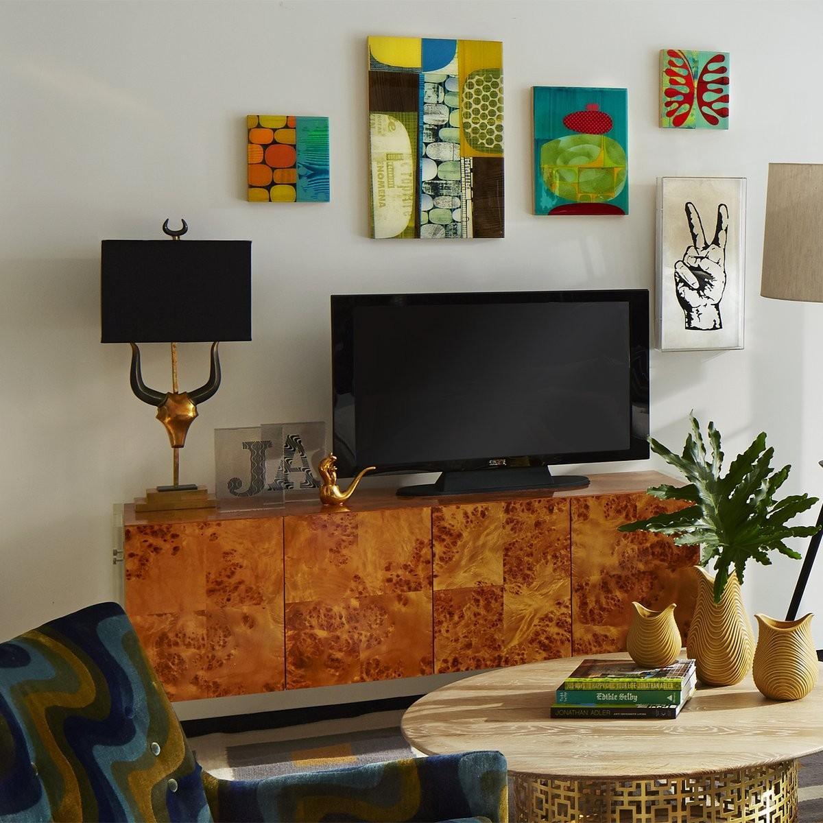 The Jonny Adler sideboard is a fantastic statement piece that easily elevates both modern and eclectic interiors. Its bold, wood veneer finish adds warmth and visual interest, making it particularly well-suited for living rooms, dining areas, or even a stylish hallway. I love styling it with a mix of contemporary ceramics, vintage books, or colourful accessories to create a balanced look. For practicality, it’s best to keep the top surface relatively clear - a lamp, a few statement pieces, or a decorative tray work well - while utilising the interior storage for tableware or everyday essentials. Its clean lines and standout finish make it versatile, helping to anchor a space without overwhelming it.