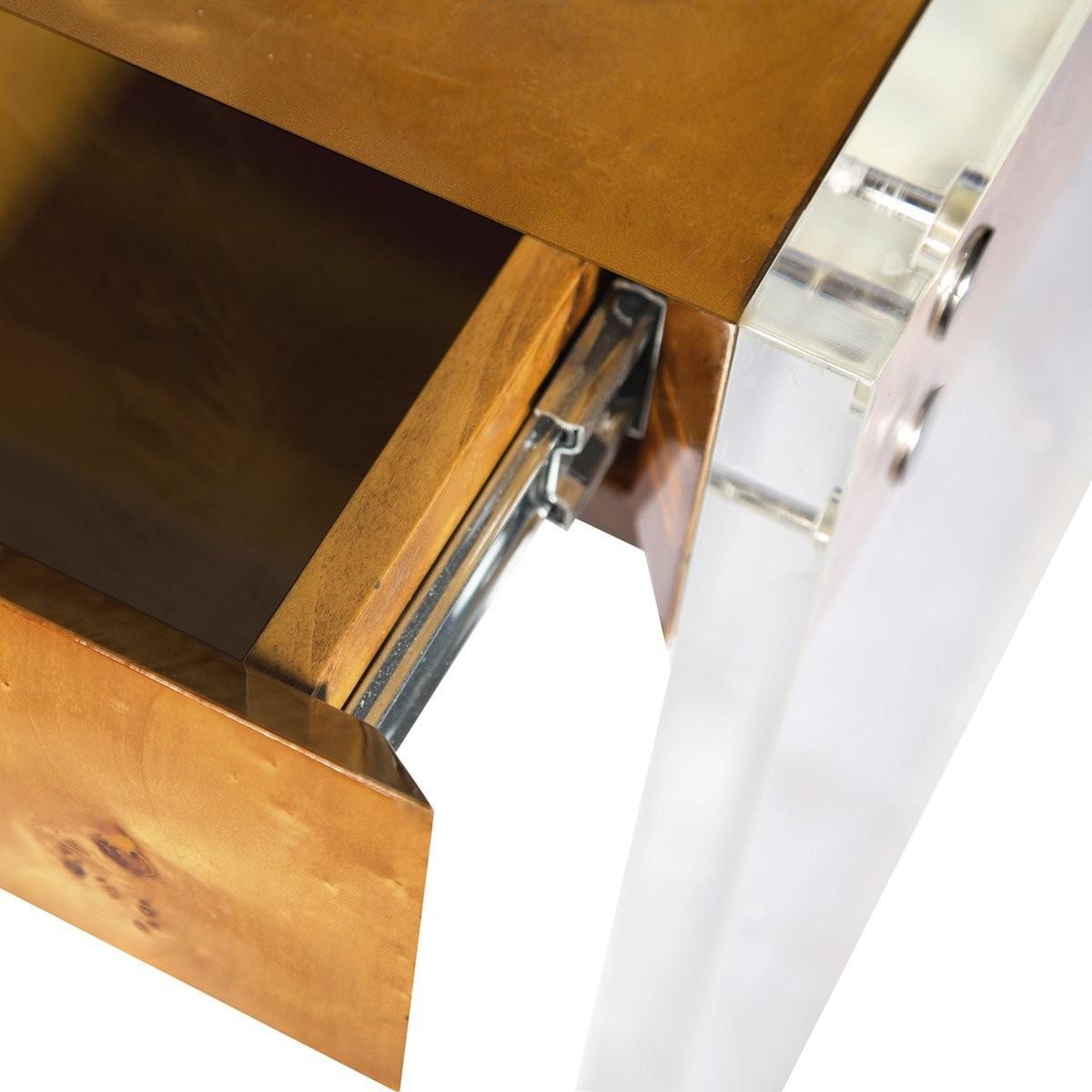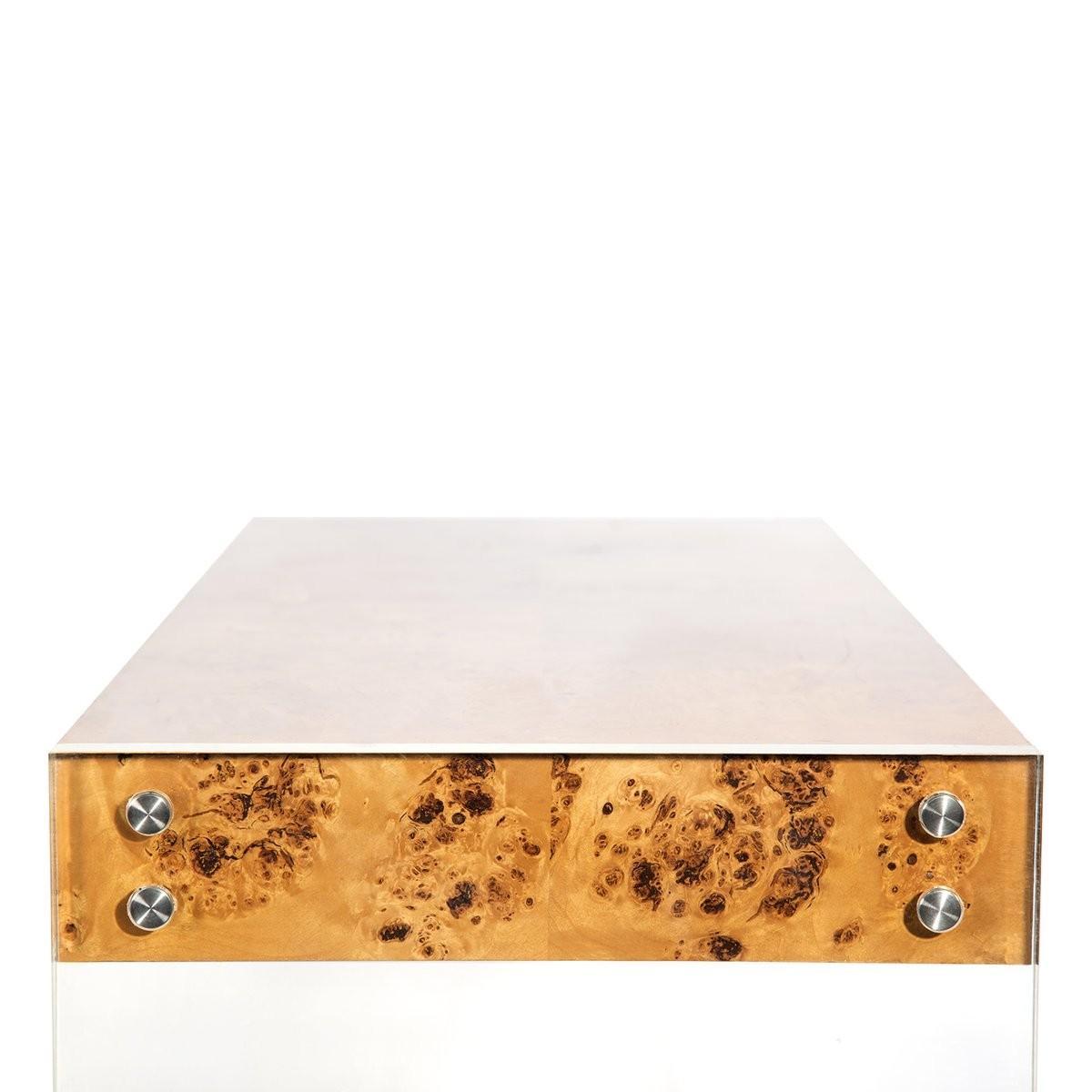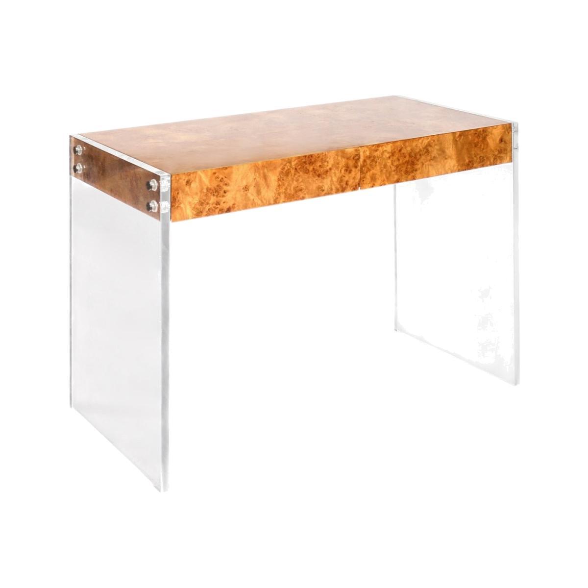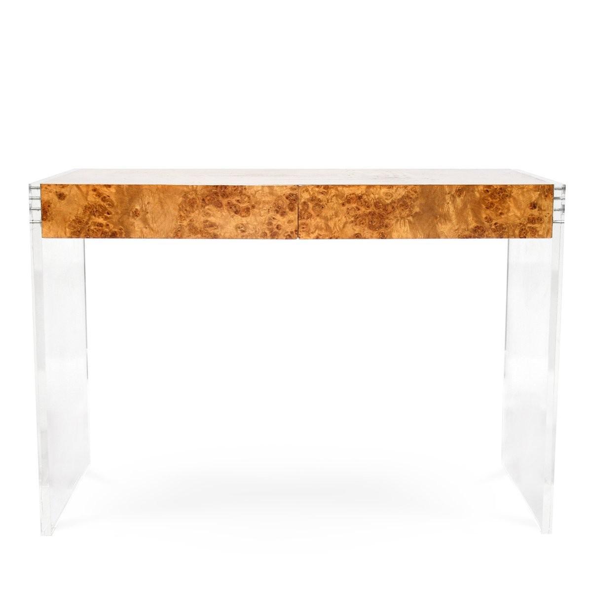 Timelessly Chic. From our chic burled wood collection—pieced mappa wood floats between clear acrylic legs with stainless steel accents. Fully finished drawers with hidden pulls create a clean silhouette that's fierce from any angle. Work its minimalist magic as a small desk or stylish console.