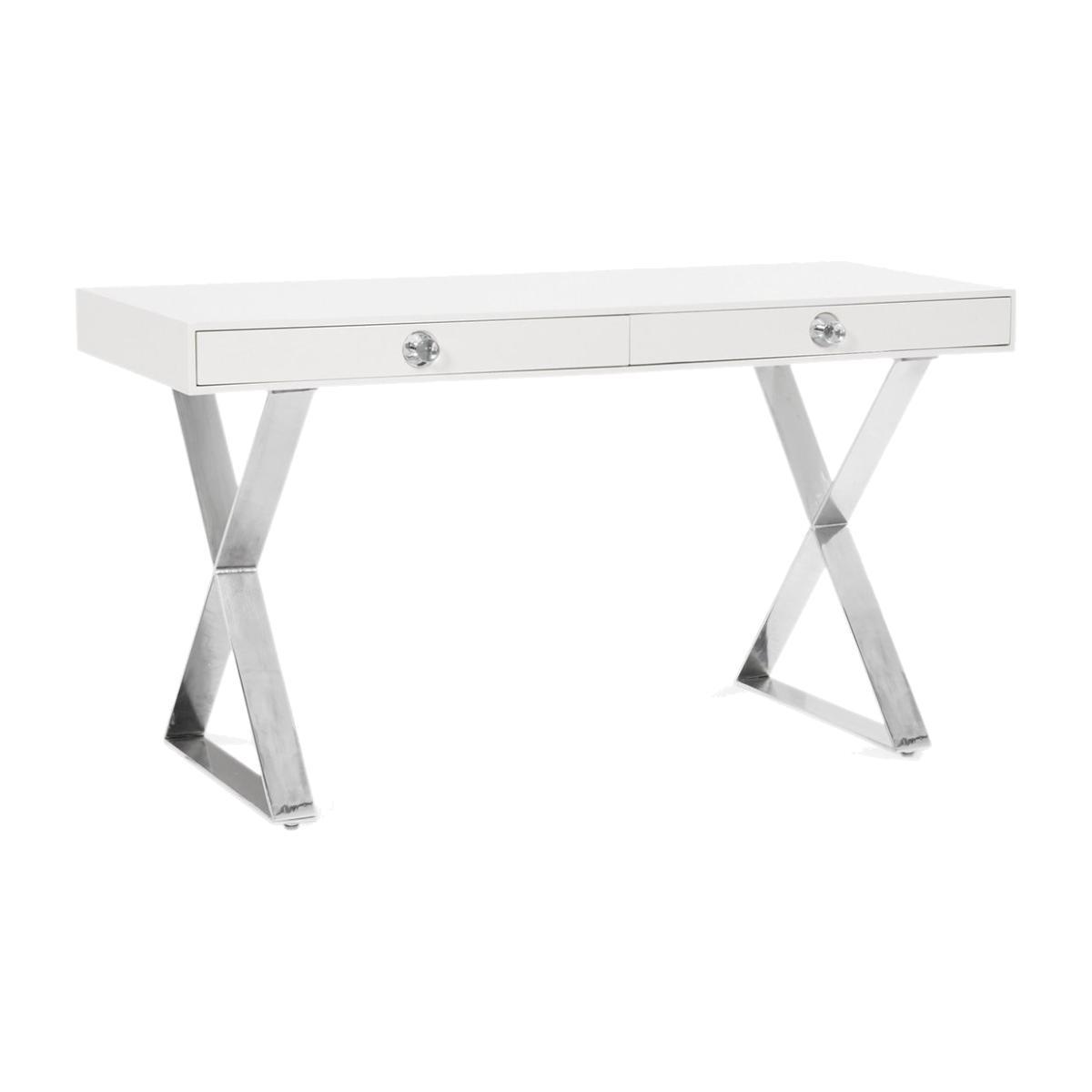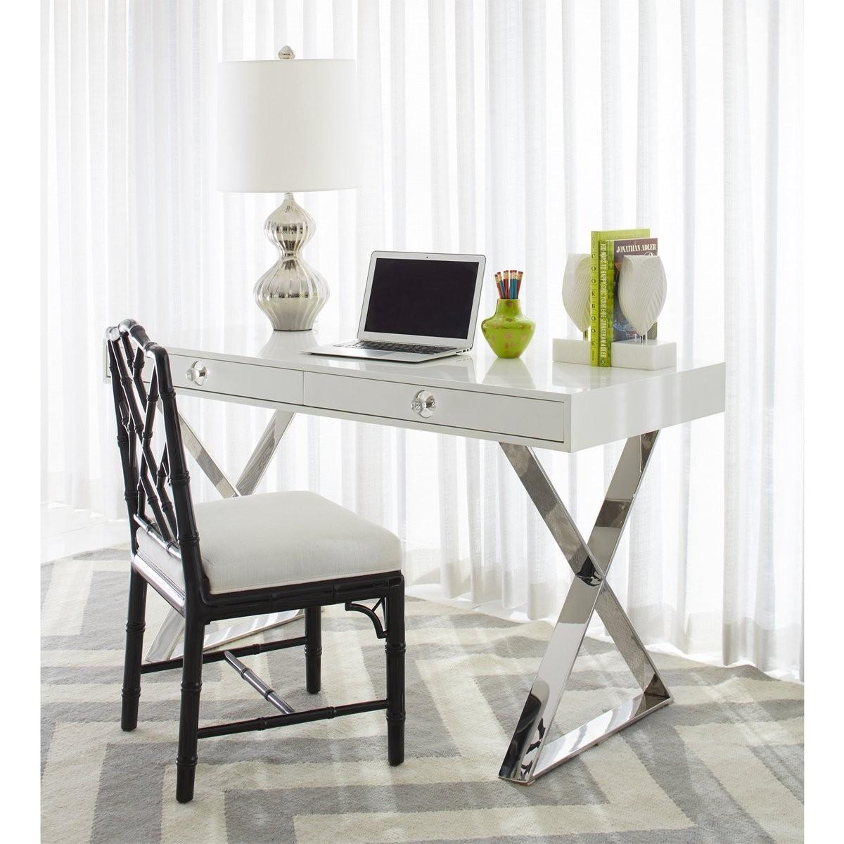 Luxe Lacquer. Neo-Classical lines, a dash of Hollywood glamour, and a top note of Mod moxie: that's our Channing collection. The Channing Desk puts a svelte spin on classic campaign style. The name says it all: a reference to Margo Channing, Bette Davis's character in All About Eve. Crisscrossed polished nickel legs, and oversized Lucite knobs ooze cinematic glamour, making this an ideal vanity or the perfect spot to pen your next great romance. The sleek silhouette is fabulous for a small space.