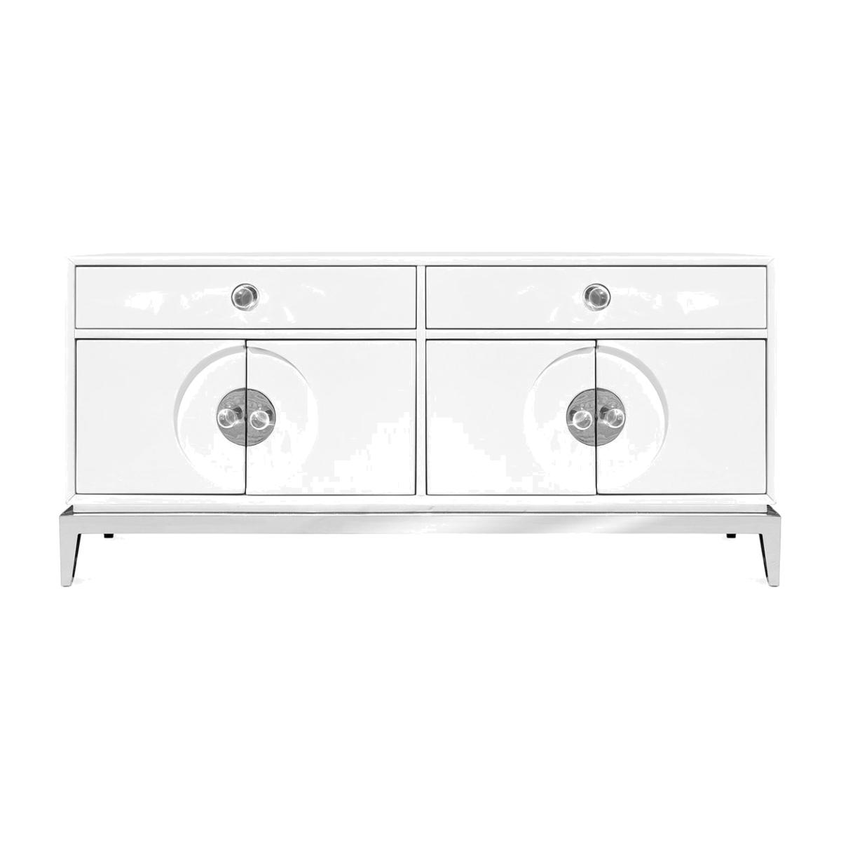 Luxe Lacquer. Neo-Classical lines a dash of Hollywood glamour and a top note of Mod moxie: that's our Channing Collection. Our lacquered media console is designed to tidily stow all of your entertainment essentials with slim flip-front drawers. The double doors—decorated with demilune estucheons polished accents and oversized acrylic knobs—open to reveal adjustable shelves for customizable storage. Cutouts at the back hide unsightly cords and preserve the piece's sleek and shiny silhouette.
