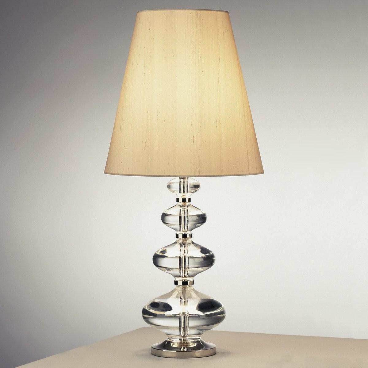 Crystal Clear. The Claridge Collection: lead crystal with polished nickel accents and oyster or black silk dupioni shades.
