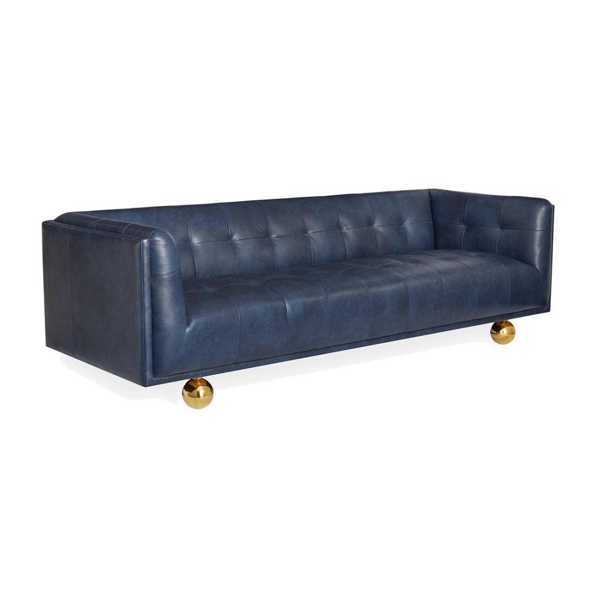21st Century Comfort. Our spin on the classic Chesterfield. We took the original profile—clubby comfort, tailored tufting—and made it modern with a pared down silhouette. The finishing touch: oversized (and ultra-glam) brass orbs in place of traditional wooden bun feet. The perfect balance of formal and fresh, its loungey depth and neutral colourways (fresh stone, moody navy, or a faded blue velvet) make it a must-have for any abode.