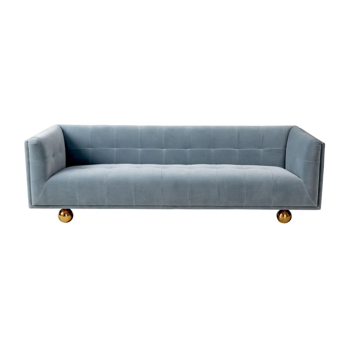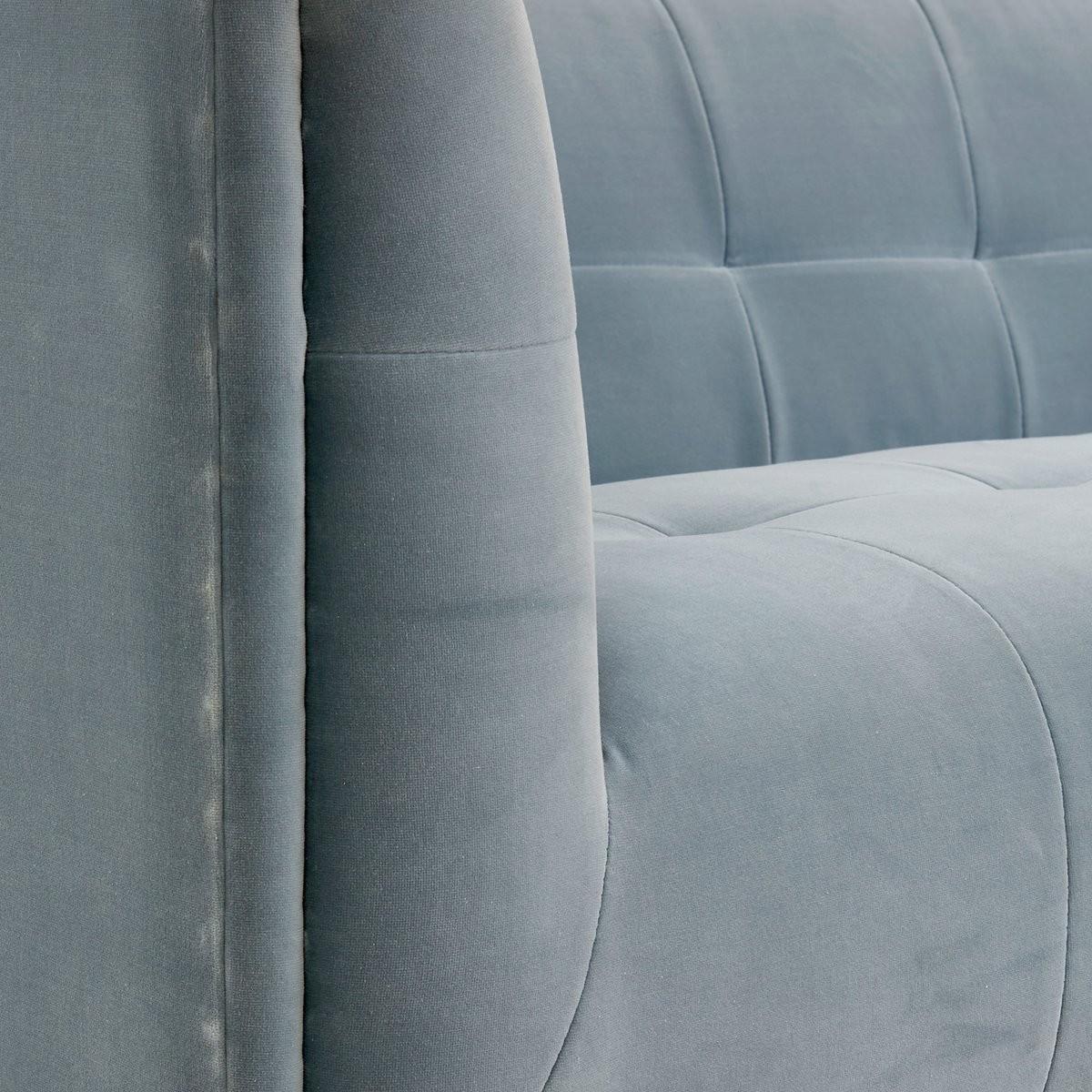 21st Century Comfort. Our spin on the classic Chesterfield. We took the original profile—clubby comfort, tailored tufting—and made it modern with a pared down silhouette. The finishing touch: oversized (and ultra-glam) brass orbs in place of traditional wooden bun feet. The perfect balance of formal and fresh, its loungey depth and neutral colourways (fresh stone, moody navy, or a faded blue velvet) make it a must-have for any abode.
