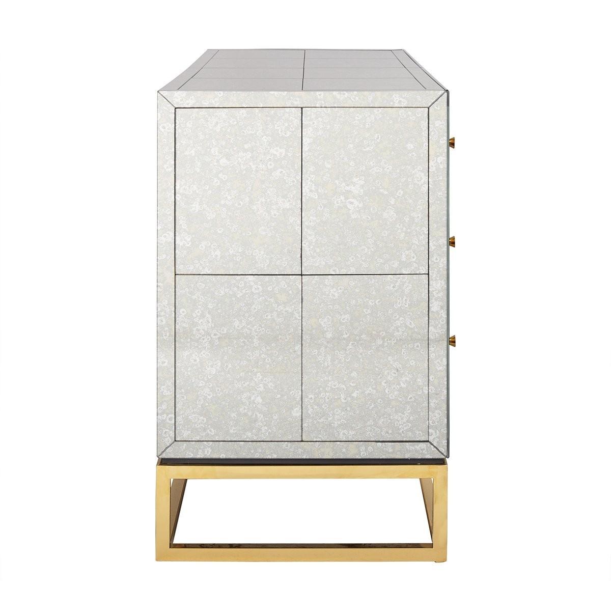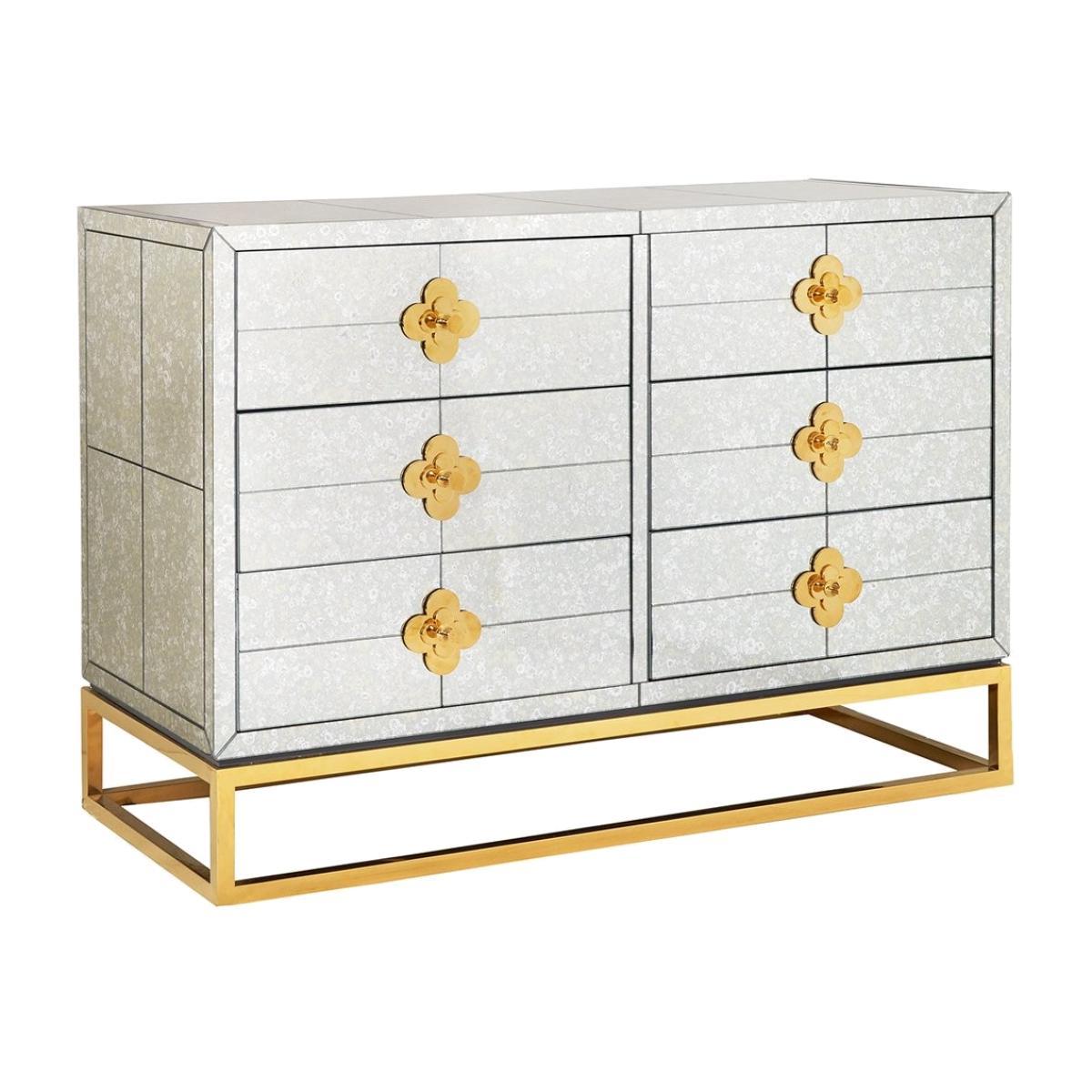 Reflectology. Minimalist forms meet Maximalist glamour. Our Delphine Six-Drawer Dresser features antiqued mirror with a polished brass base and jewel-like quatrefoil escutcheons. Each drawer opens to reveal a bright robin's egg blue interior. Perfect in a starlet's sweeping entryway or as a bold finish for the modern boudoir.