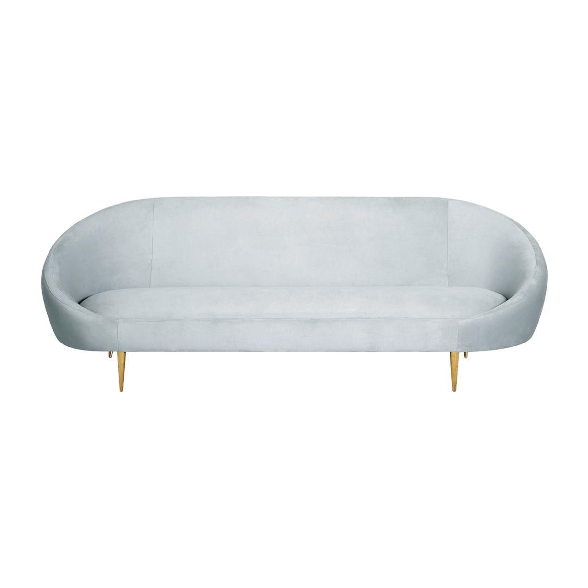 Heaven Sent. Low, loungey, and incredibly comfortable, our Ether Sofa has a simple genesis story: JA wanted to create a sofa that looks and feels like heaven. The lozenge-like silhouette is enveloping and inviting, while gleaming brass stiletto legs add lift and polish fit for a formal parlour. Ethereal yet edgy, it's elegant enough for a chic sitting room, but cozy enough to be your favourite spot to binge-watch. Striated icy velvet glows with dreamy hints of silver and blue, or float on a fresh finish with cloud-hued woven upholstery.