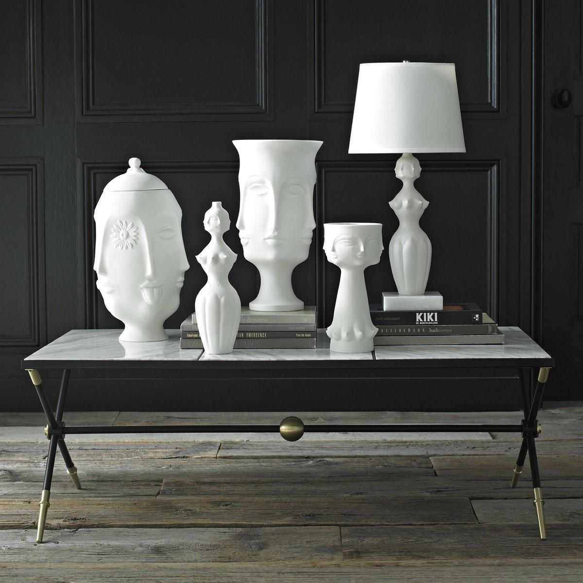 Give Good Face. Our lidded Frida Vase has the same surreal spirit as did our muse Frida herself. Each side of the vase holds a different expression and enticing emotion. Hand-cast from white porcelain, it is an absolute conversation starter sure make an impression. Jonathan throws the models for the Muse vessels and then substitutes our signature geometric relief patterns with body parts—faces, breasts, lips—to create a surreal style. Each piece is made from unglazed matte porcelain to accentuate the forms and is inspired by our favourite artists' muses.
